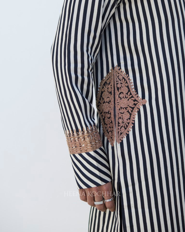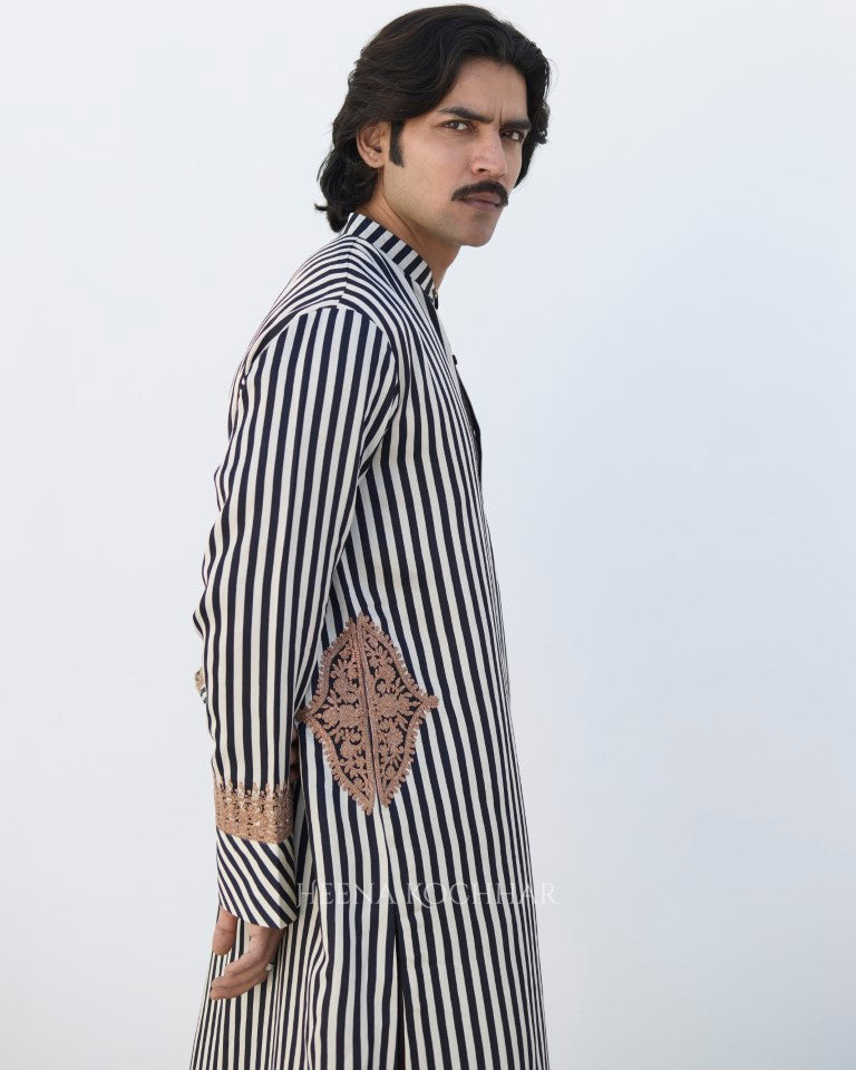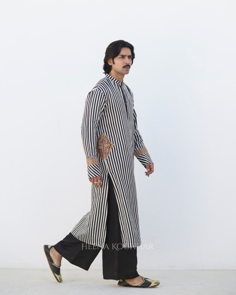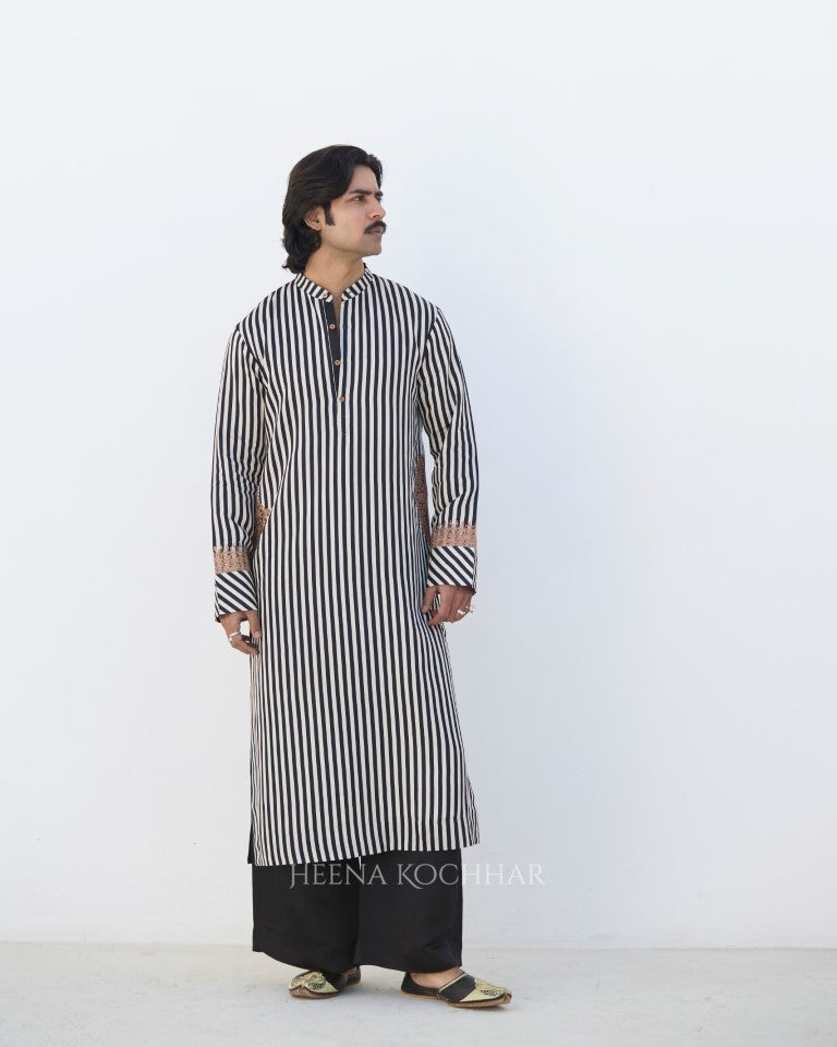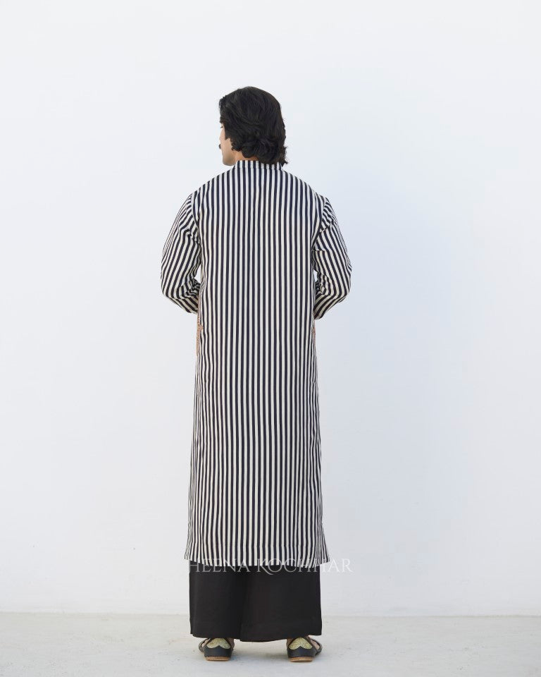 Kurta- Black And White Stripe Silk Linen Kurta