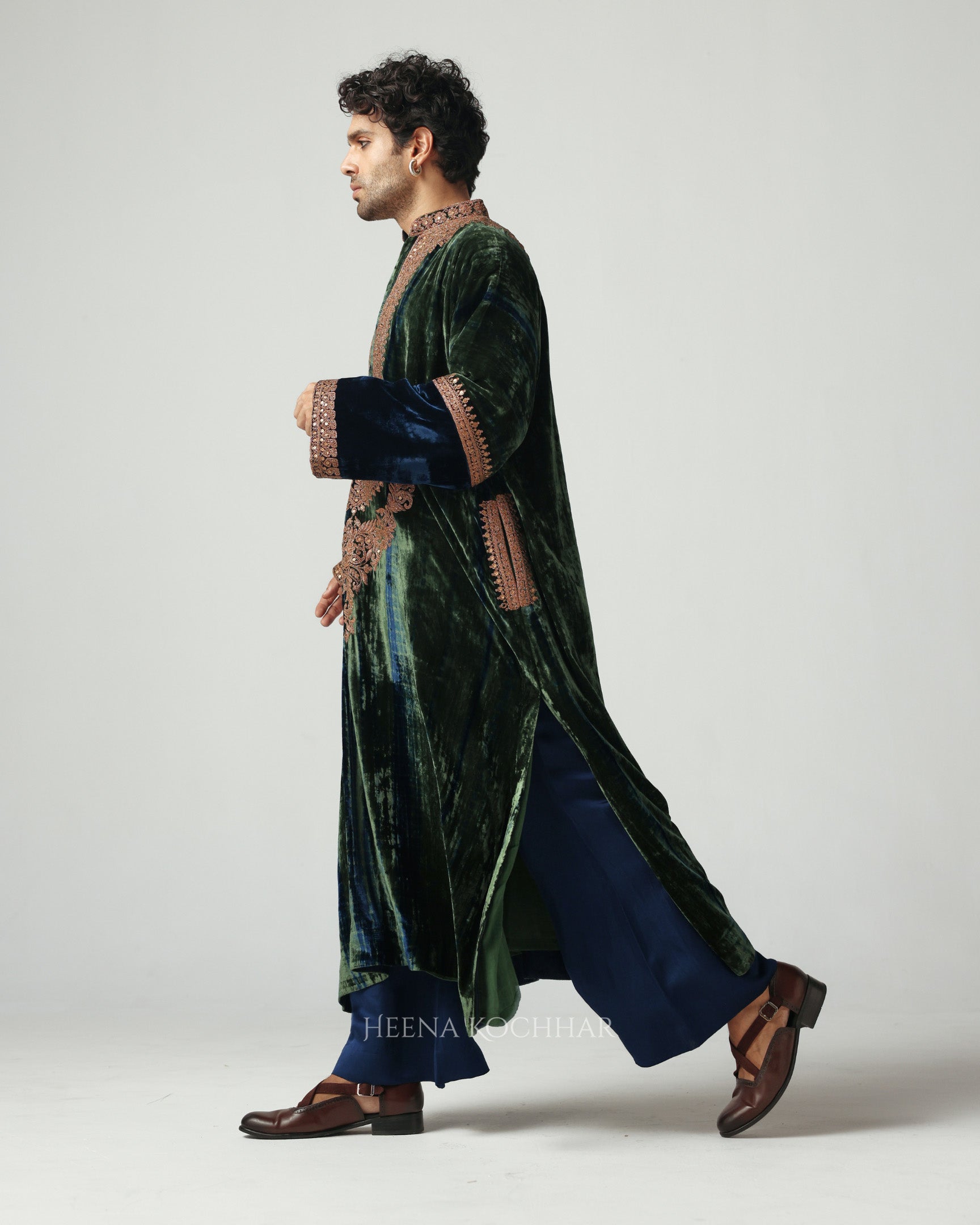 This green and blue tie-dye velvet choga stands out for its subtle elegance and rich tonal play. The surface is detailed with dori and sitara embroidery, adding a gentle shimmer that enhances the festive charm of the piece.
