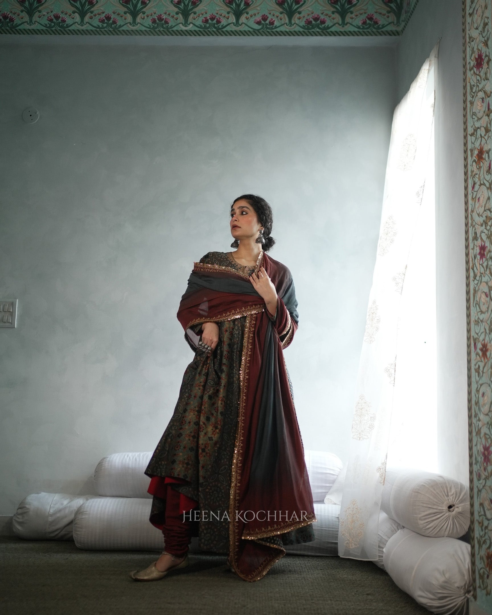 KURTA - Maroon And Green Ajrakh Chanderi Anarkali
