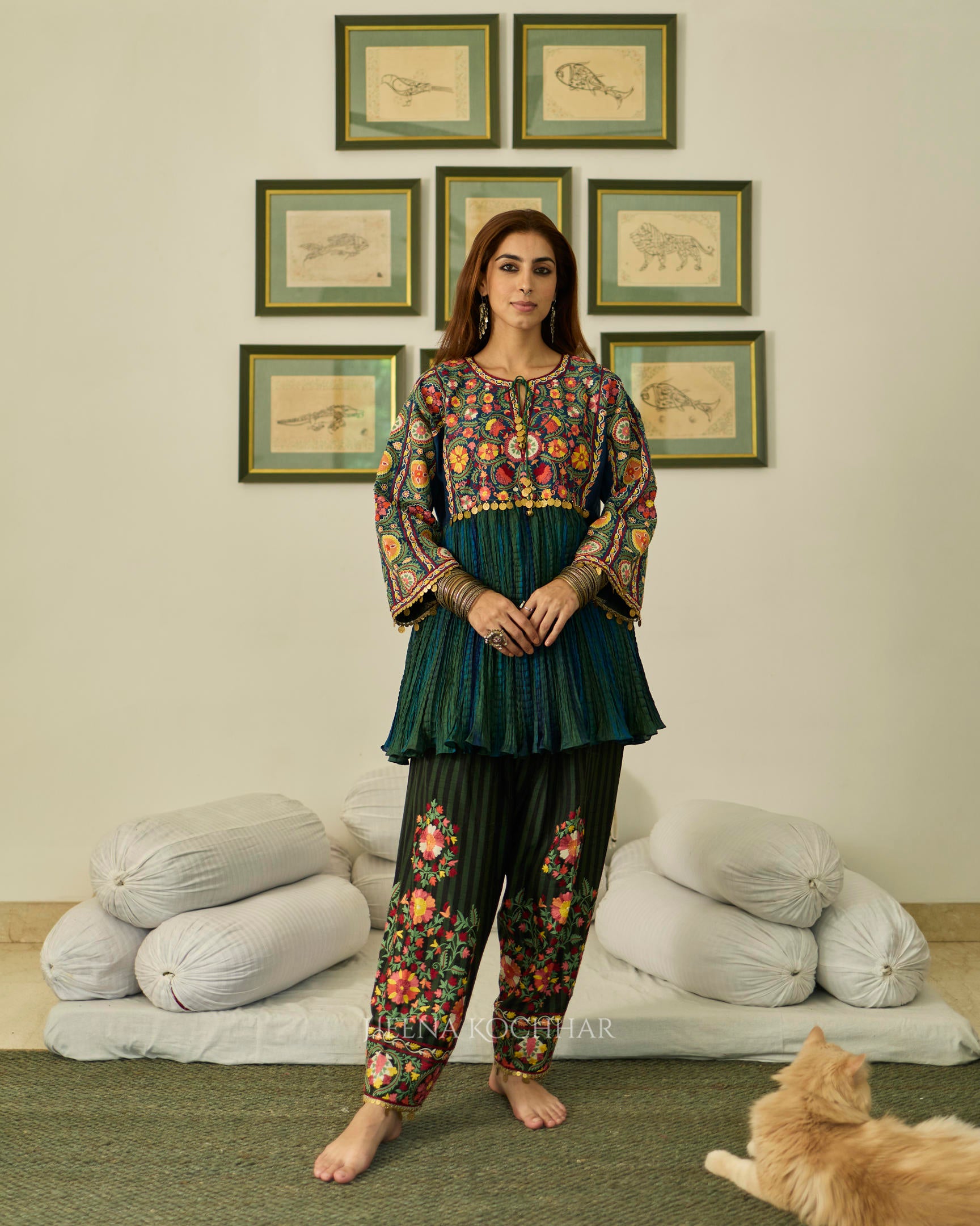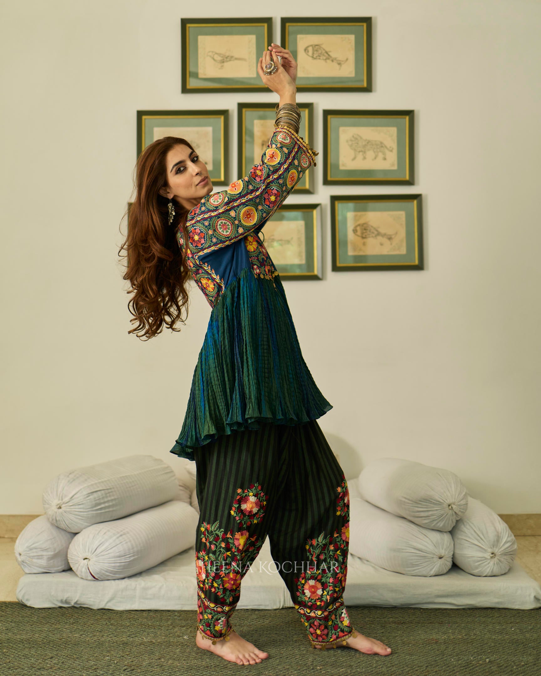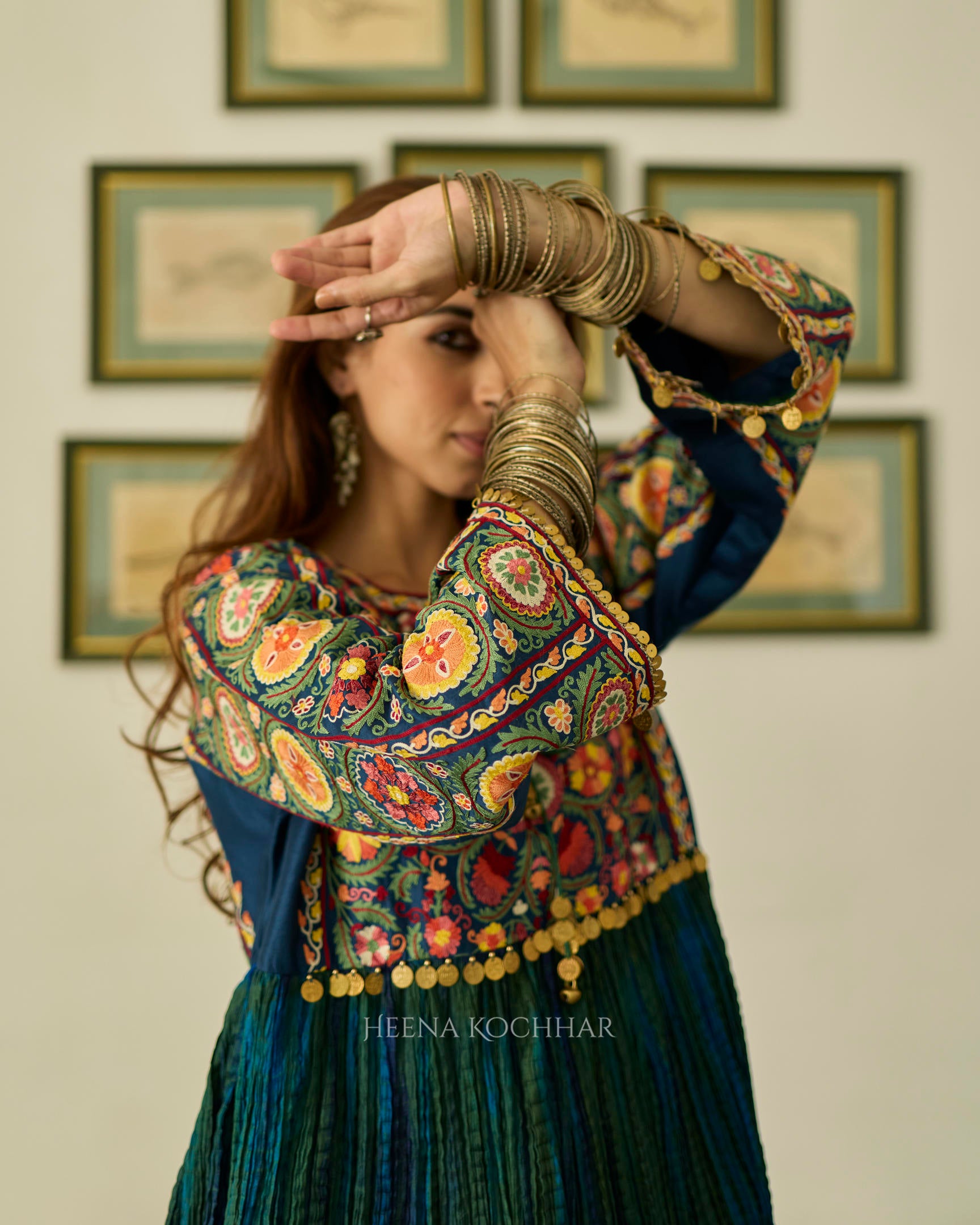 Kurta - Blue Andgreen Tie-Dye Crush Silk Anarkali