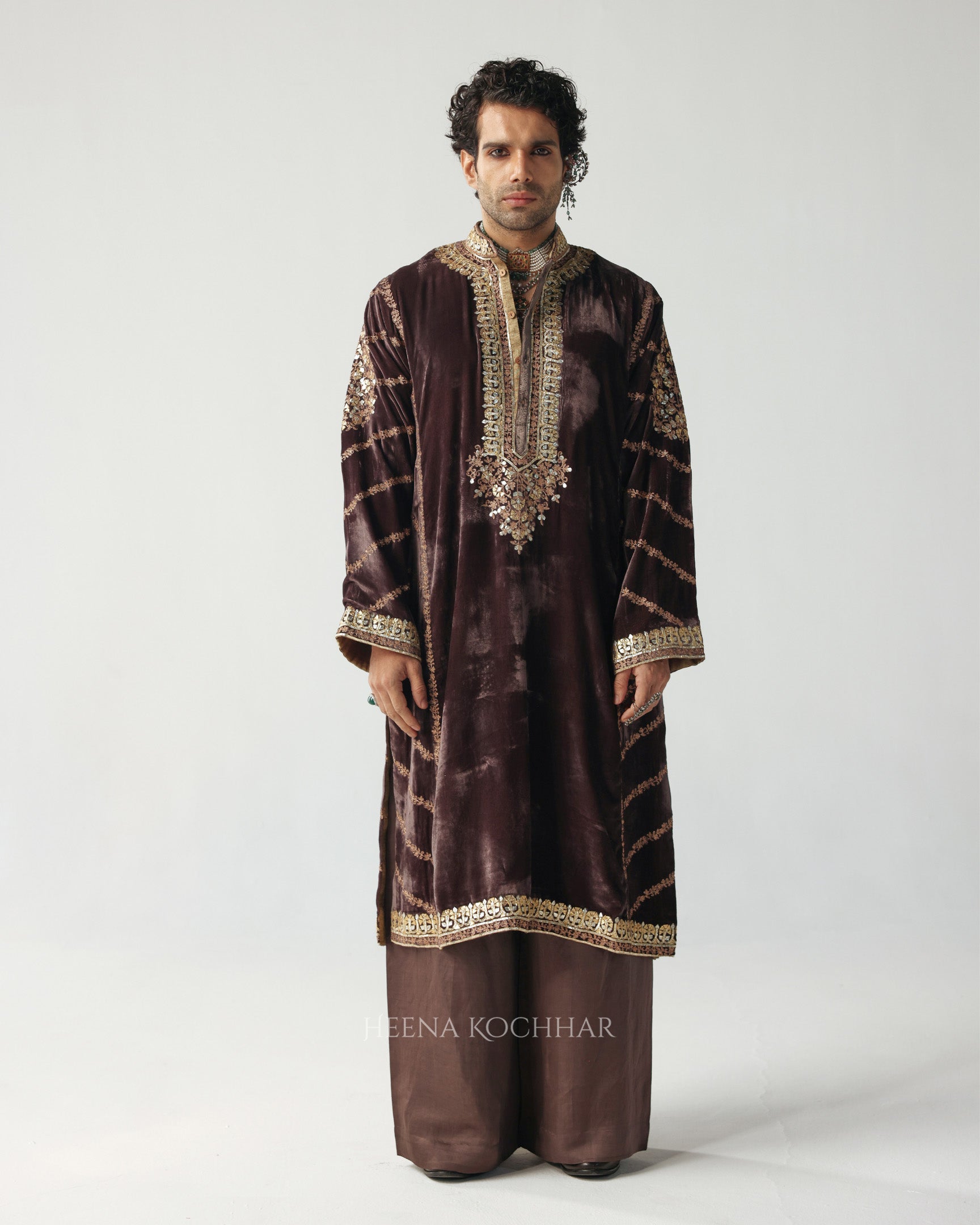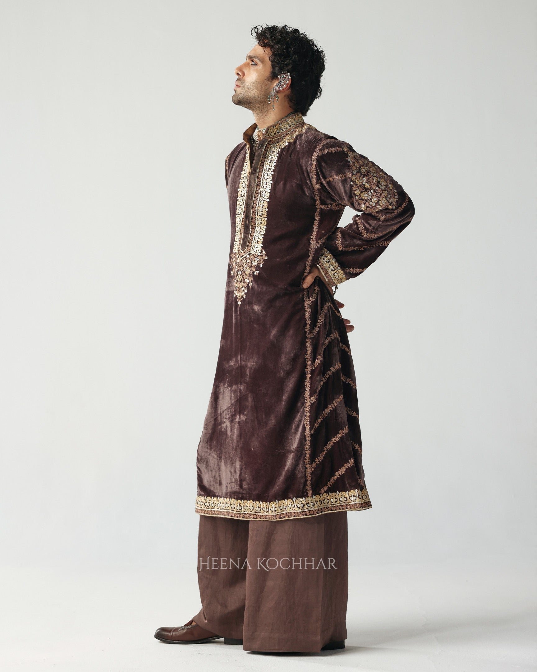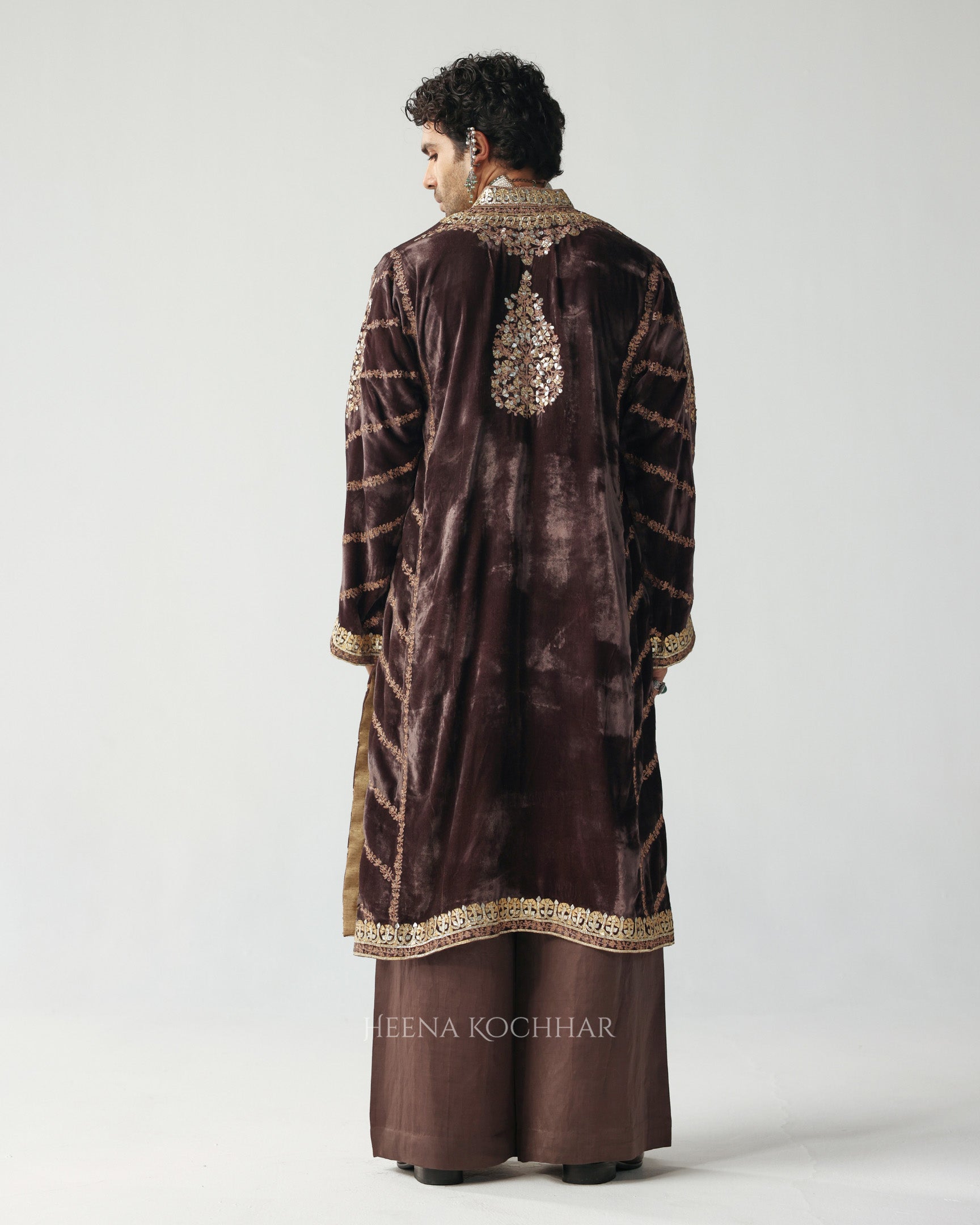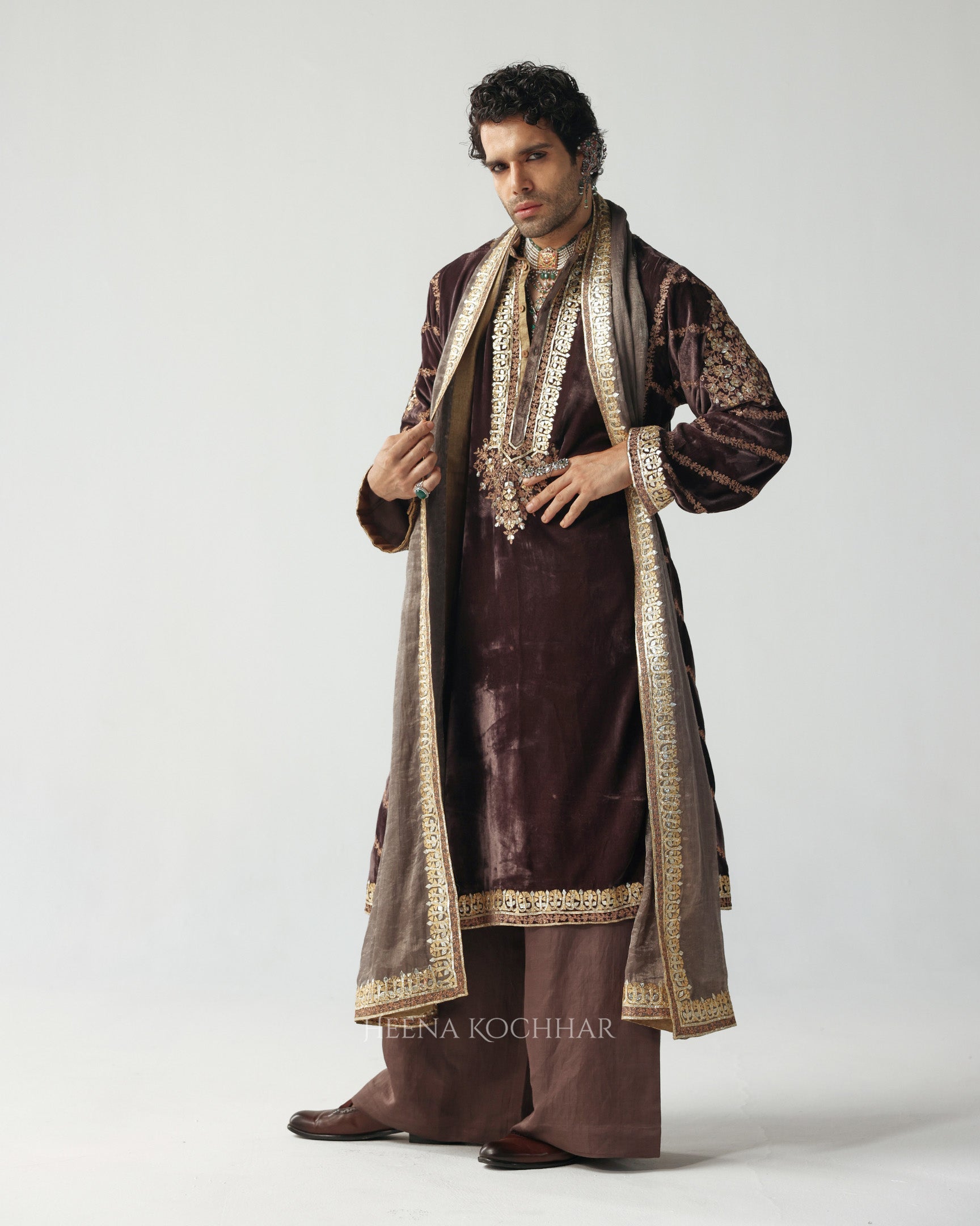 Crafted in clay velvet, this classic choga embodies warmth and quiet regality. Its luxurious drape and muted sheen evoke a timeless elegance.