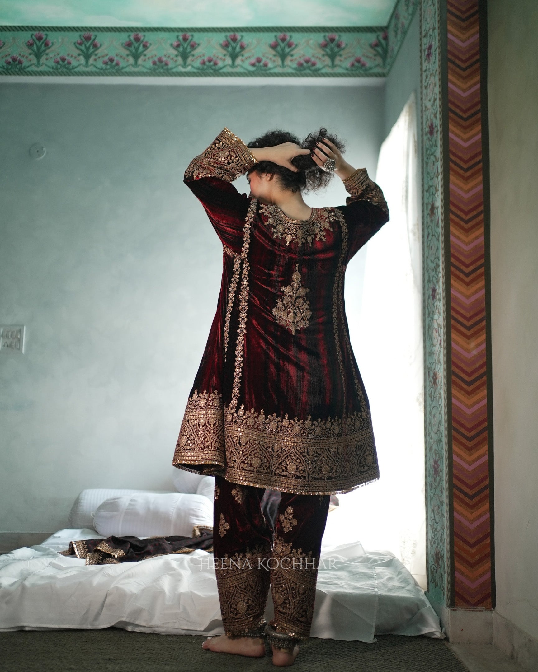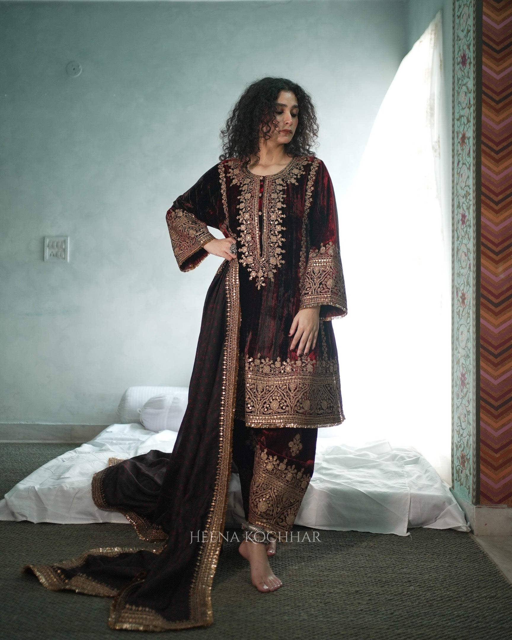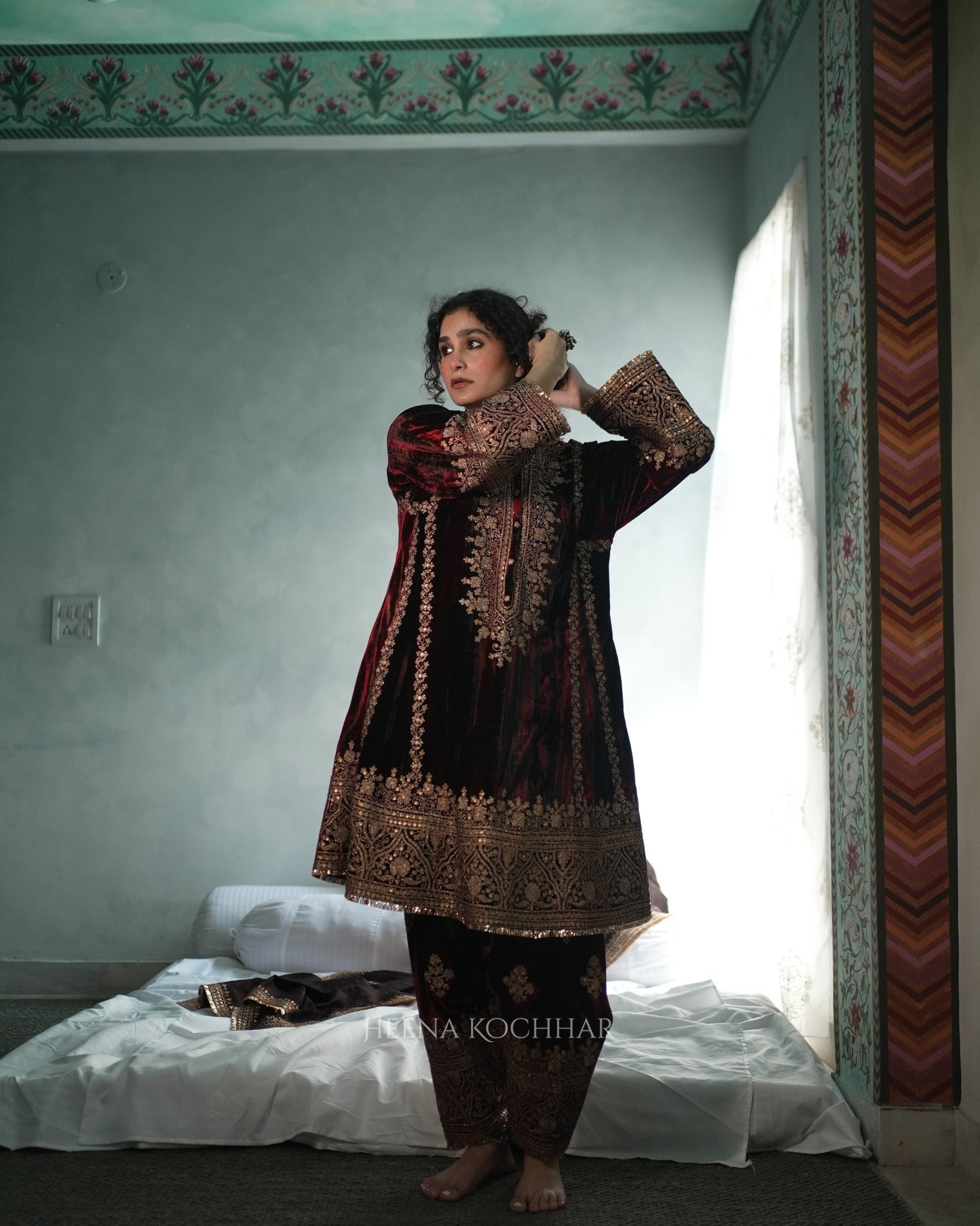 Kurta - Maroon And Black Tie Dye Silk Velvet Choga