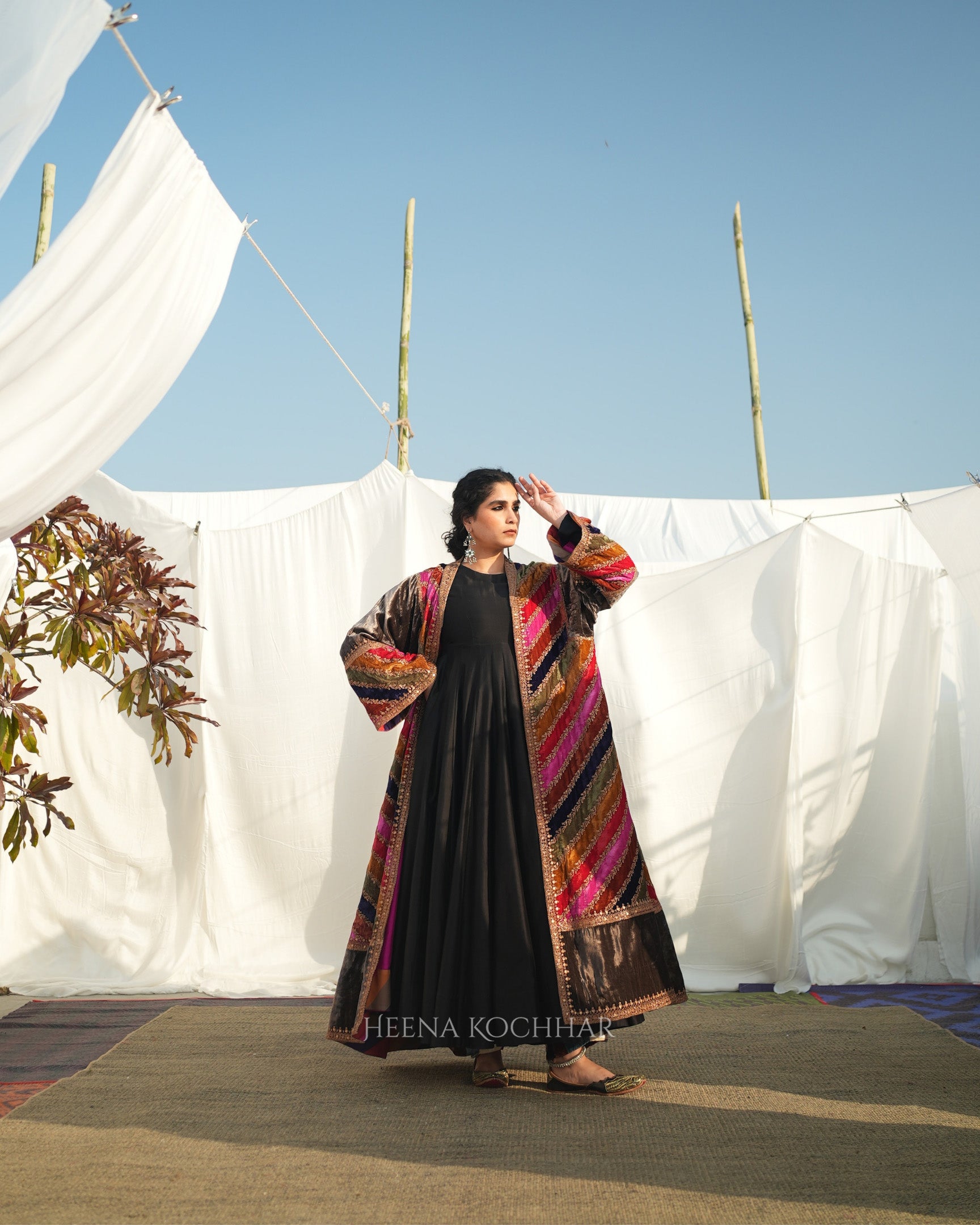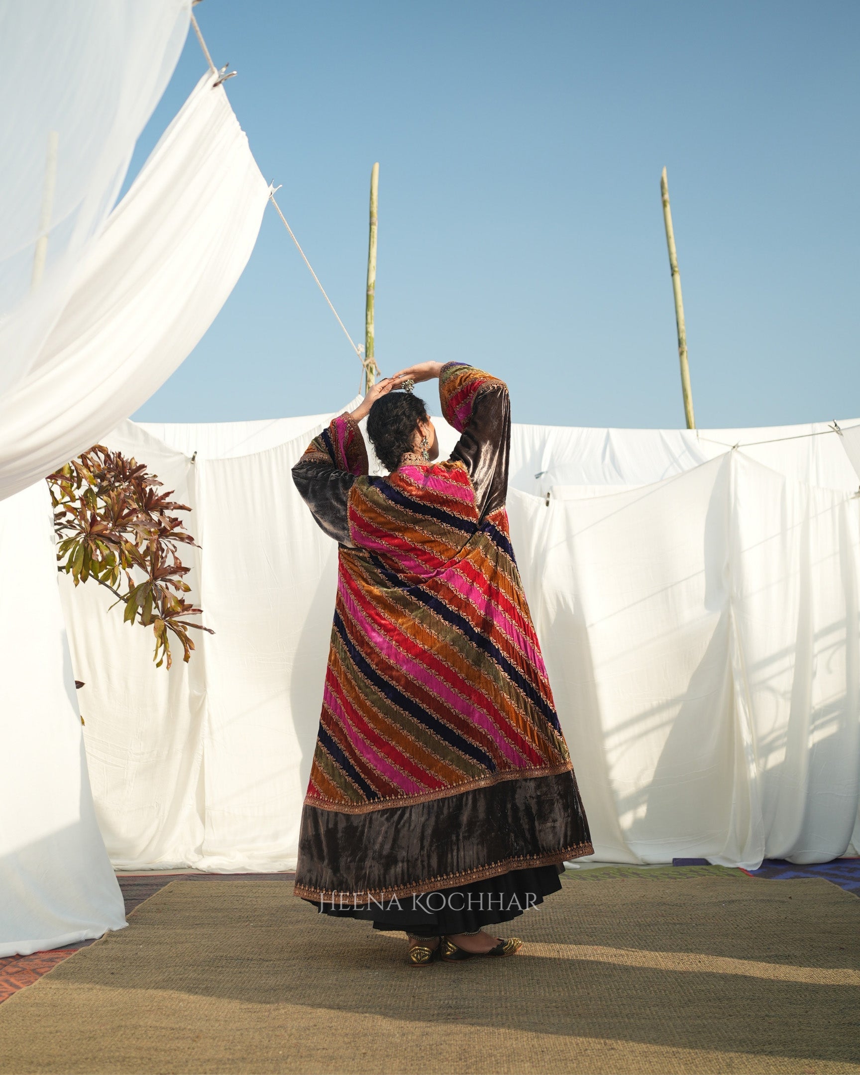 This silk velvet cape features clay and multi stripe panels crafted in silk velvet, creating a rich and textured look. Finished with zari dori embroidery, the cape highlights traditional craftsmanship with refined surface detail.