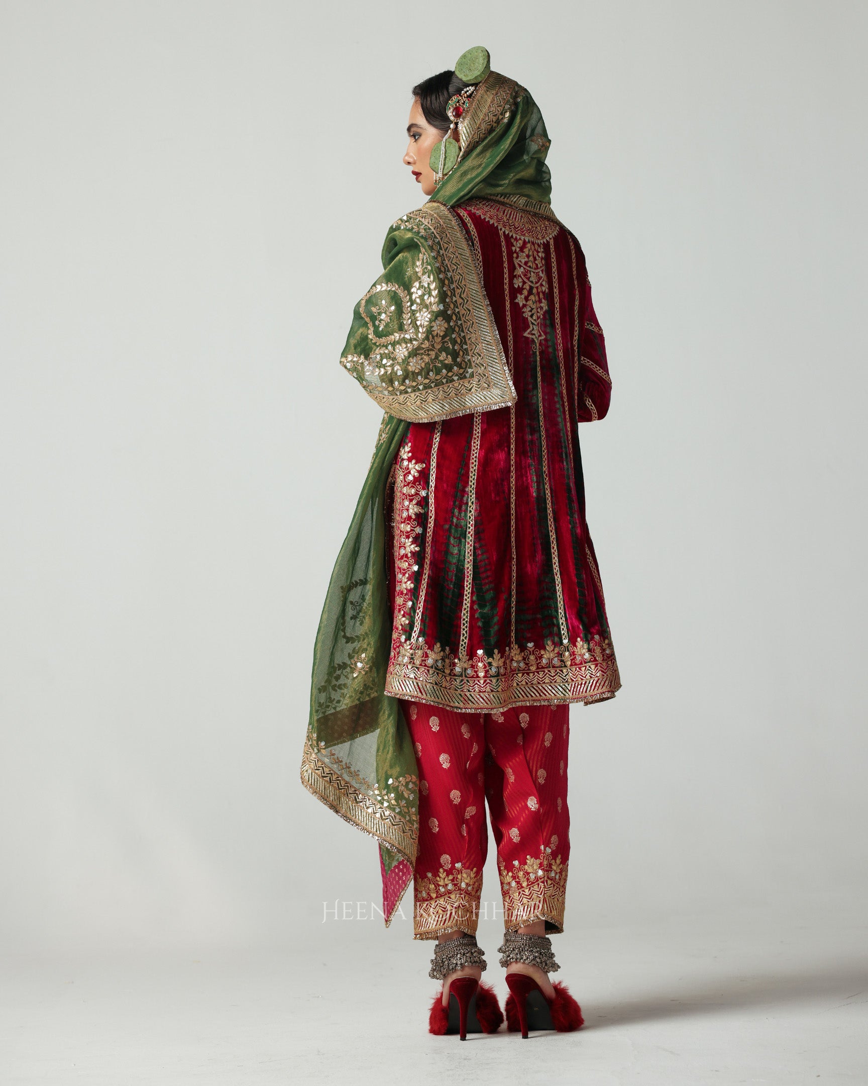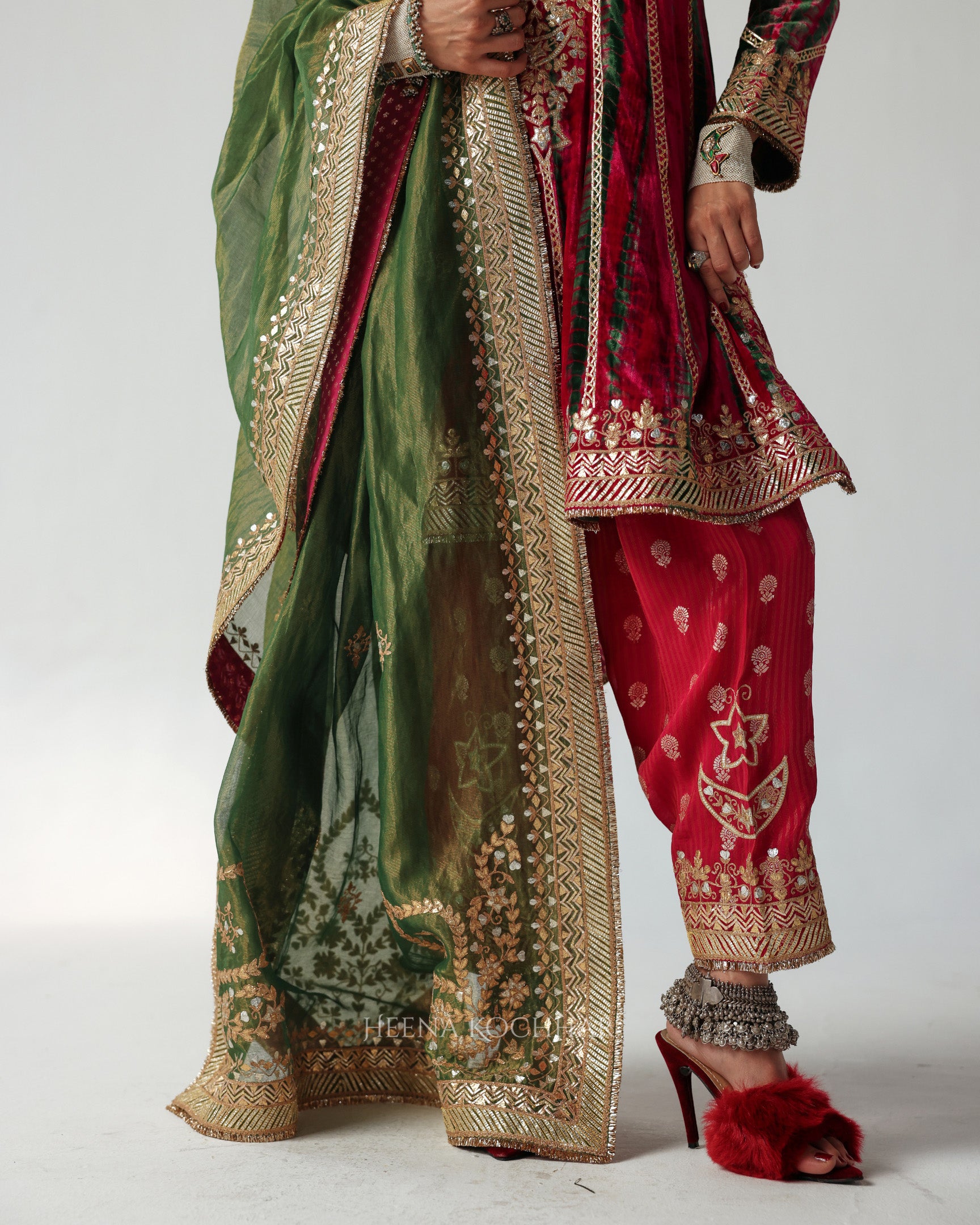 Intricately adorned with gota aari embroidery, it radiates festive grandeur and timeless appeal, perfect for weddings and winter celebrations.