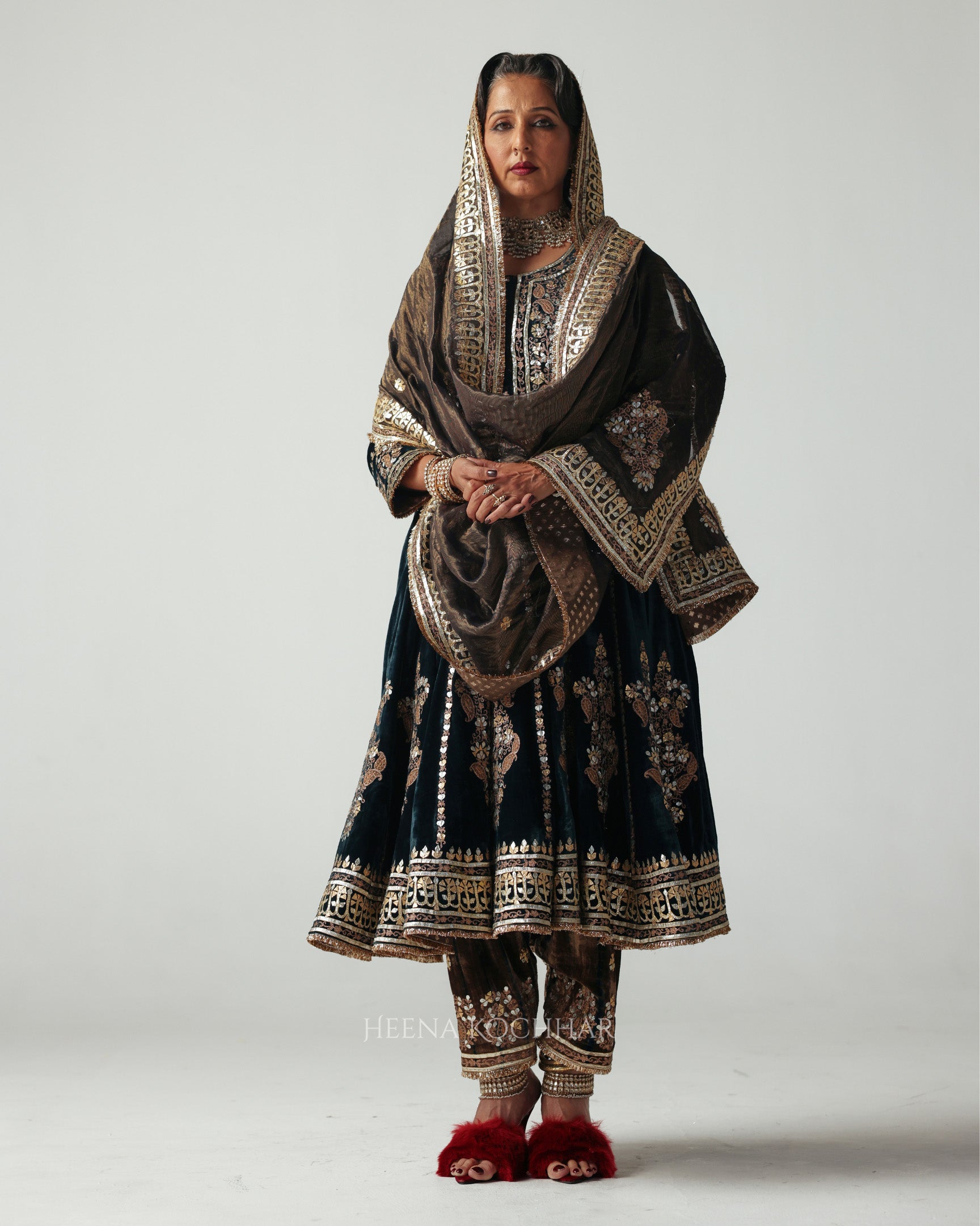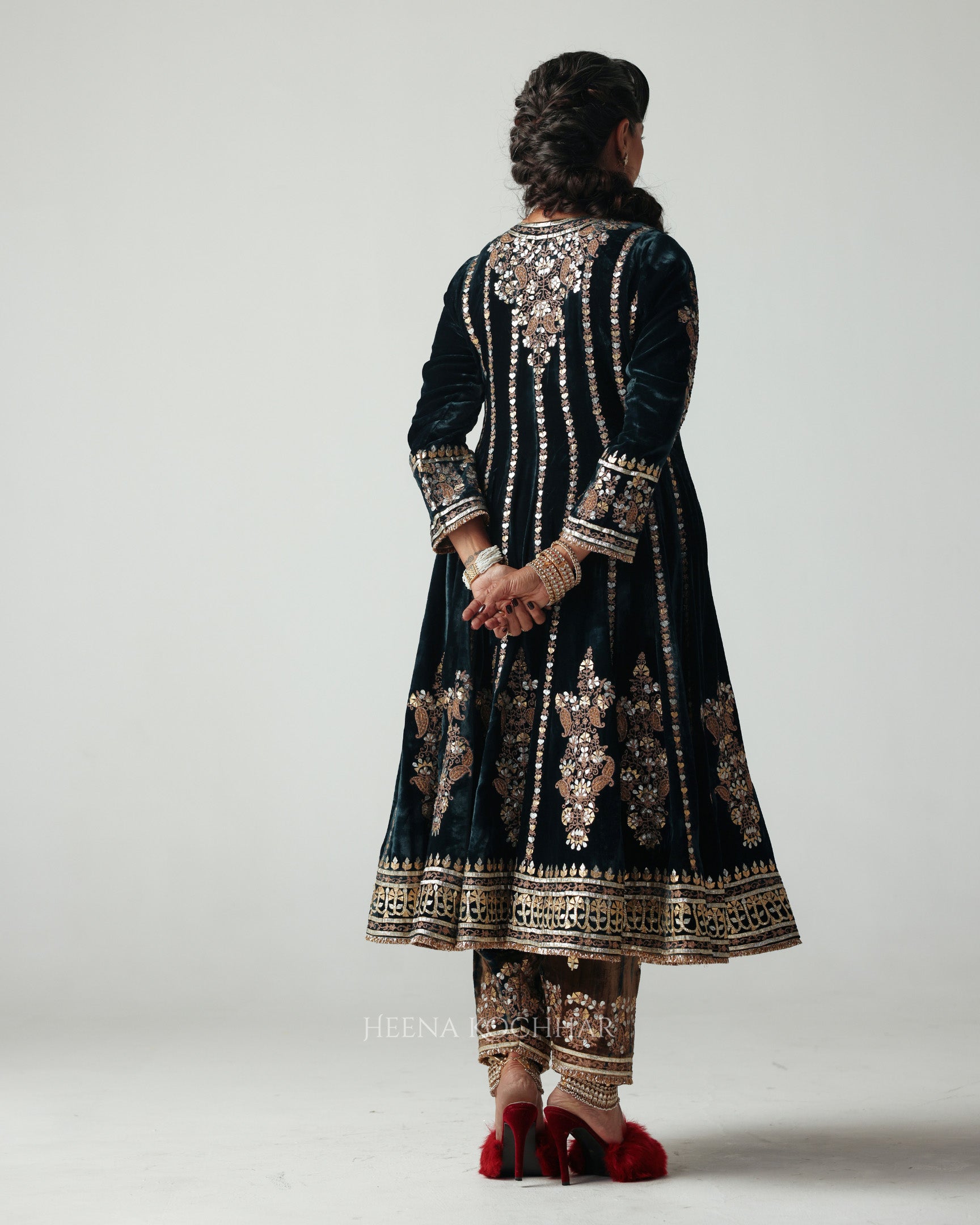 A rich teal velvet Anarkali, crafted with contrasting patches that add depth and texture to the silhouette. The piece is delicately embroidered in gota aari, lending a subtle shimmer that enhances its festive appeal.