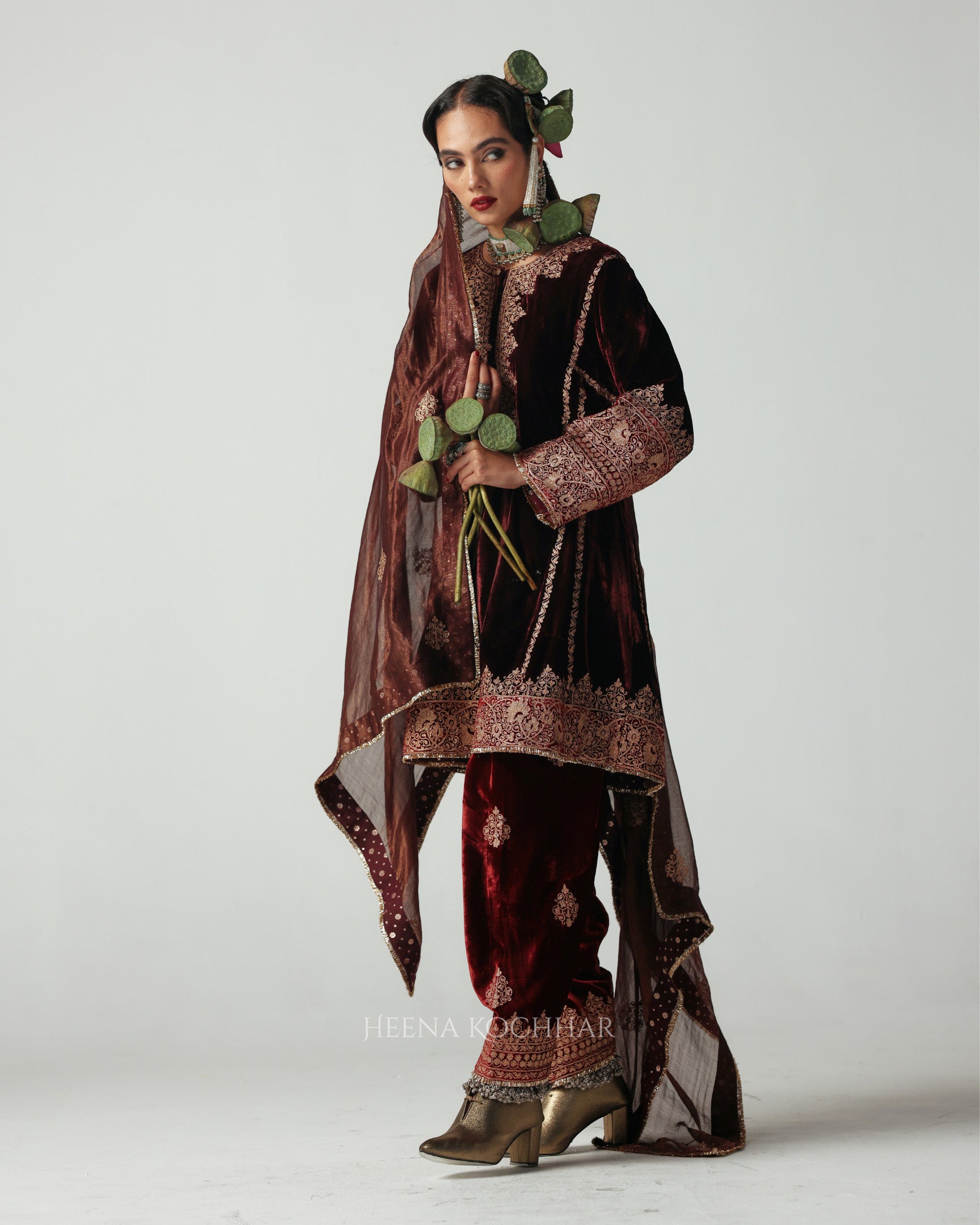 This wine velvet choga is paired with a complementary maroon velvet salwar, both adorned with intricate zari aari embroidery that lends a regal touch to the ensemble. The look is finished with delicate Kiran lace detailing and a matching maroon velvet dupatta, completing the set with timeless elegance and festive richness.