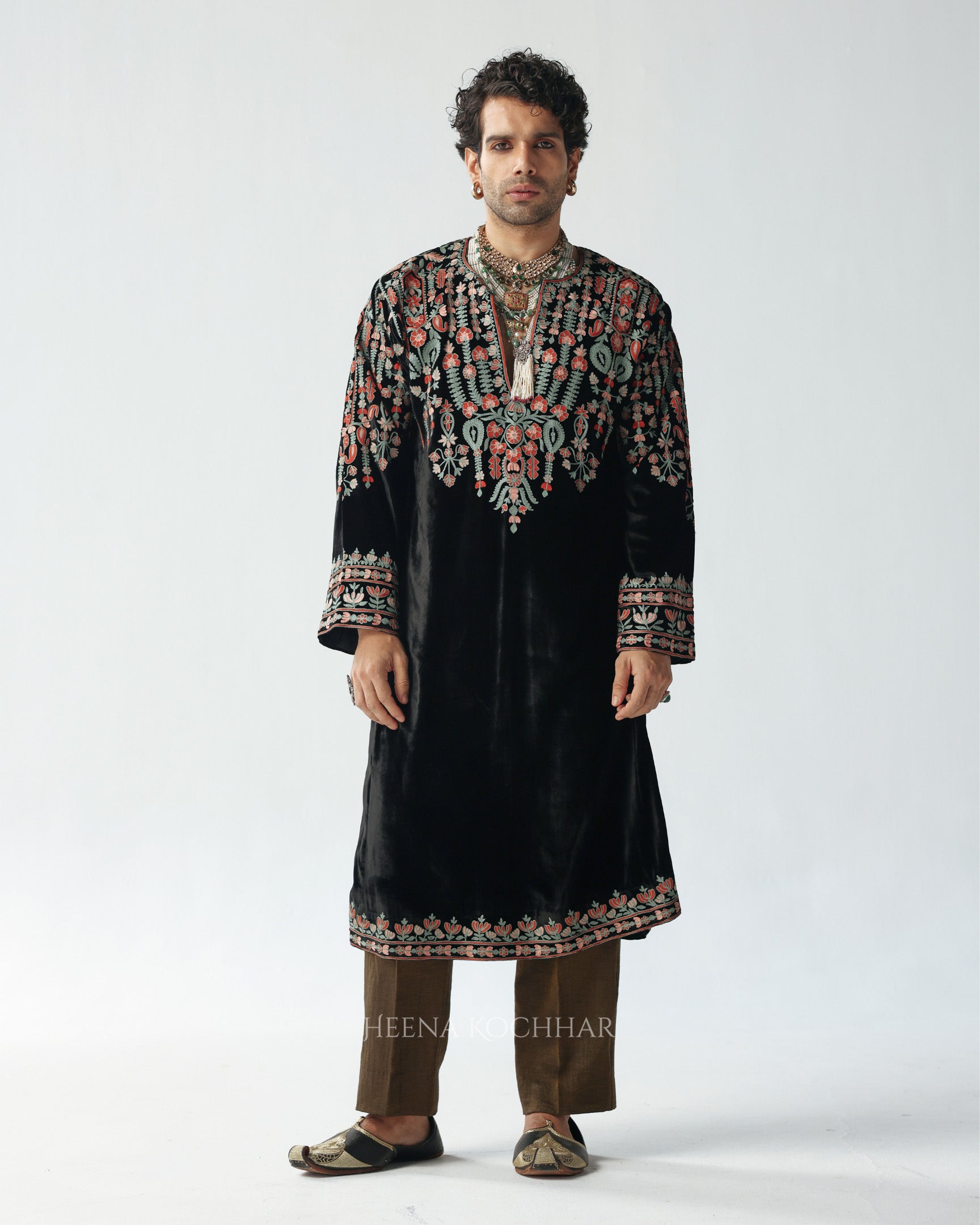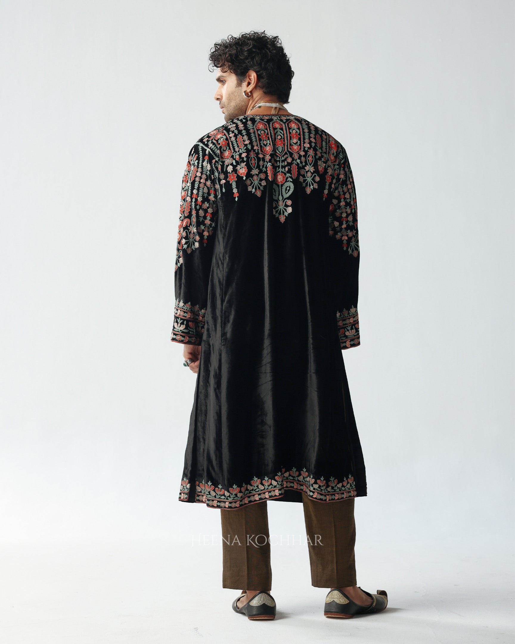 This black velvet choga features multi-resham ari embroidery, adding subtle color and detail against the deep velvet base.