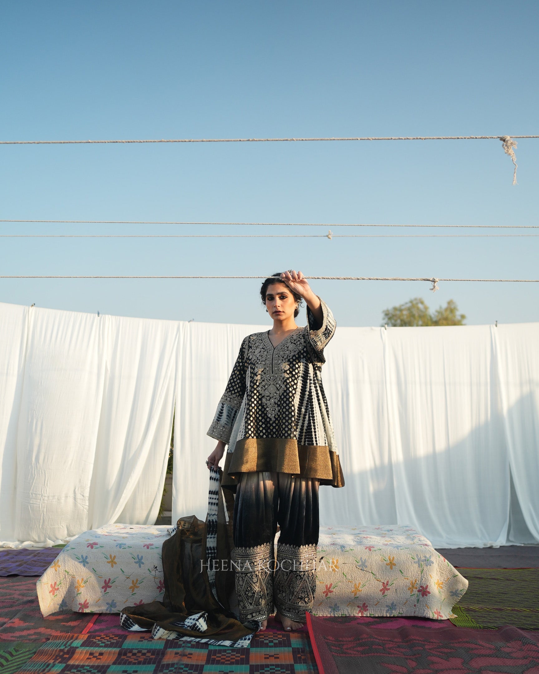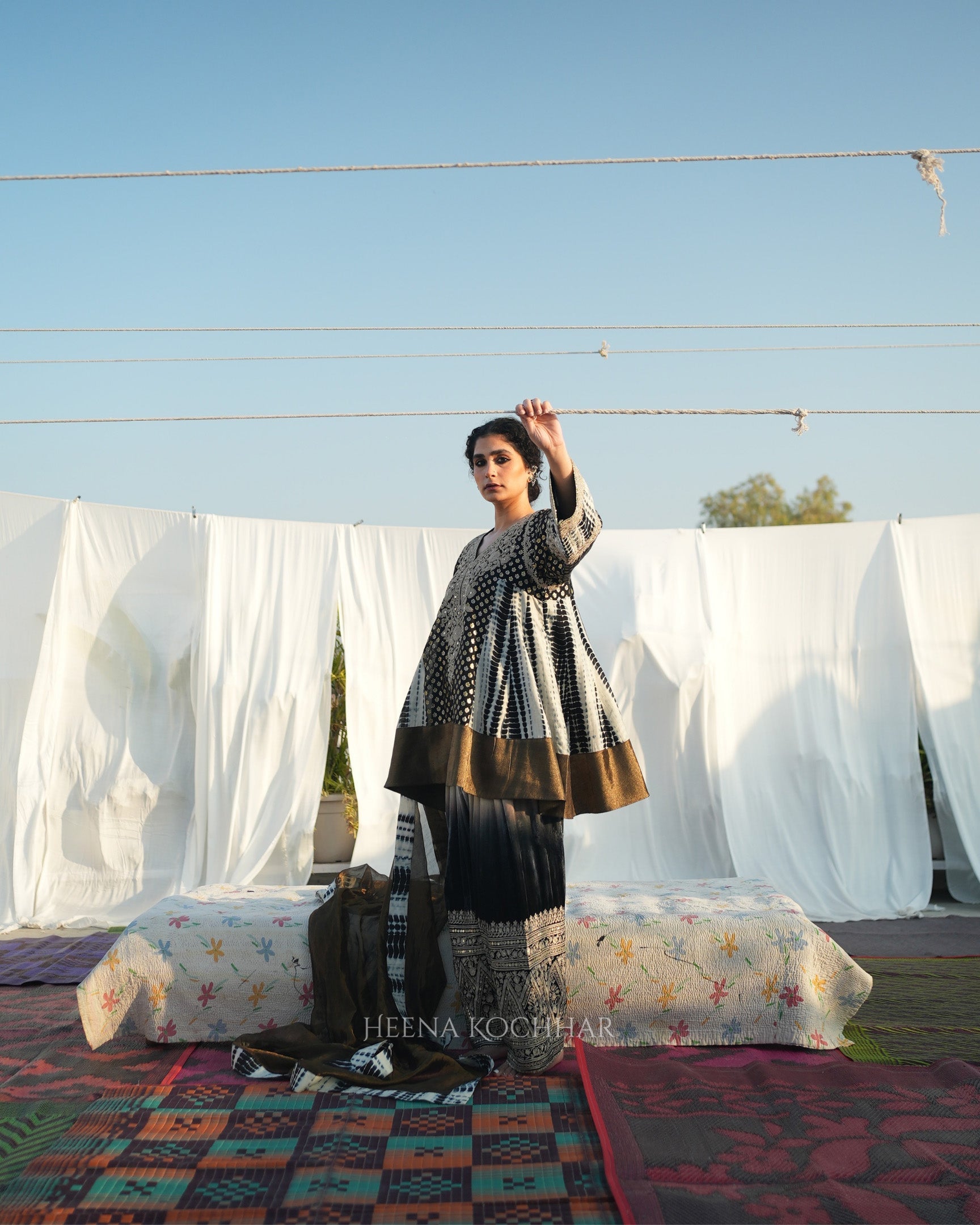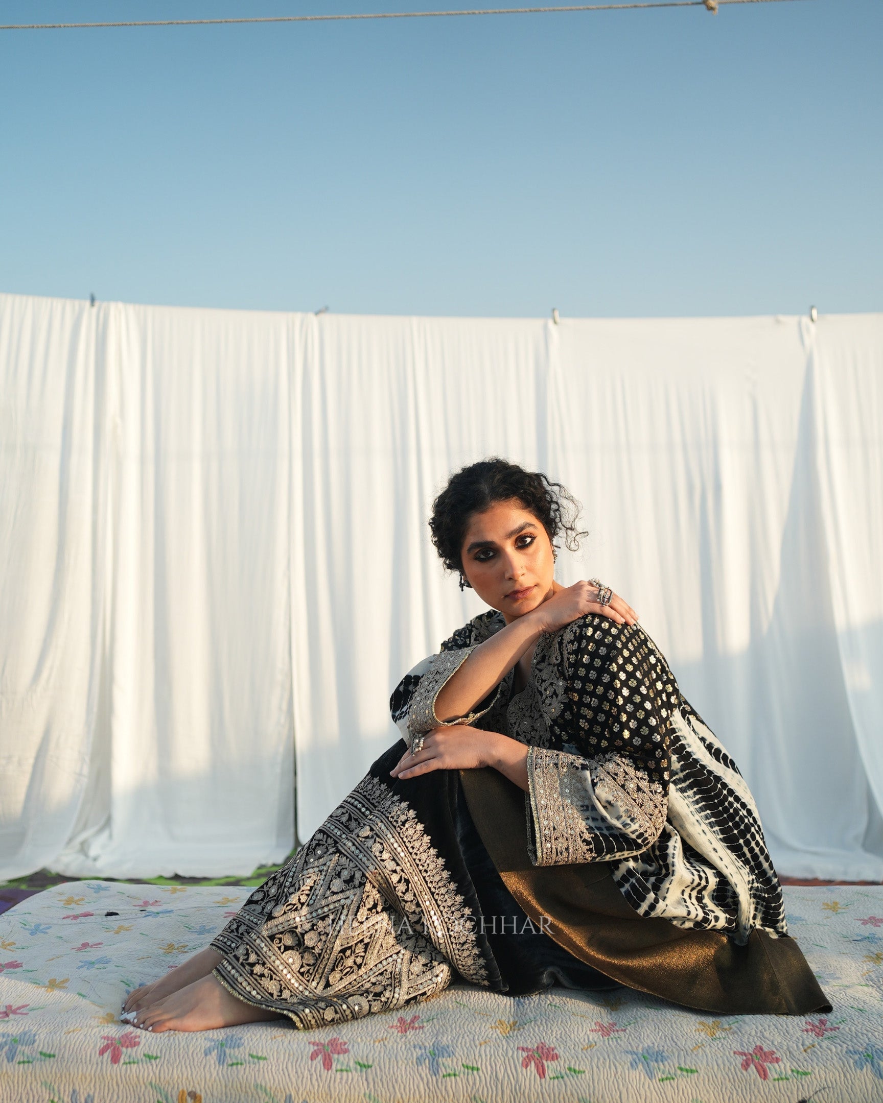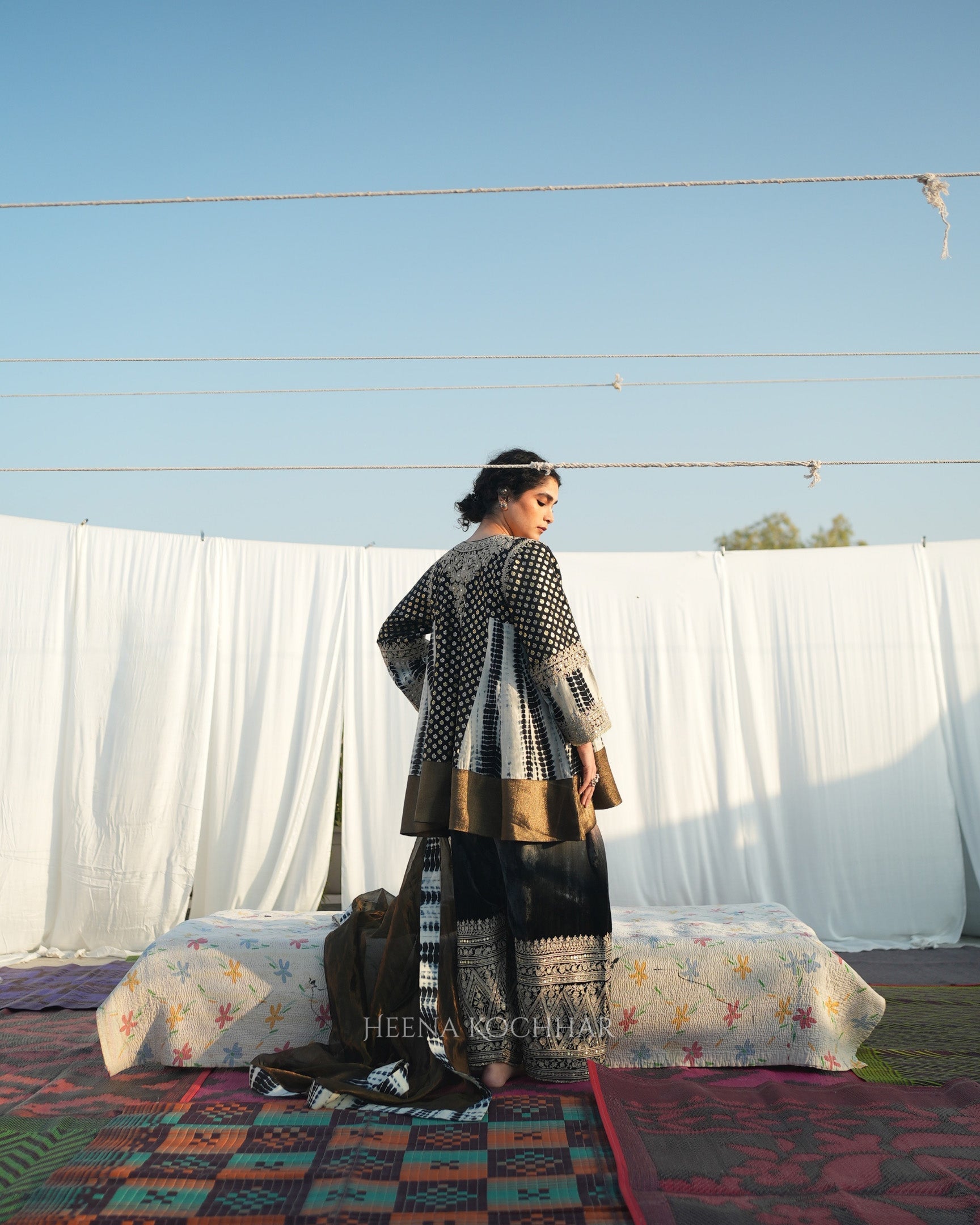 This black and ivory tie-dye choga set features a zari weave choga kurta paired with an ivory and black silk salwar and a black weave tissue odhani. Finished with dori sitara embroidery, the set highlights traditional craftsmanship in a modern colour palette.