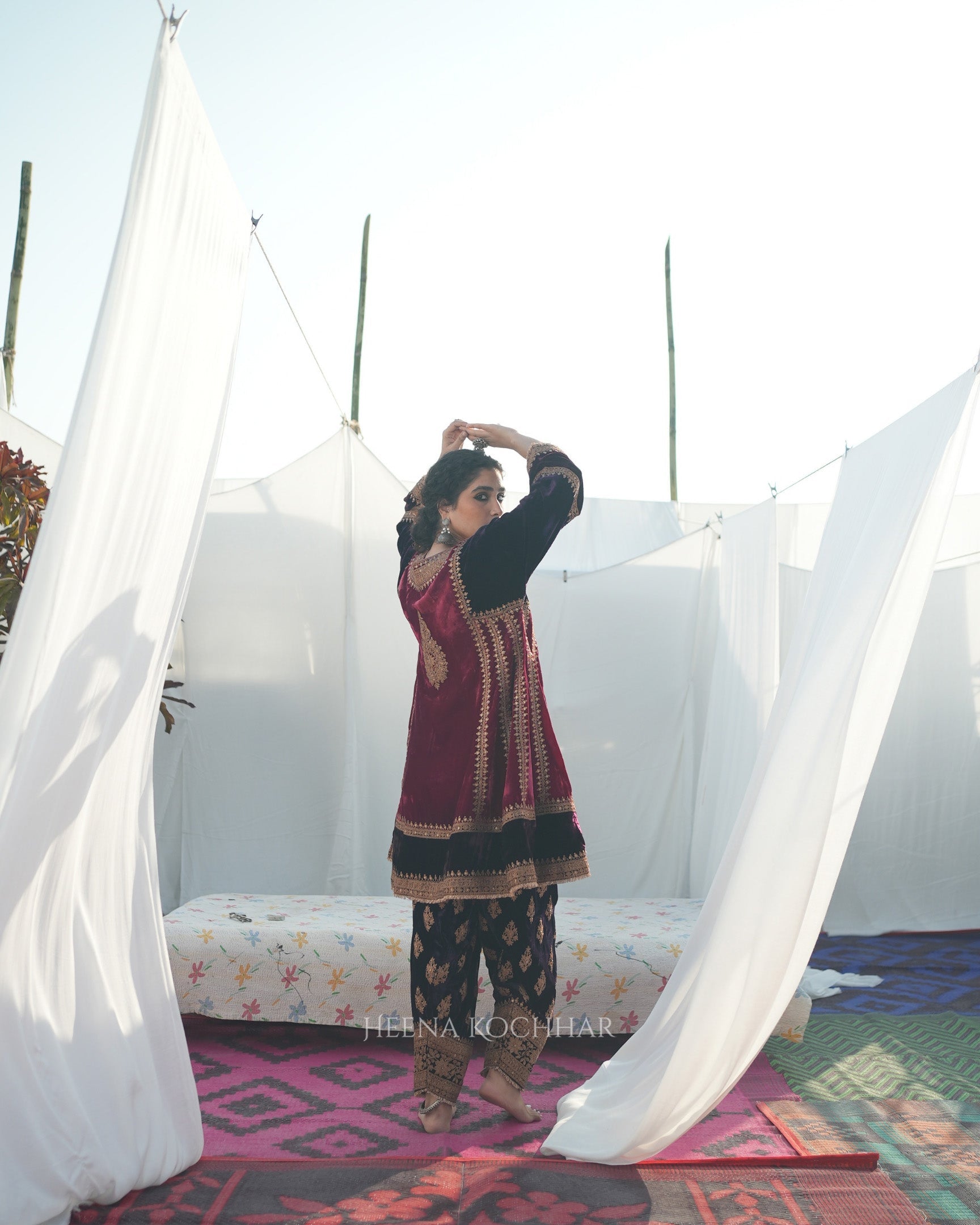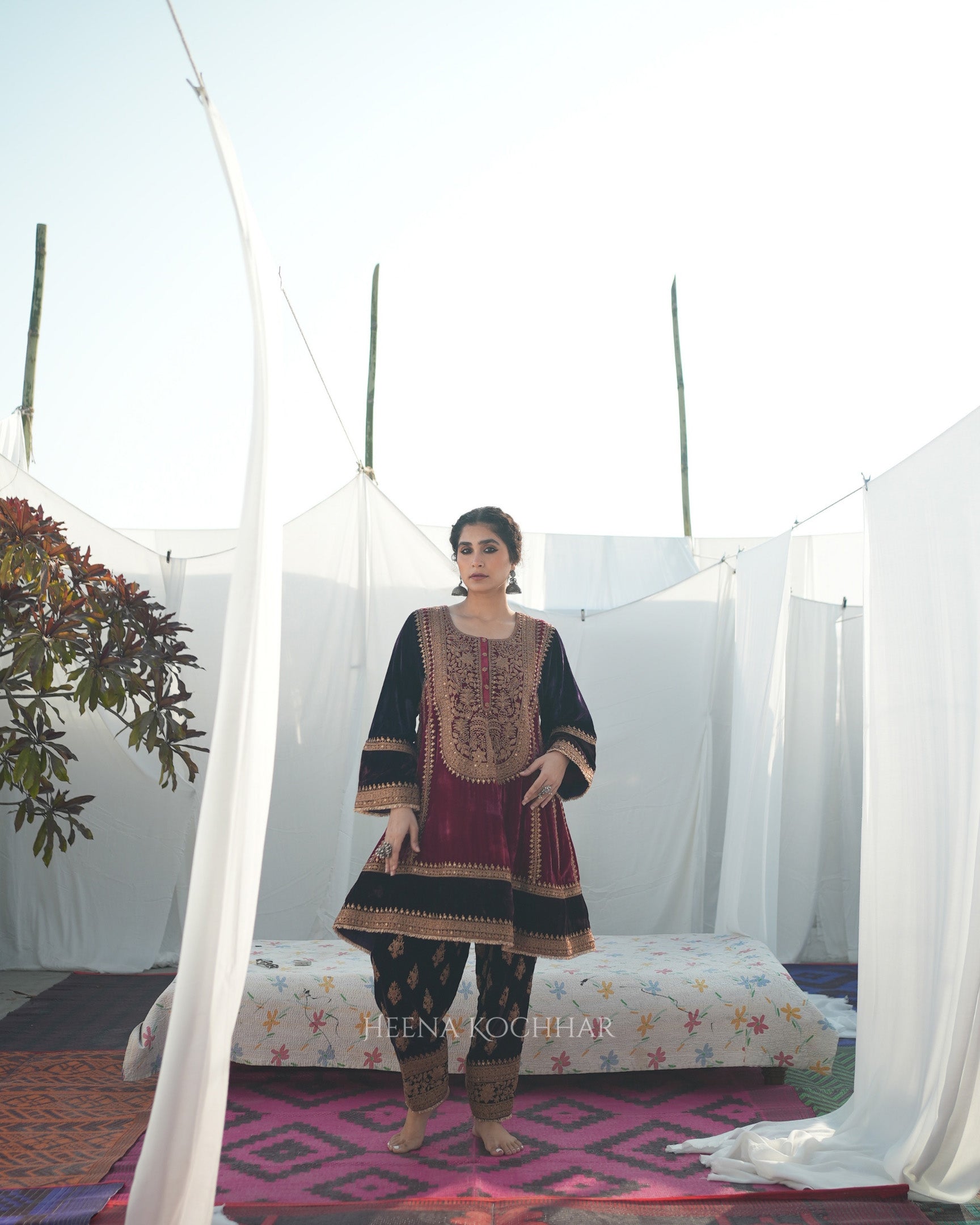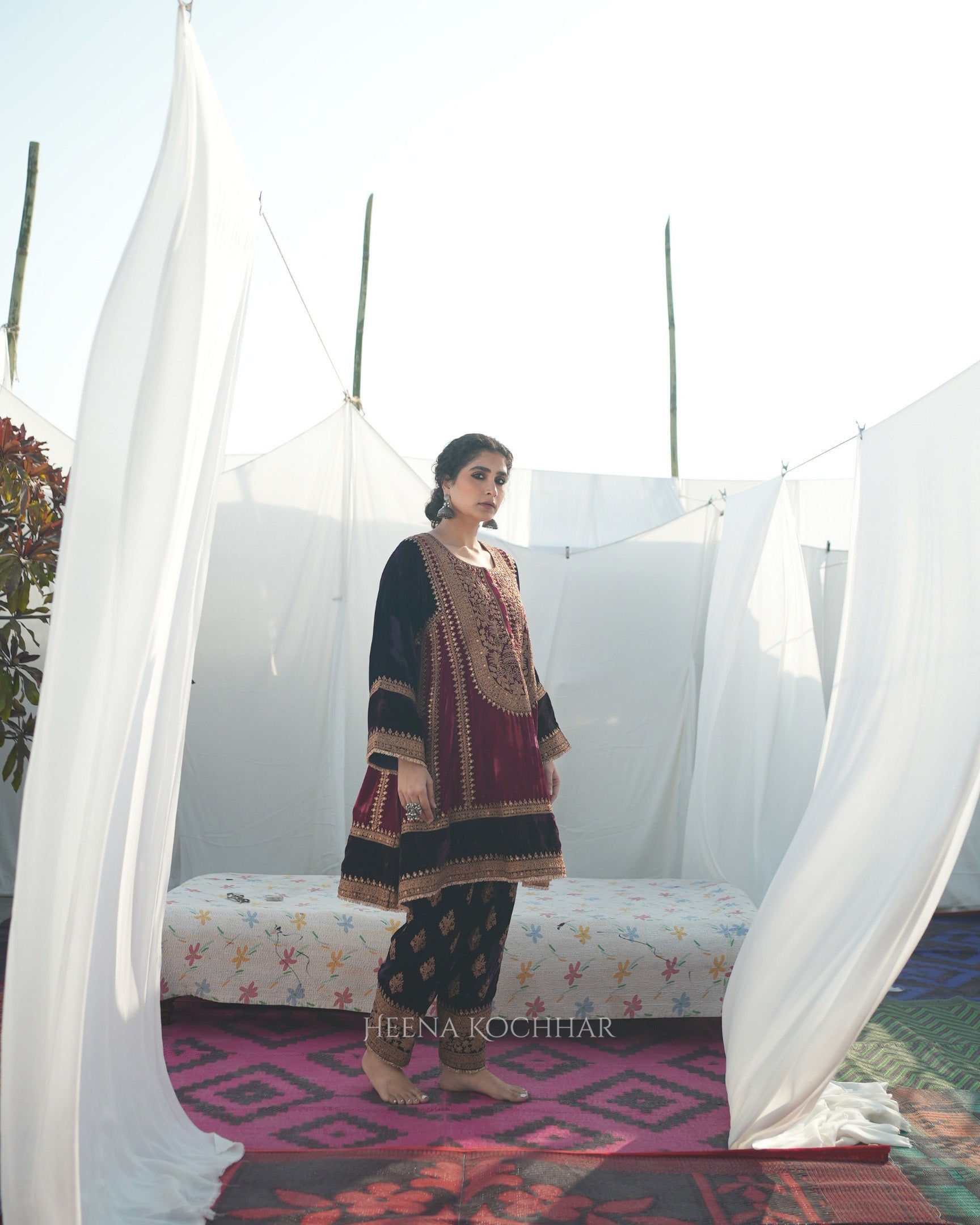 This choga set features a purple and pink colorblock silk velvet choga kurta designed in a bold yet balanced palette. It is paired with a purple silk velvet salwar, creating a coordinated festive look. Finished with zari dori sitara embroidery, the set highlights fine craftsmanship with a rich surface detail.