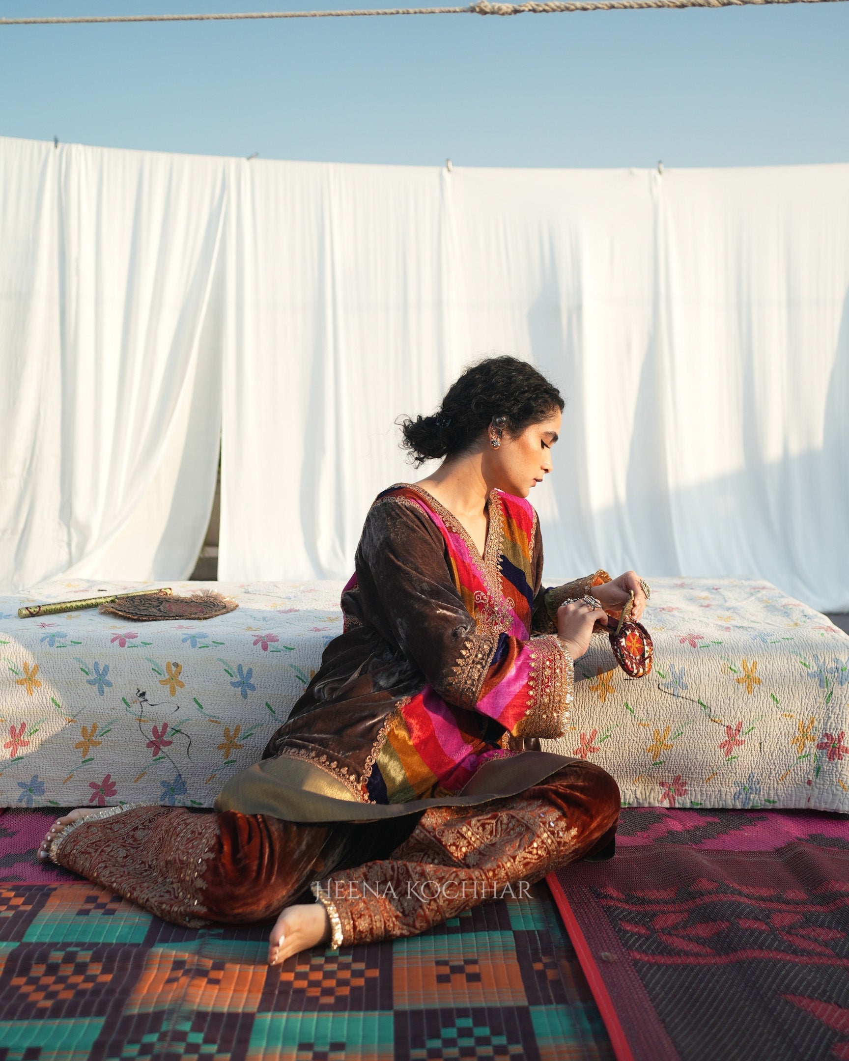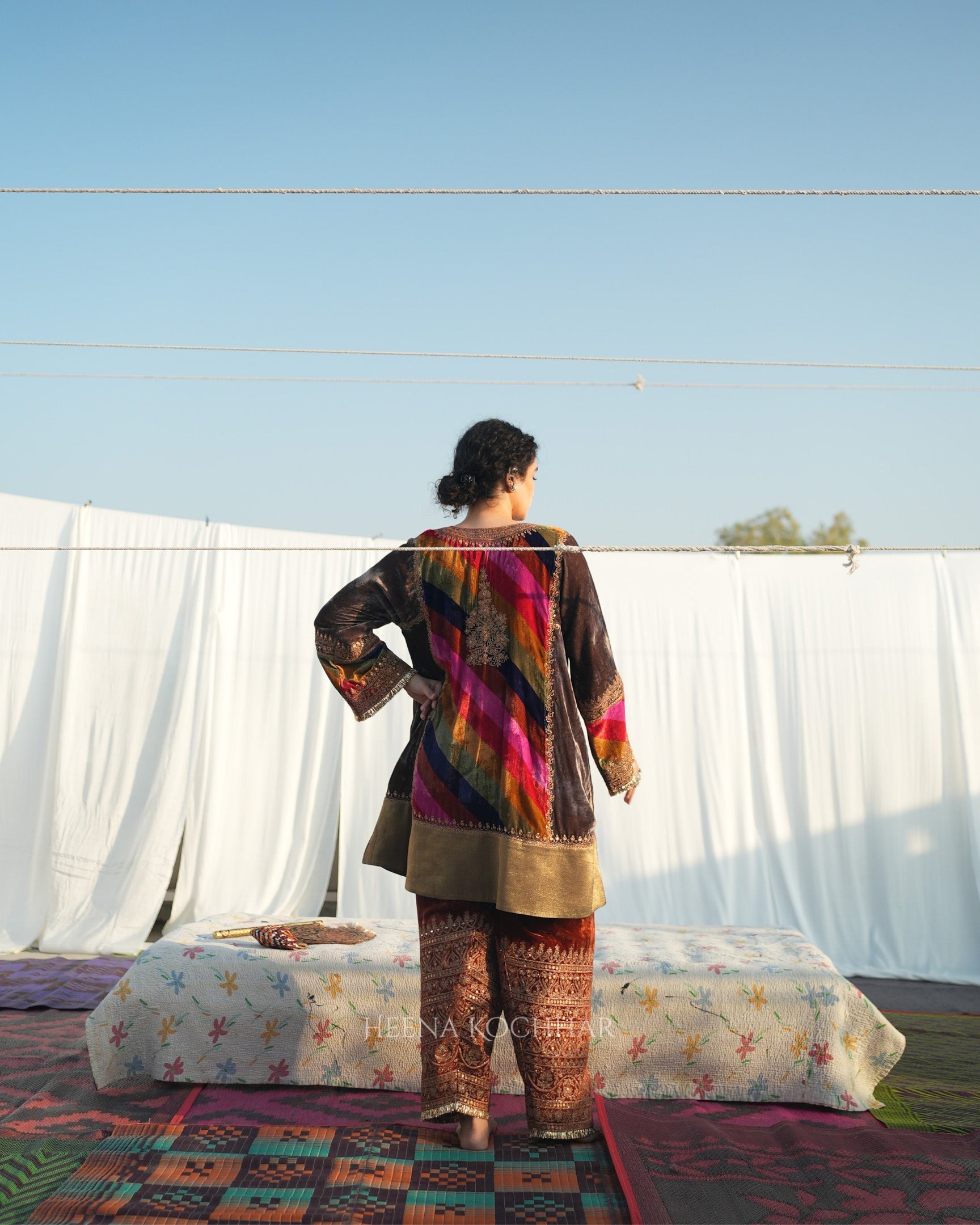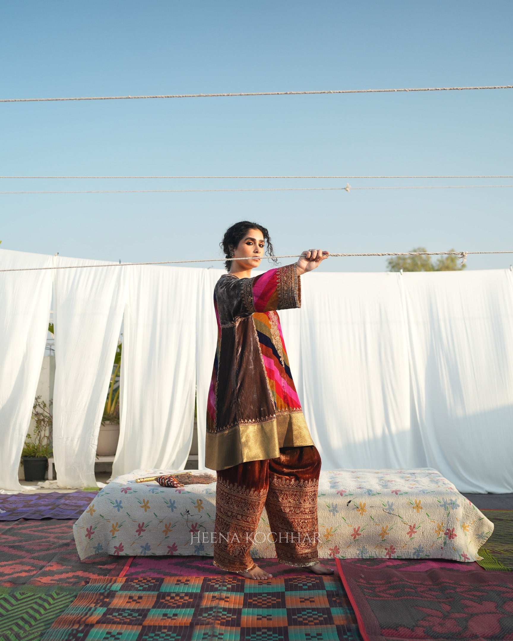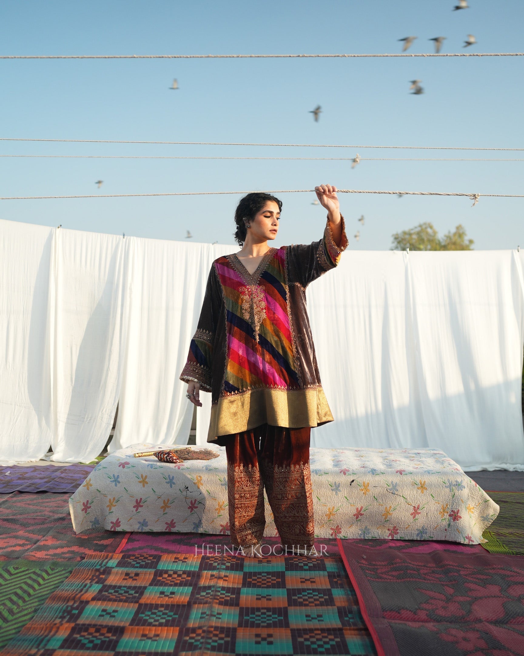 This grey silk velvet choga set features a choga kurta crafted in silk velvet with multi stripe silk velvet panels. It is paired with a rust ombre silk velvet salwar, creating a rich contrast in tones and texture. Finished with dori sitara embroidery, the set reflects fine craftsmanship with a contemporary feel.