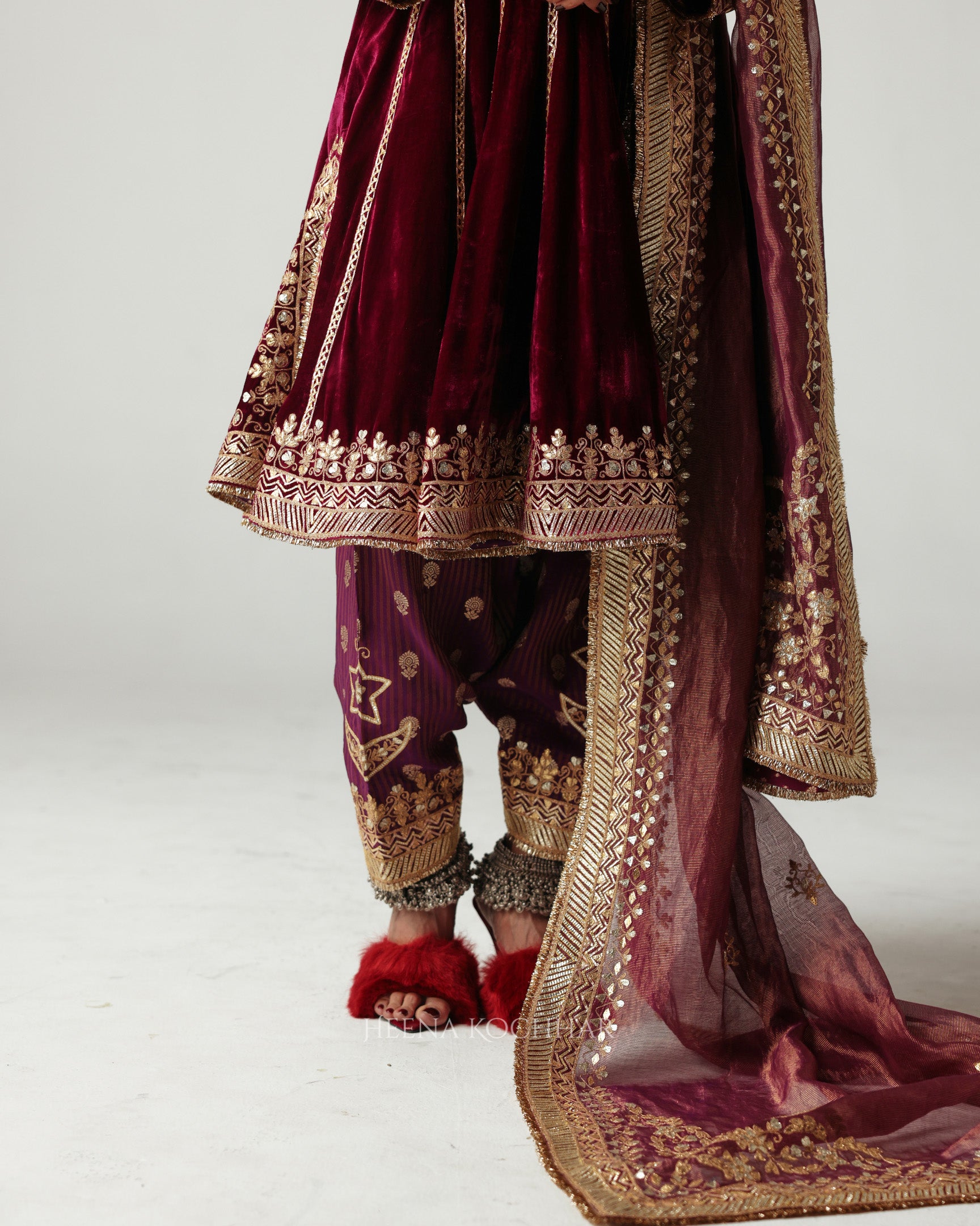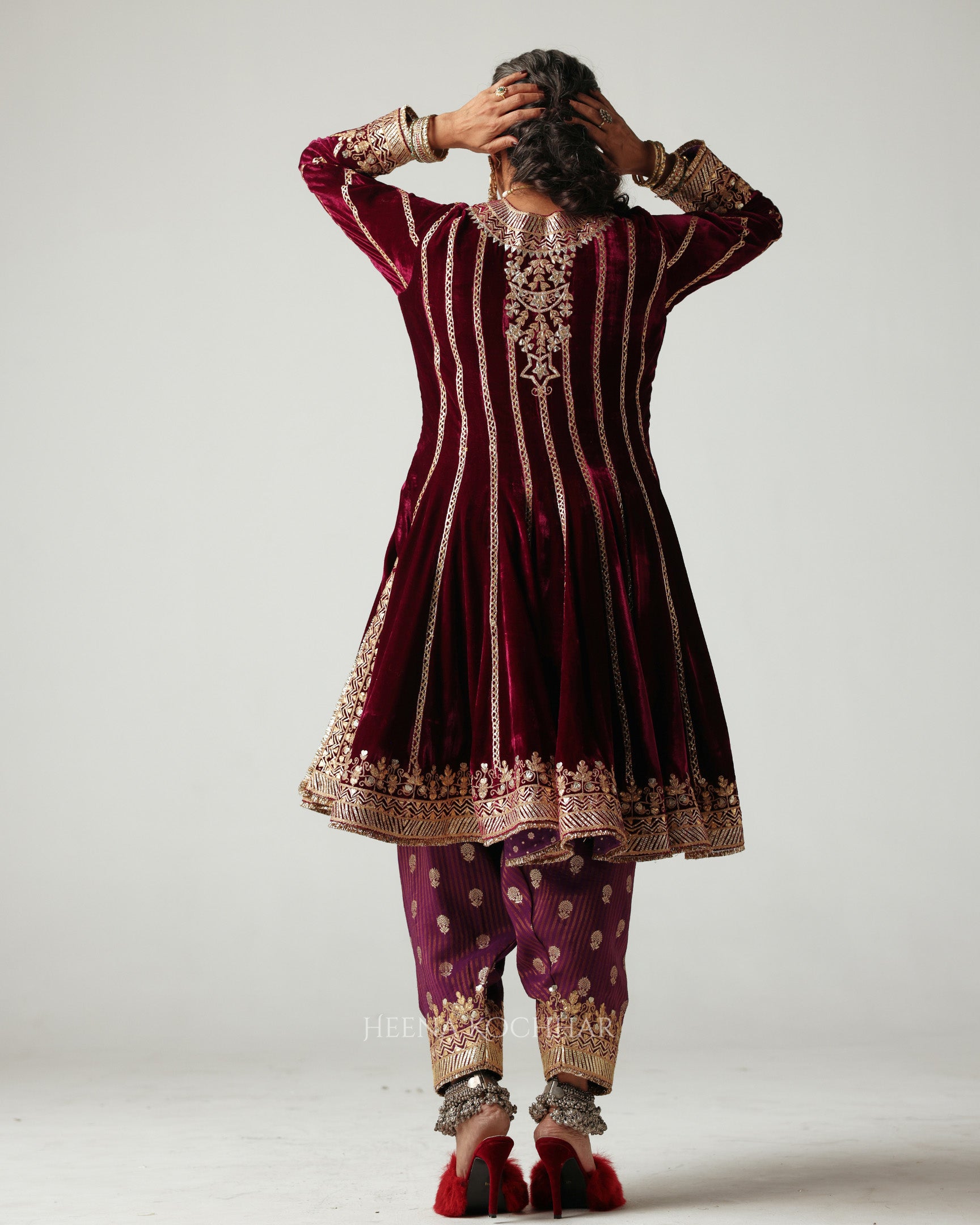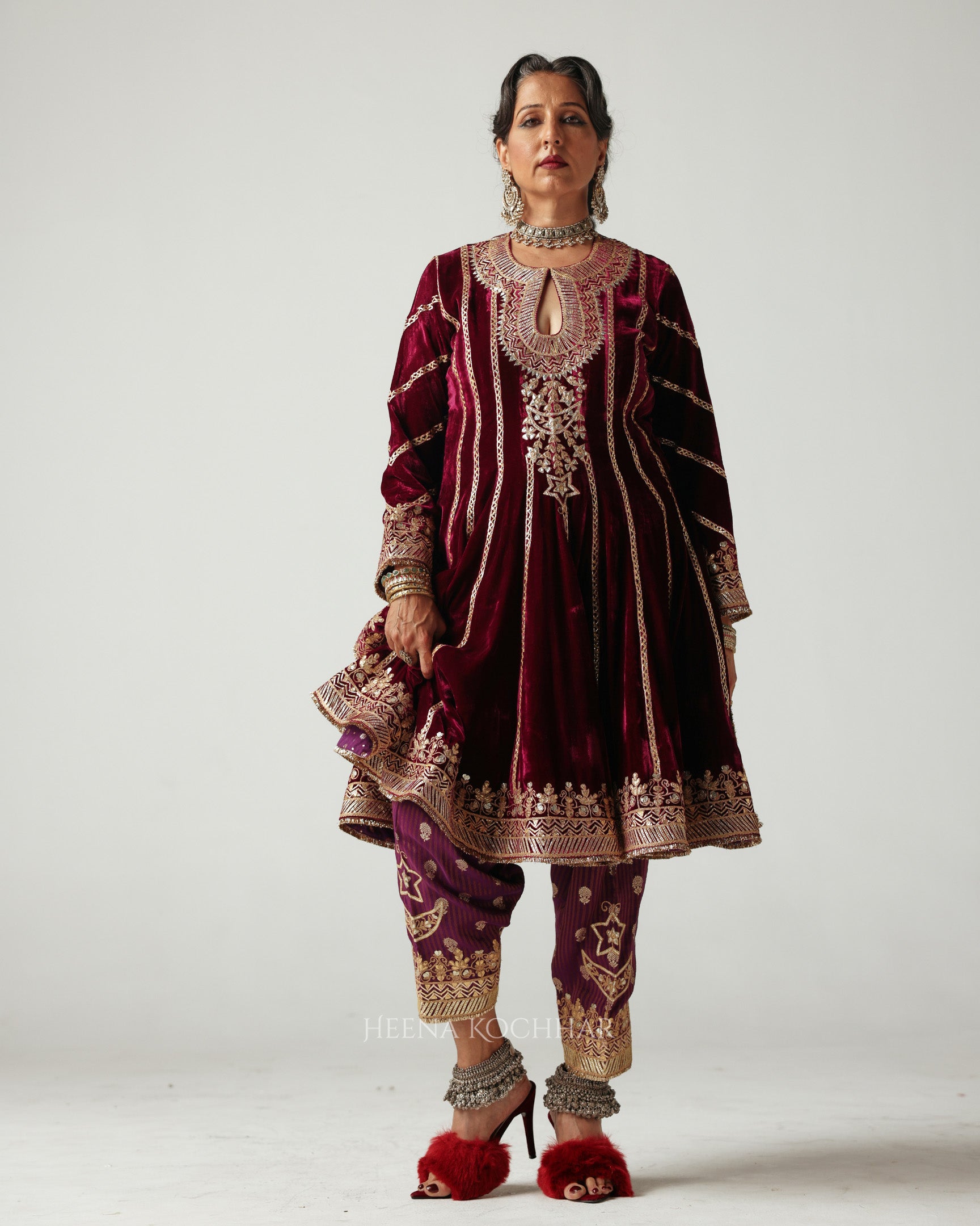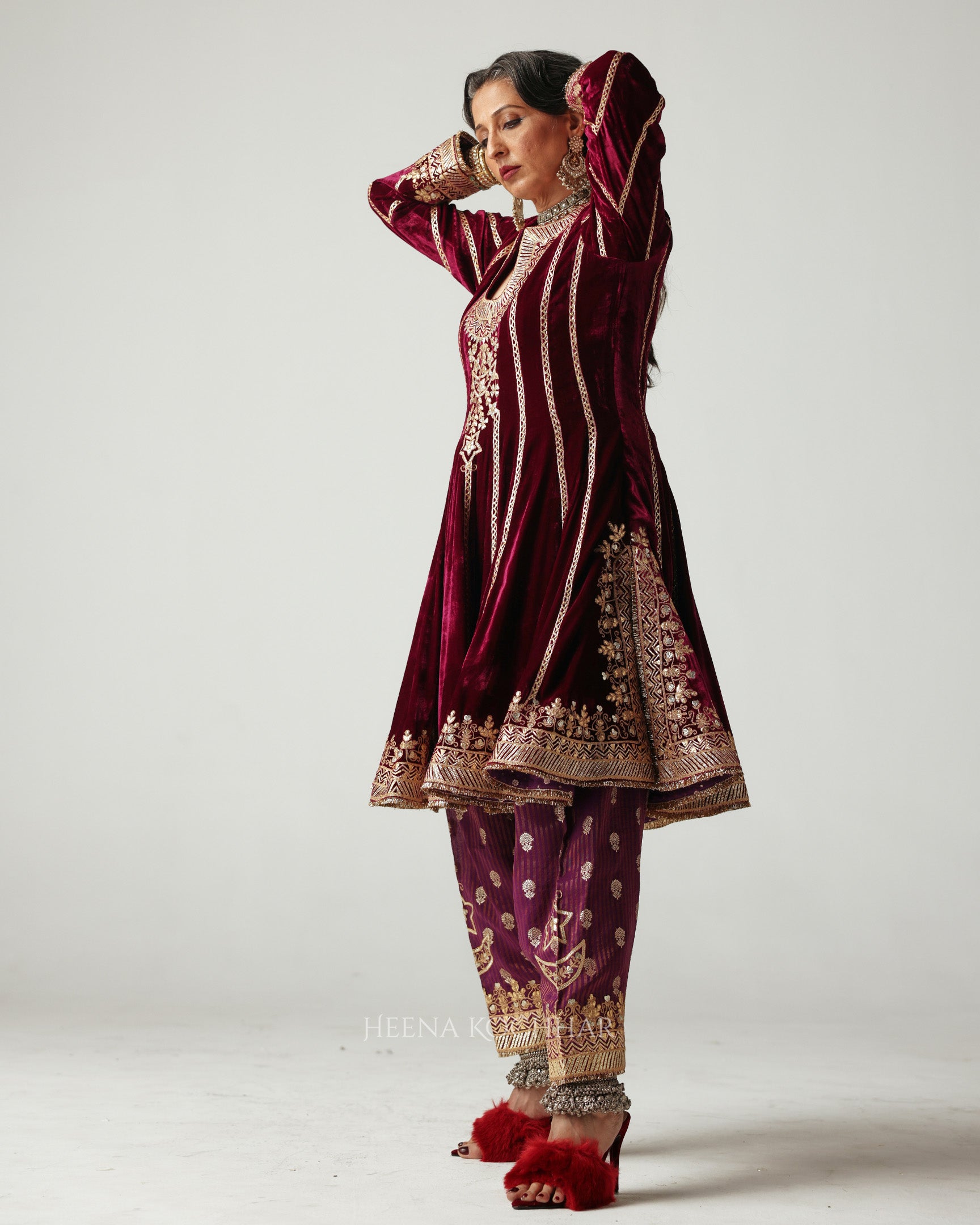 Celebrate the season in this wine velvet Anarkali set, exuding winter festivity and regal charm. Paired with a purple weave tissue salwar for a rich contrast, the look blends tradition with elegance.