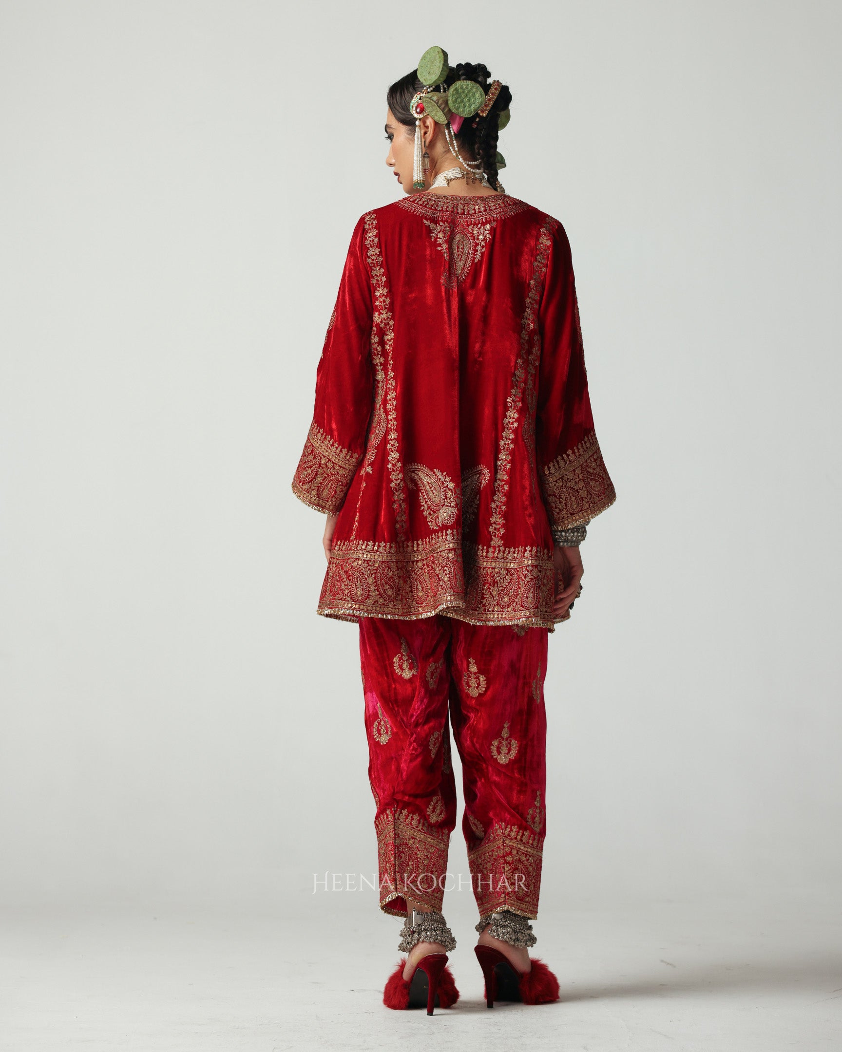 A classic Heena Kochhar Chaand Boota choga, crafted in rich red velvet, intricately embroidered using zari ari technique that lends it a luminous festive charm.