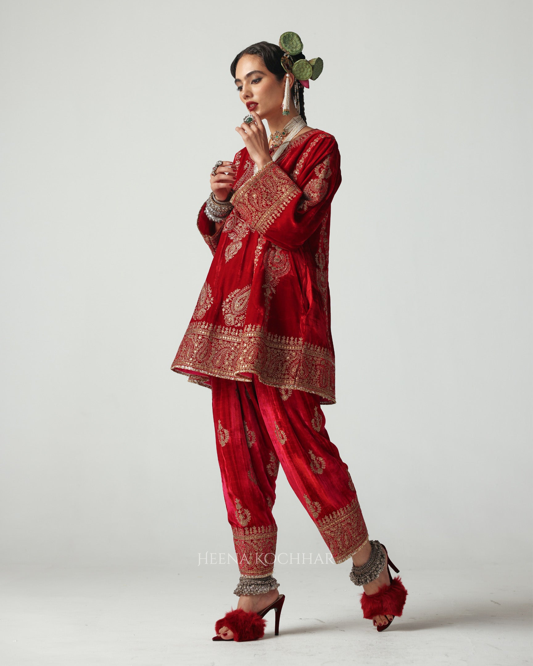 The look is paired with a red-rani tie-dye velvet salwar and a rani weave dupatta, creating a harmonious play of tones and textures - a celebration of timeless craftsmanship and royal elegance.