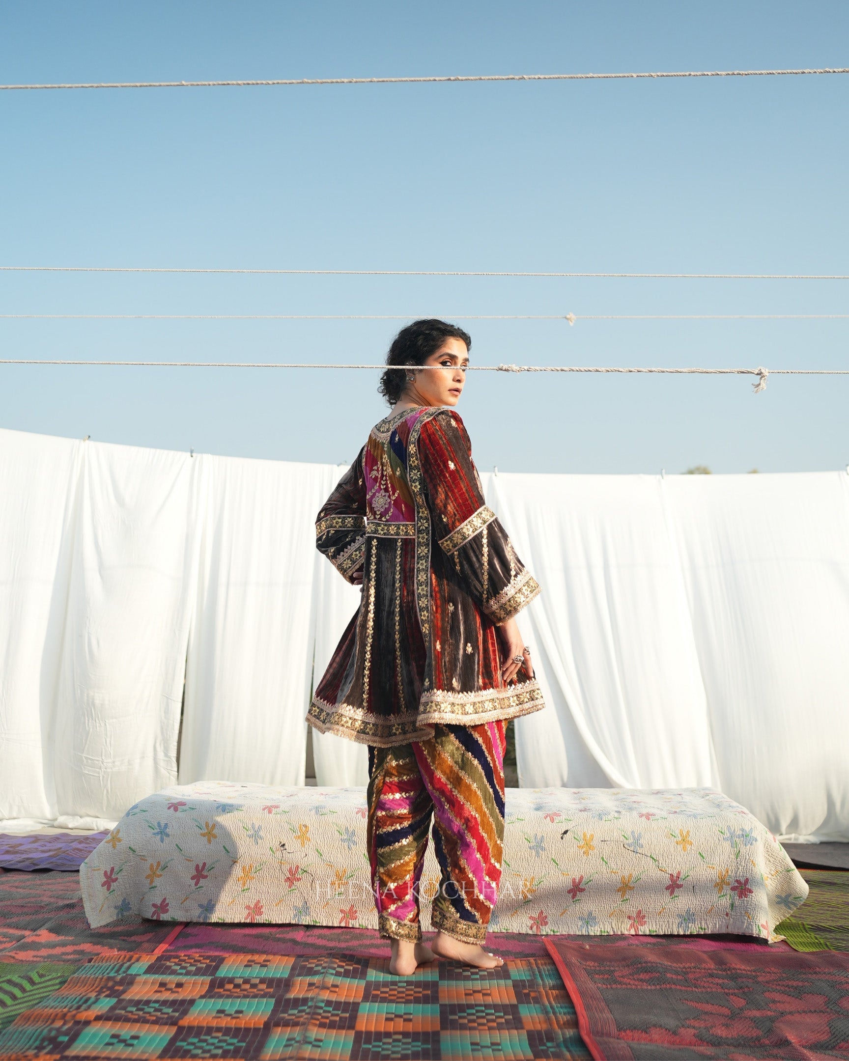This clay and rust tie-dye choga set features a silk velvet choga kurta highlighted with a rich tie-dye pattern. It is paired with a multi stripe silk velvet salwar and a clay weave tissue odhani, creating a balanced and coordinated look. Finished with gota ari embroidery, the set reflects traditional craftsmanship with a contemporary tone.