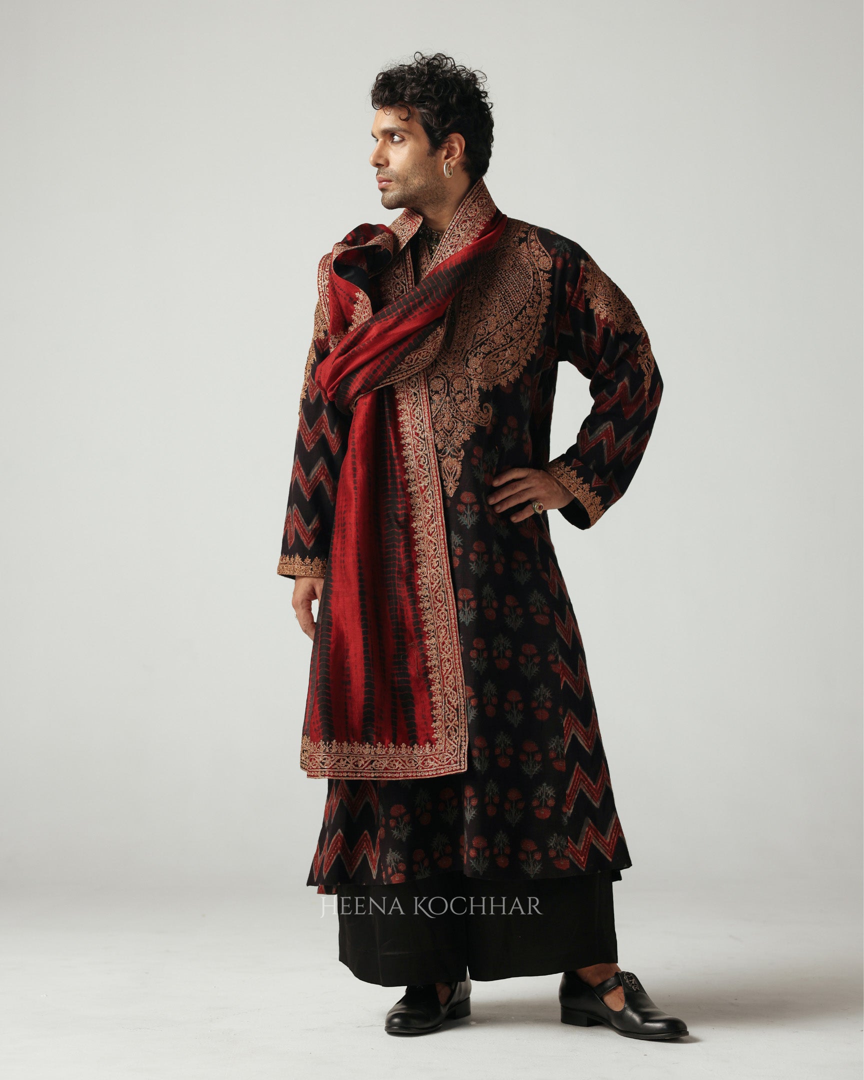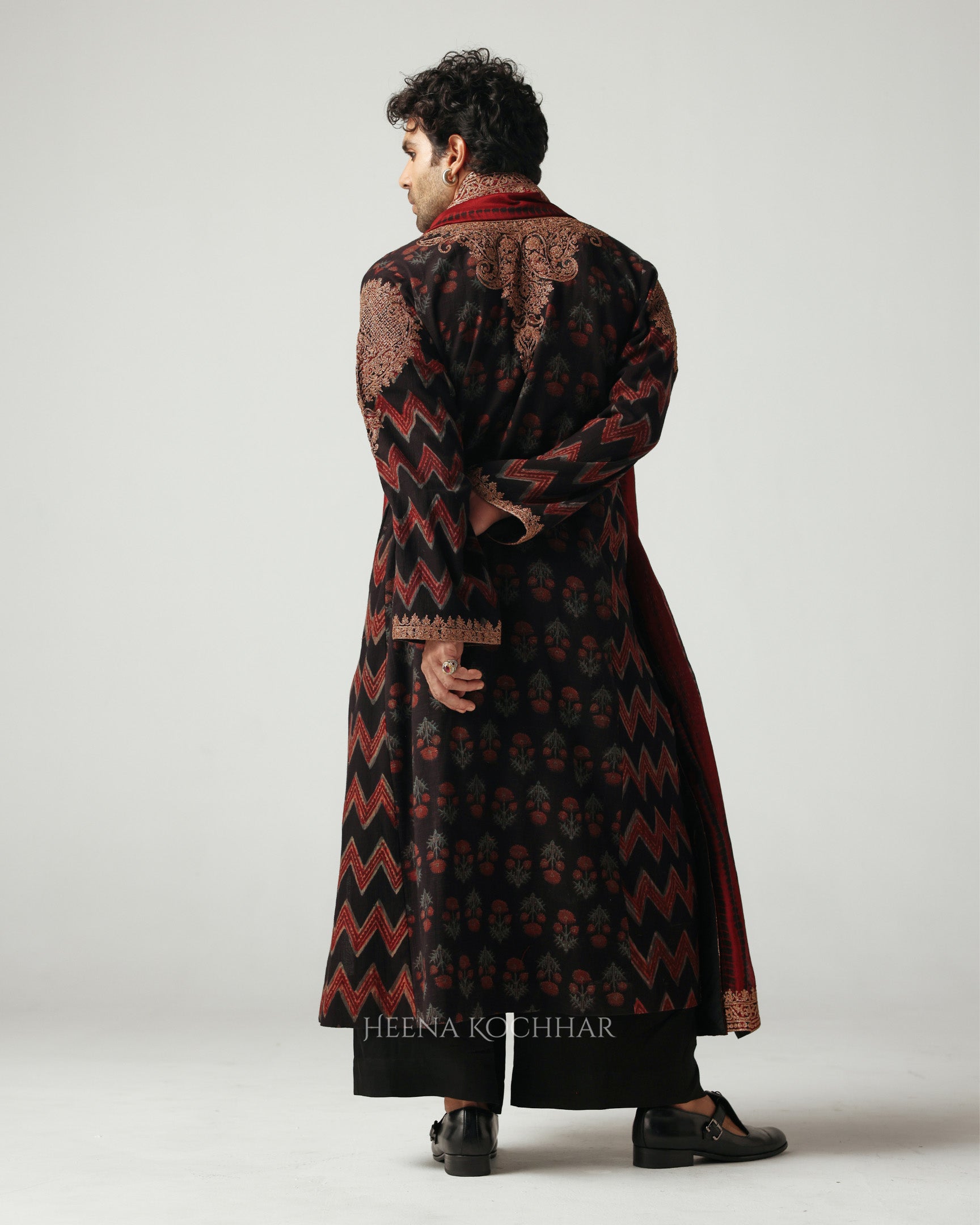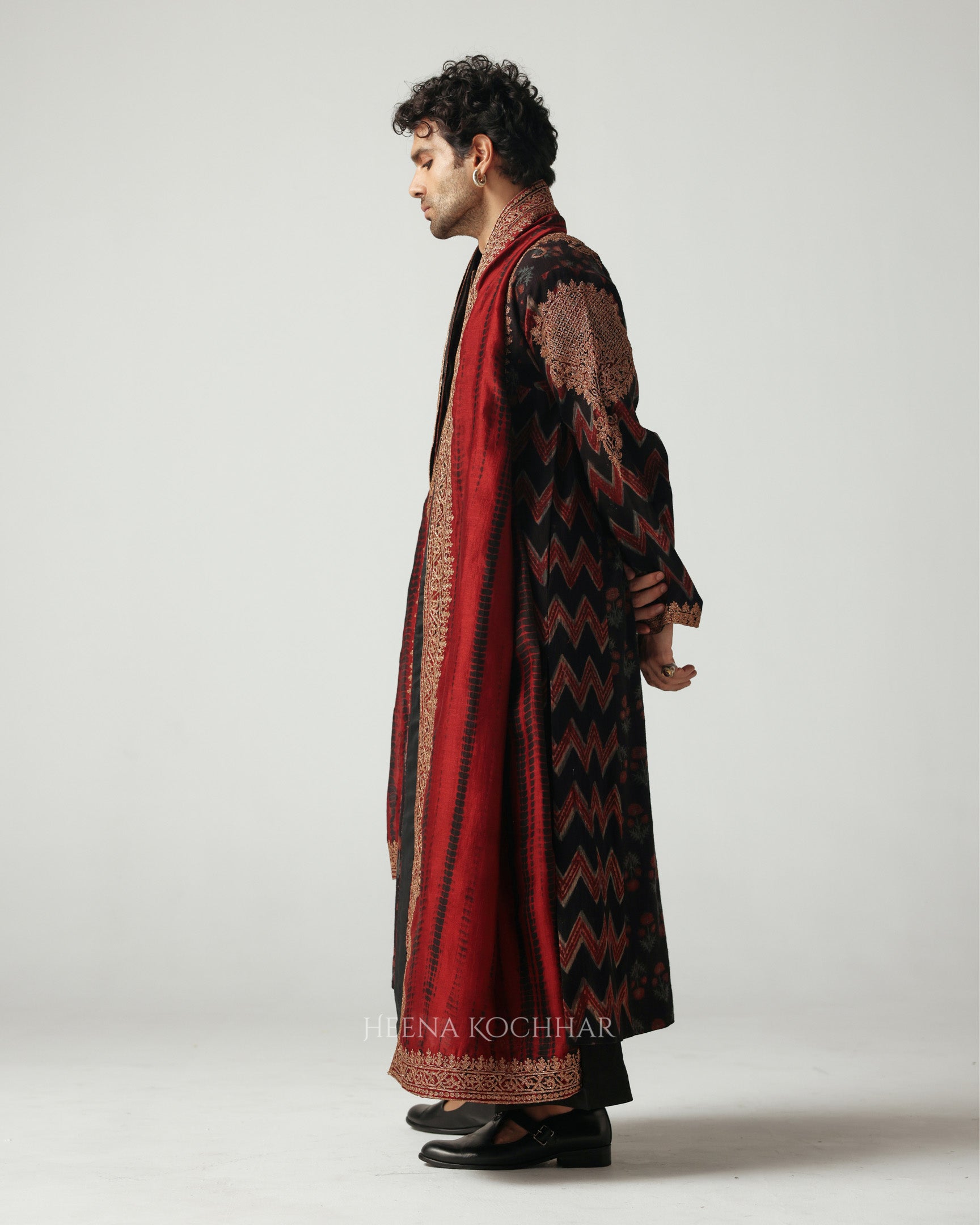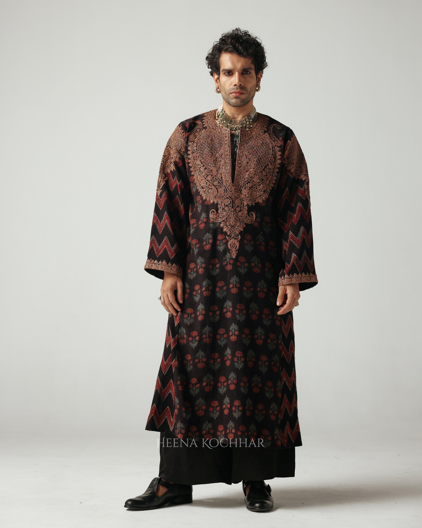 Draped in an Ajrakh linen long choga, this ensemble beautifully blends craft and comfort. The choga is adorned with zari dori embroidery, adding a subtle glimmer to the earthy tones of the Ajrakh.