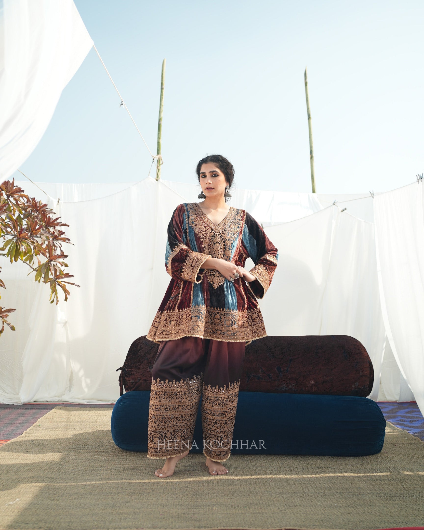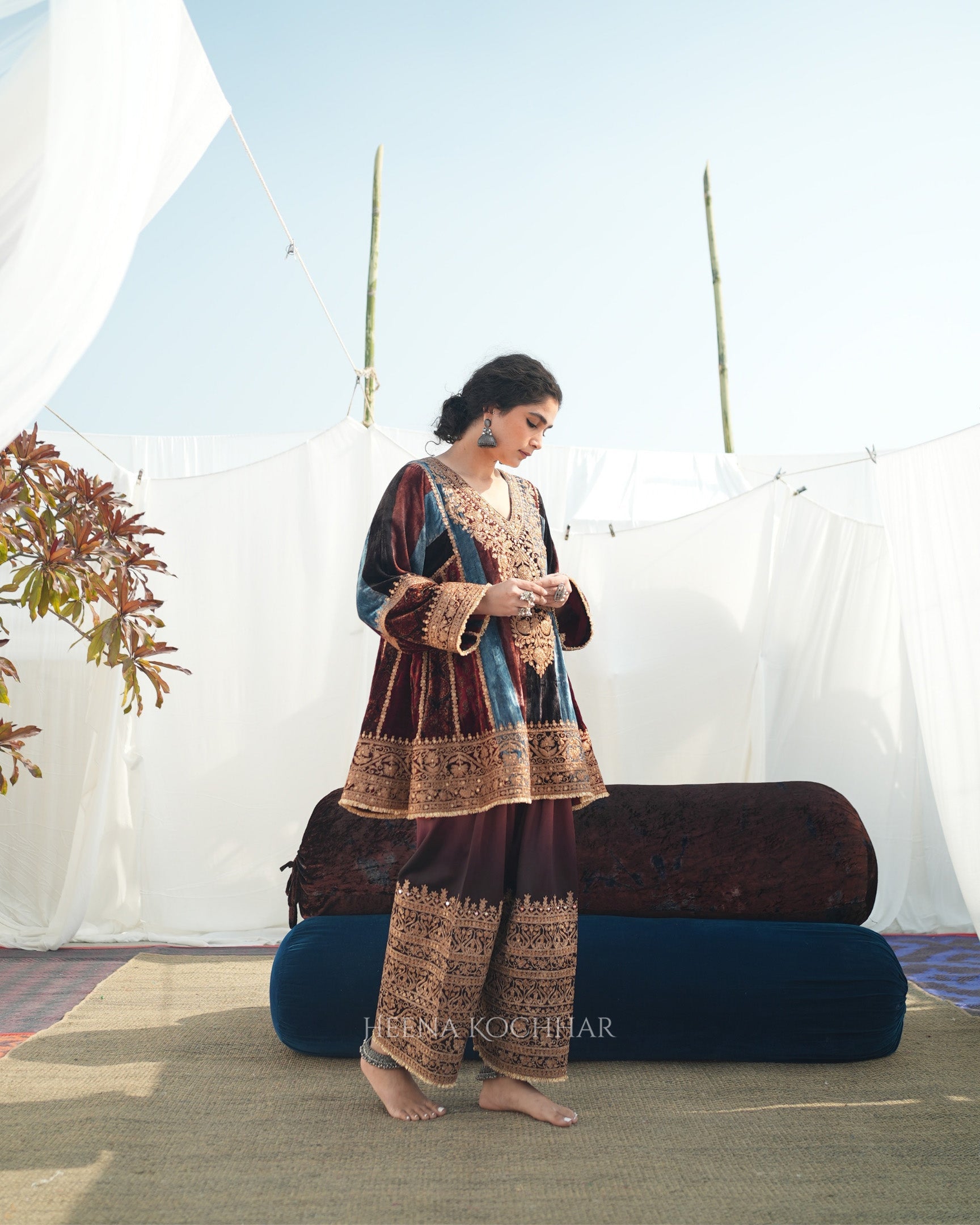 This choga set features a blue ajrakh velvet choga kurta paired with a maroon-black ombre mashroo silk salwar and a maroon weave tissue odhani. The mix of ajrakh pattern and ombre tones creates a rich and coordinated festive look. Finished with zari dori sitara embroidery, the set highlights fine craftsmanship with surface detail.