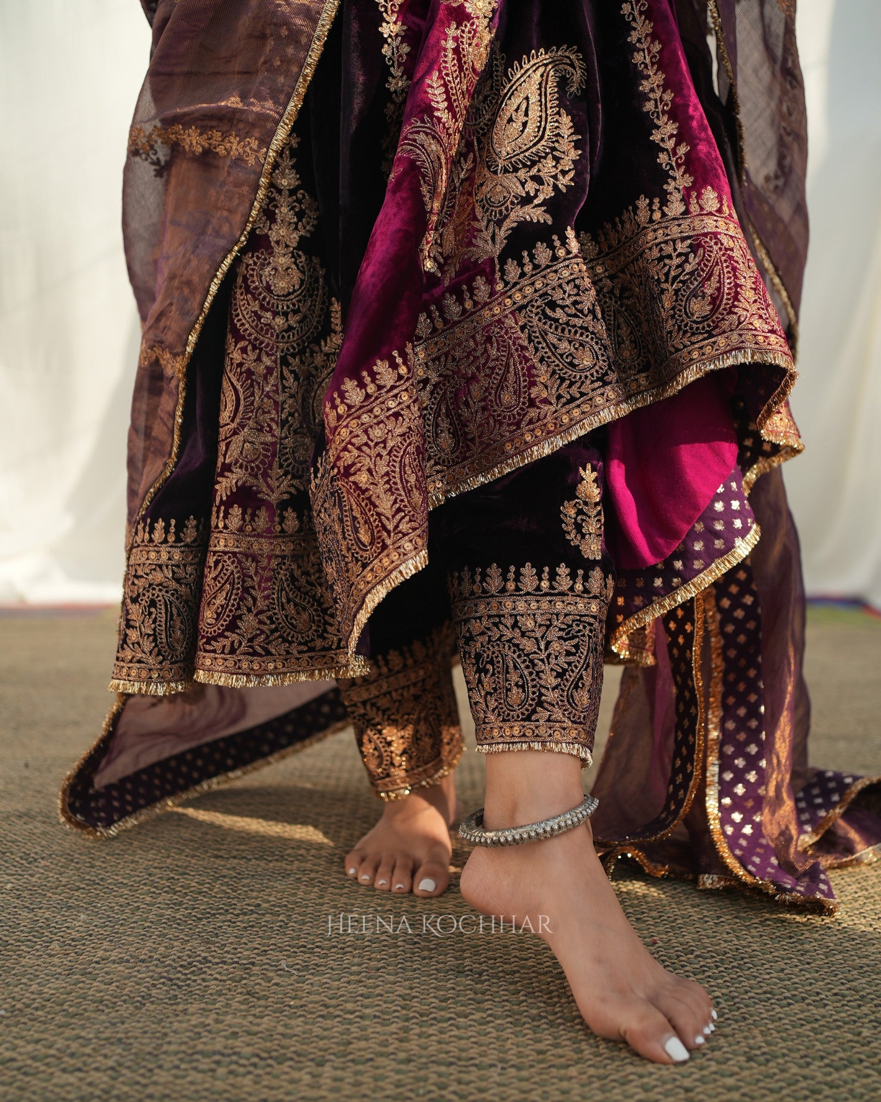 This anarkali set features a pink and purple silk velvet anarkali kurta paired with a purple silk velvet salwar and a purple weave tissue odhani, creating a coordinated festive look. The rich velvet texture and tonal palette add depth to the ensemble. Finished with zari ari sitara embroidery, the set highlights fine craftsmanship with refined surface detail.