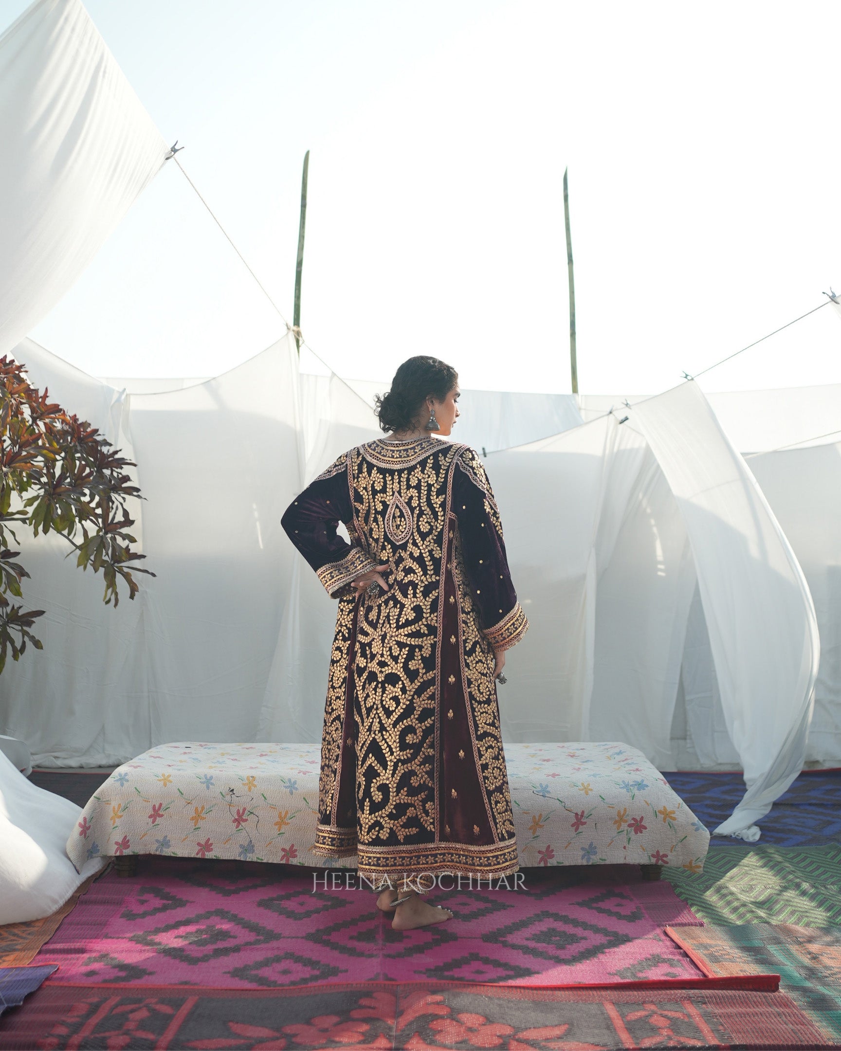 This kurta set features a maroon and purple silk velvet kurta paired with a maroon silk velvet salwar and a maroon weave tissue odhani. The rich colour palette and soft texture create a coordinated festive look. Finished with gota ari embroidery, the set highlights traditional craftsmanship with a refined appeal.