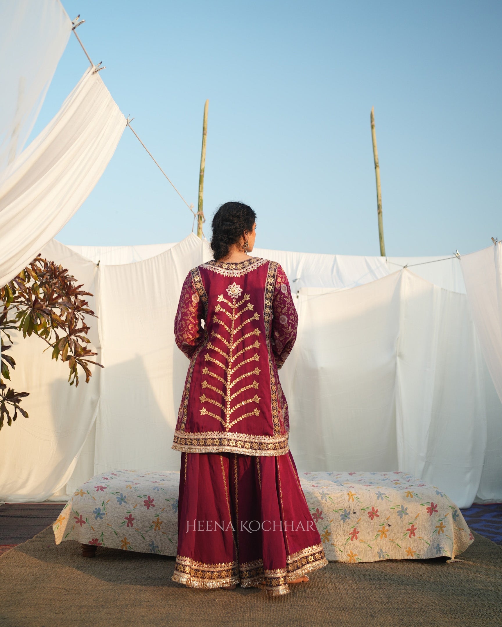 This choga set features a rani pink monga silk choga kurta paired with a pink silk linen sharara and a purple weave tissue odhani, creating a vibrant and coordinated festive look. Finished with gota ari embroidery, the set highlights traditional craftsmanship with refined surface detail.