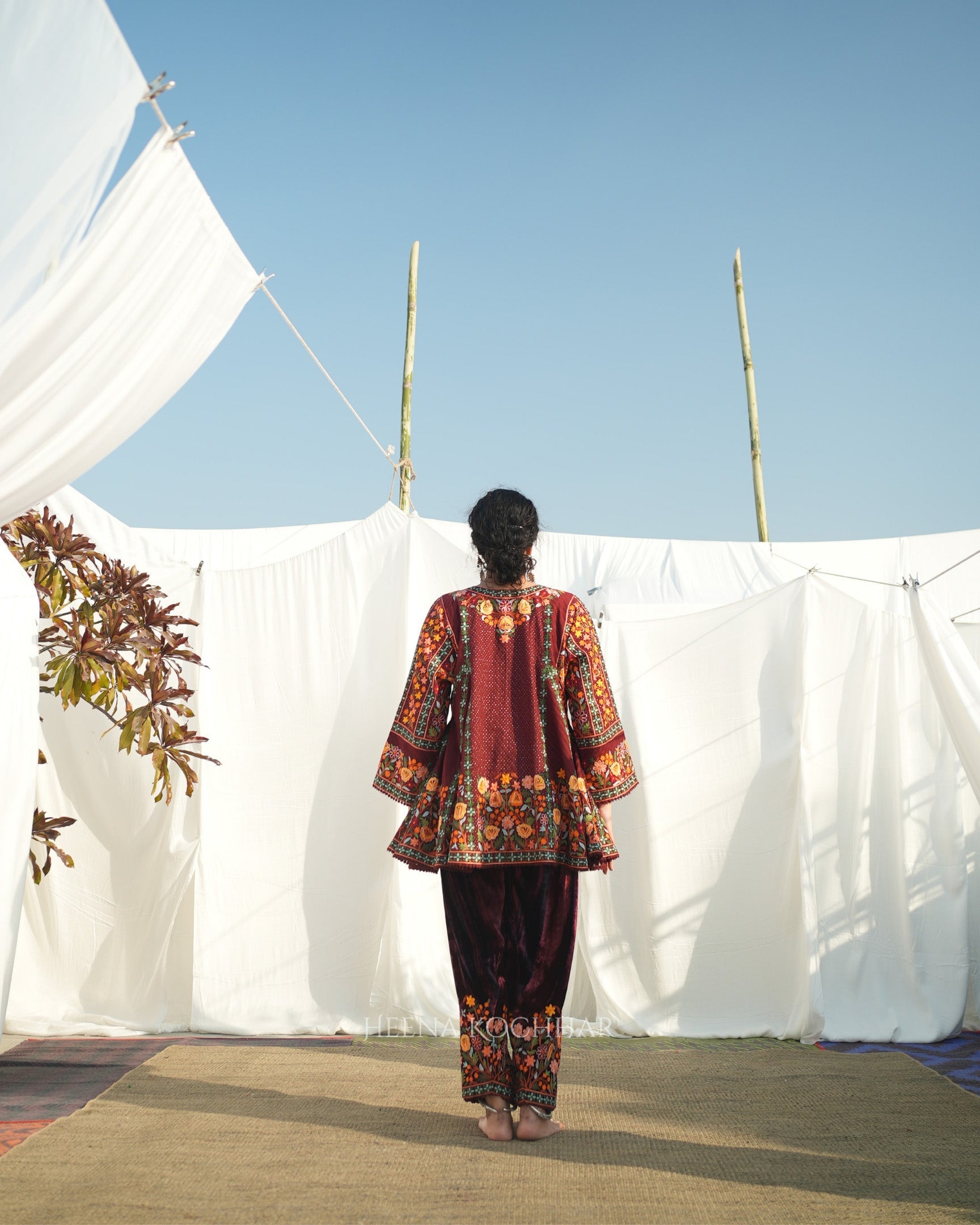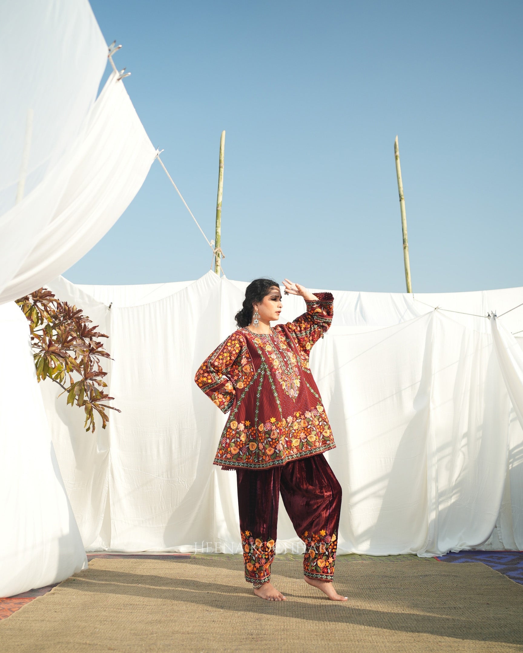 This choga set features a maroon handloom chanderi choga kurta paired with a maroon and purple tie-dye silk velvet salwar, creating a rich and coordinated festive look. The mix of handloom chanderi and silk velvet adds texture and depth. Finished with multi resham ari embroidery, the set highlights traditional craftsmanship with refined surface detail.