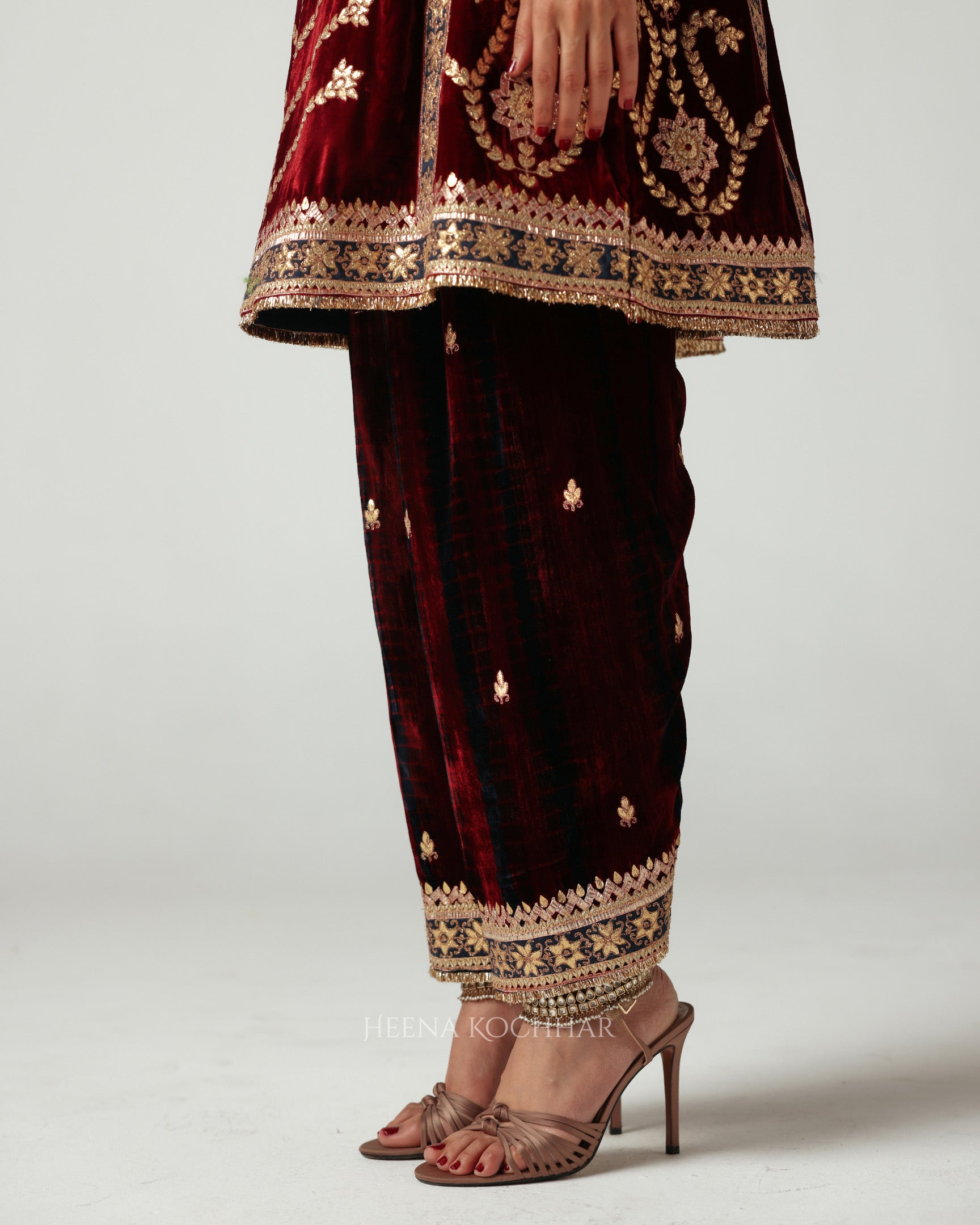 Draped in the richness of maroon velvet, this ensemble pairs a maroon and teal coloured tie-dye salwar with a flowing choga, creating a symphony of depth and texture.