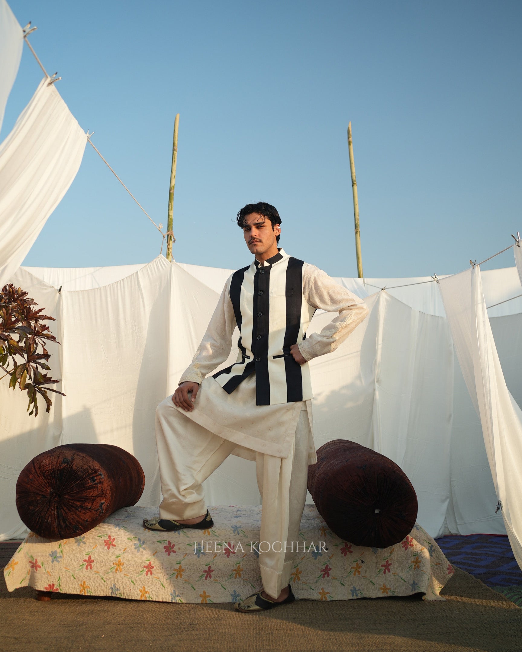 This menswear bundi jacket is crafted in black and white stripe silk linen, offering a clean and structured festive look. The strong stripe pattern and lightweight fabric make it easy to layer over kurtas, shirts.