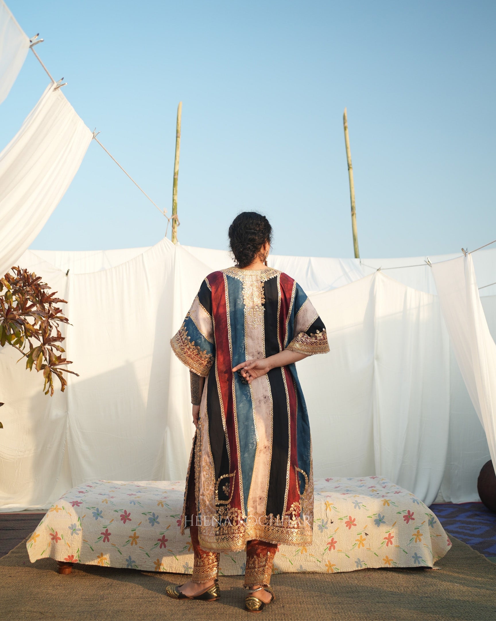 This kaftan set features an ajrakh stripe silk linen kaftan paired with a maroon weave tissue salwar, creating a rich and coordinated festive look. The combination of ajrakh stripes and silk velvet adds depth and texture. Finished with gota ari embroidery, the set highlights traditional craftsmanship with refined surface detail.