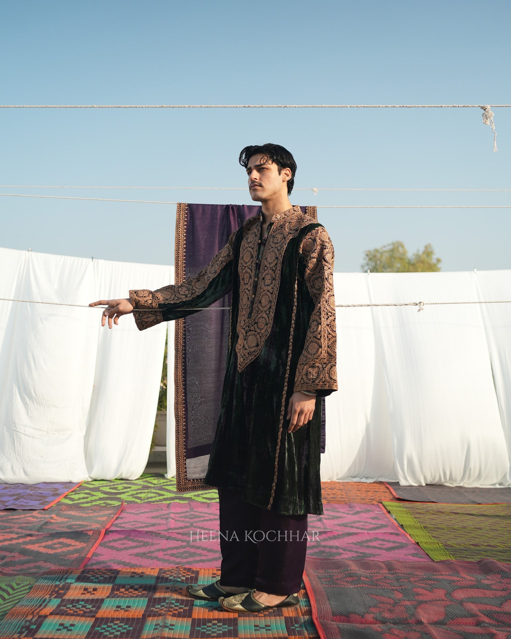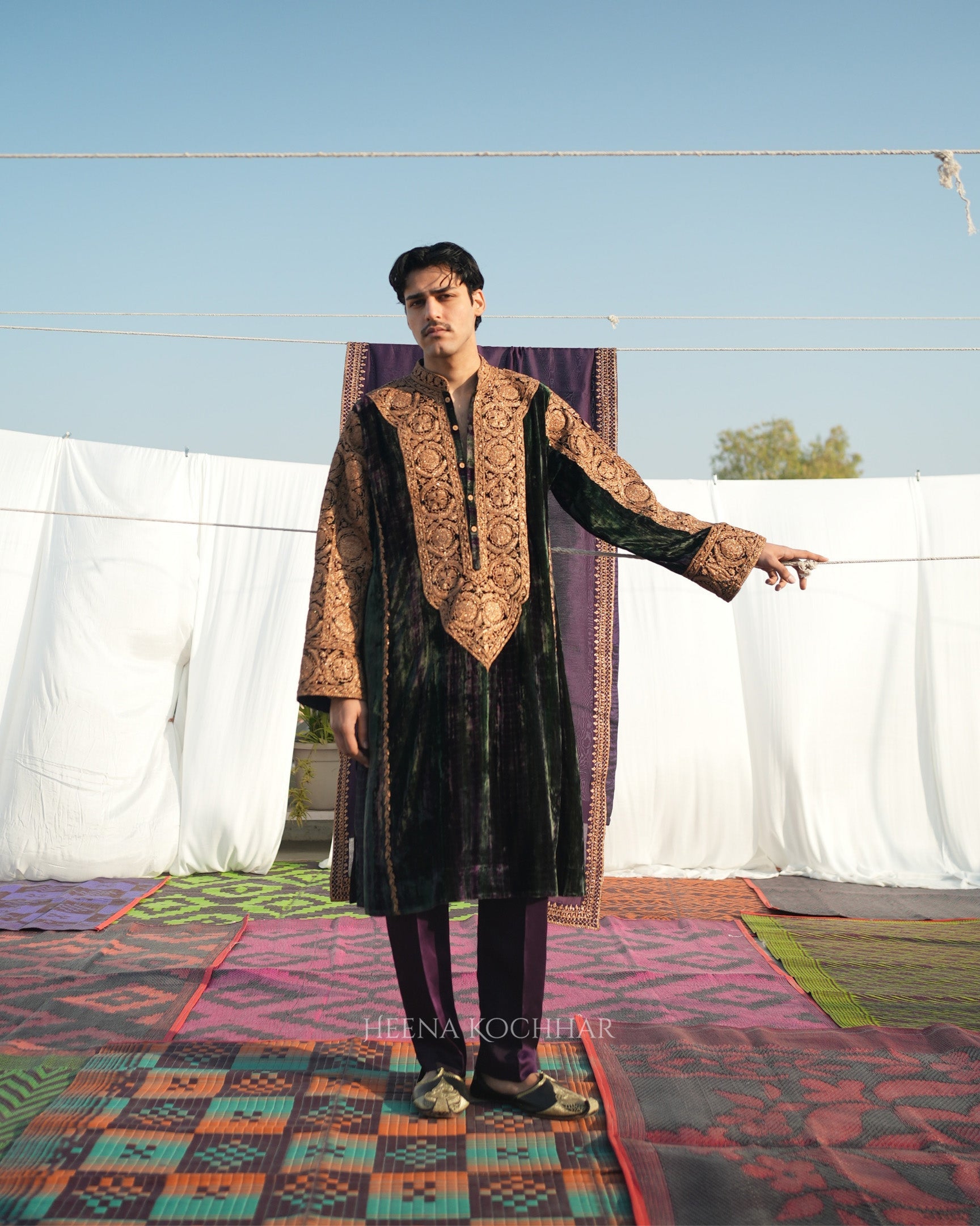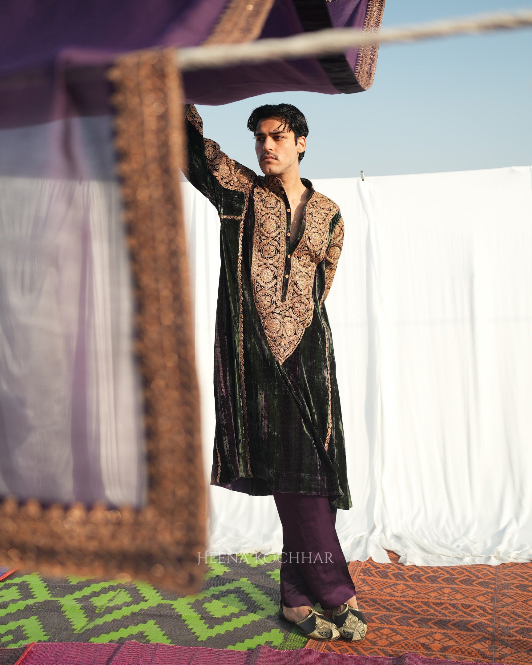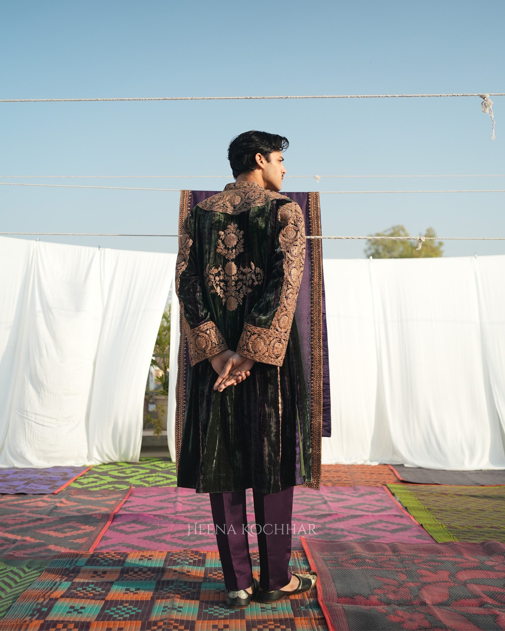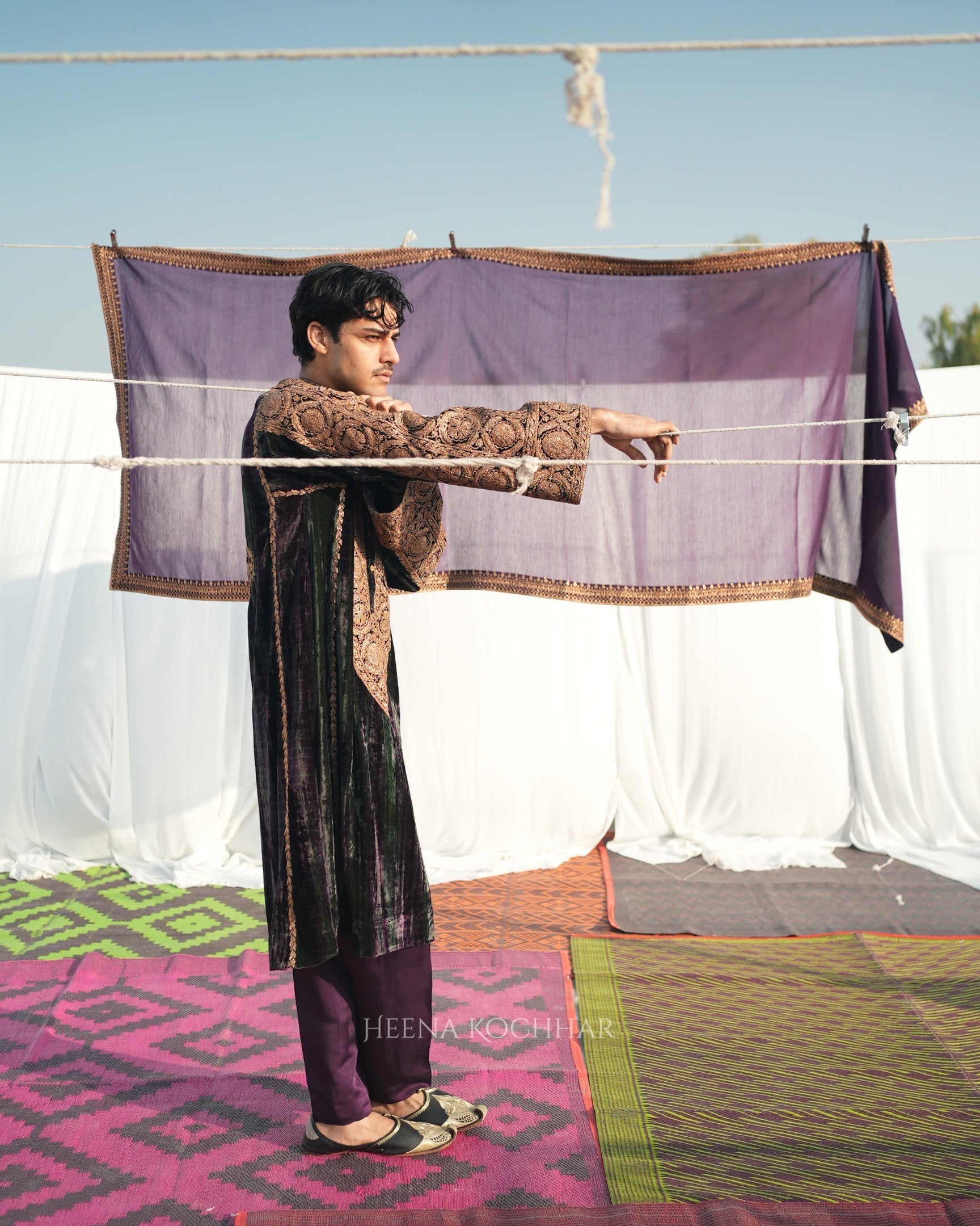This menswear choga set features a green and purple tie-dye silk velvet choga kurta with a rich surface texture. It is paired with a purple silk linen pant and a purple chanderi odhana, creating a coordinated festive look. Finished with zari dori embroidery, the set highlights traditional craftsmanship with a modern colour story.