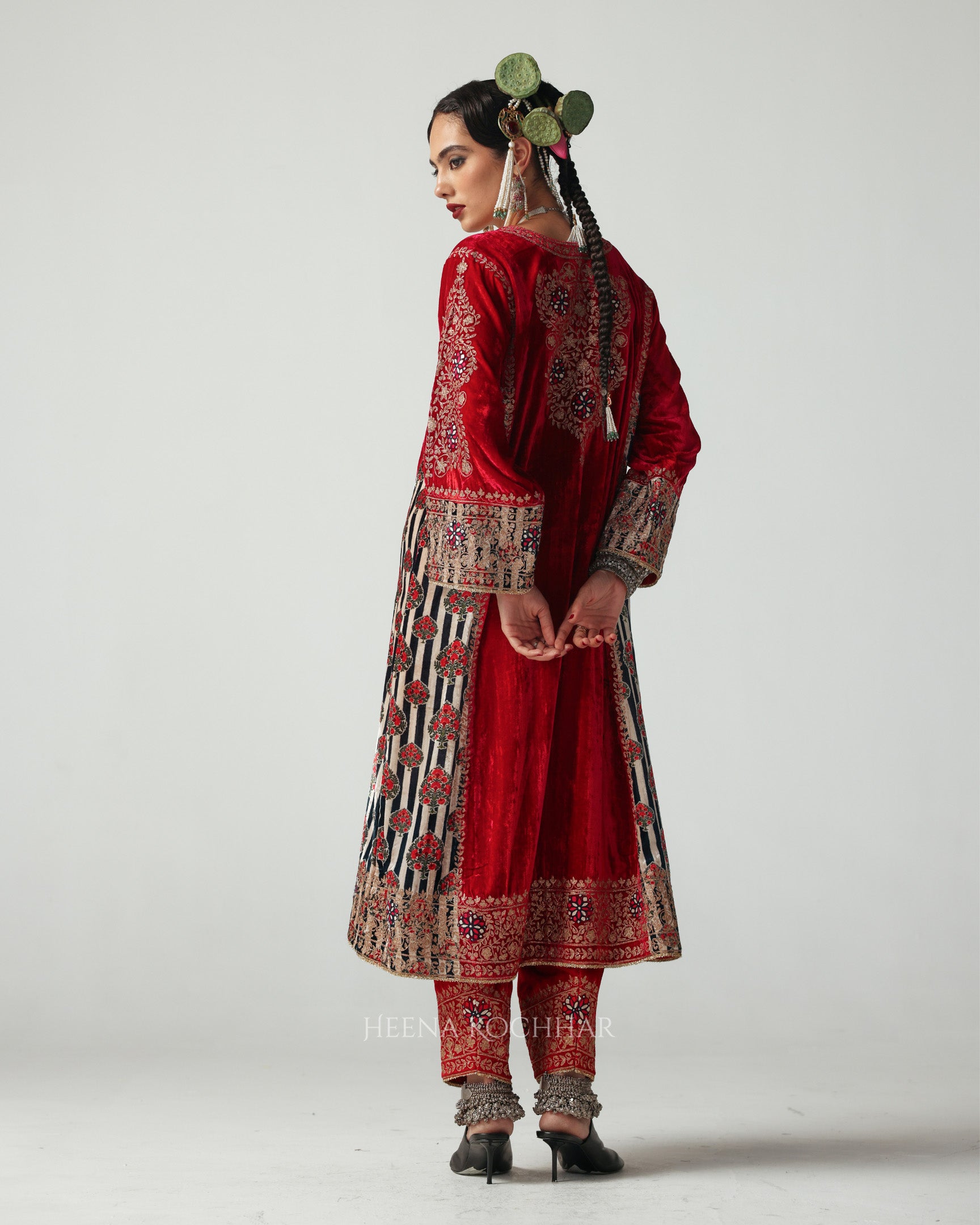 Embroidered using multi-resham aari, the choga carries a vibrant yet elegant feel. It is paired with a red velvet salwar, bringing the look together in perfect balance.
