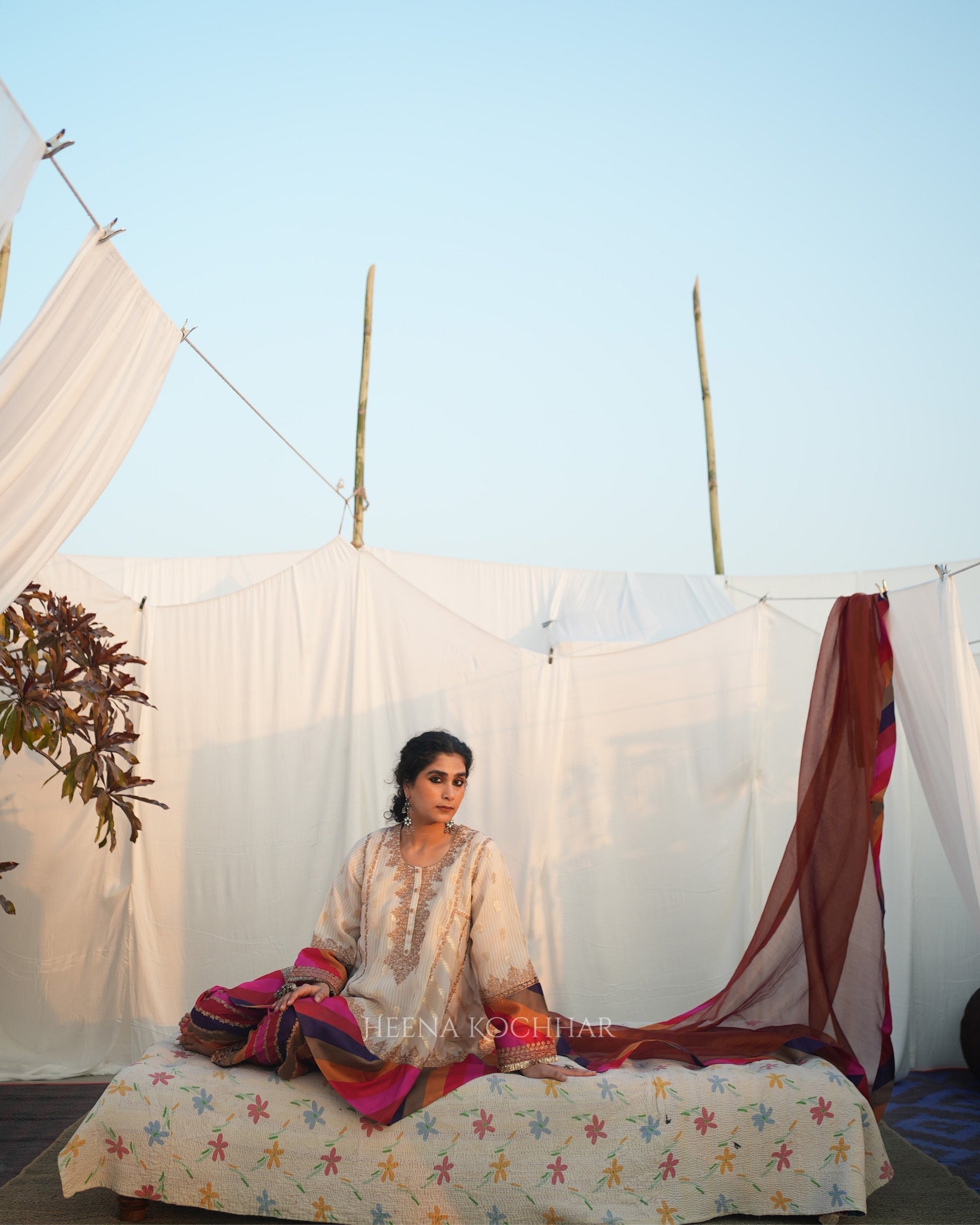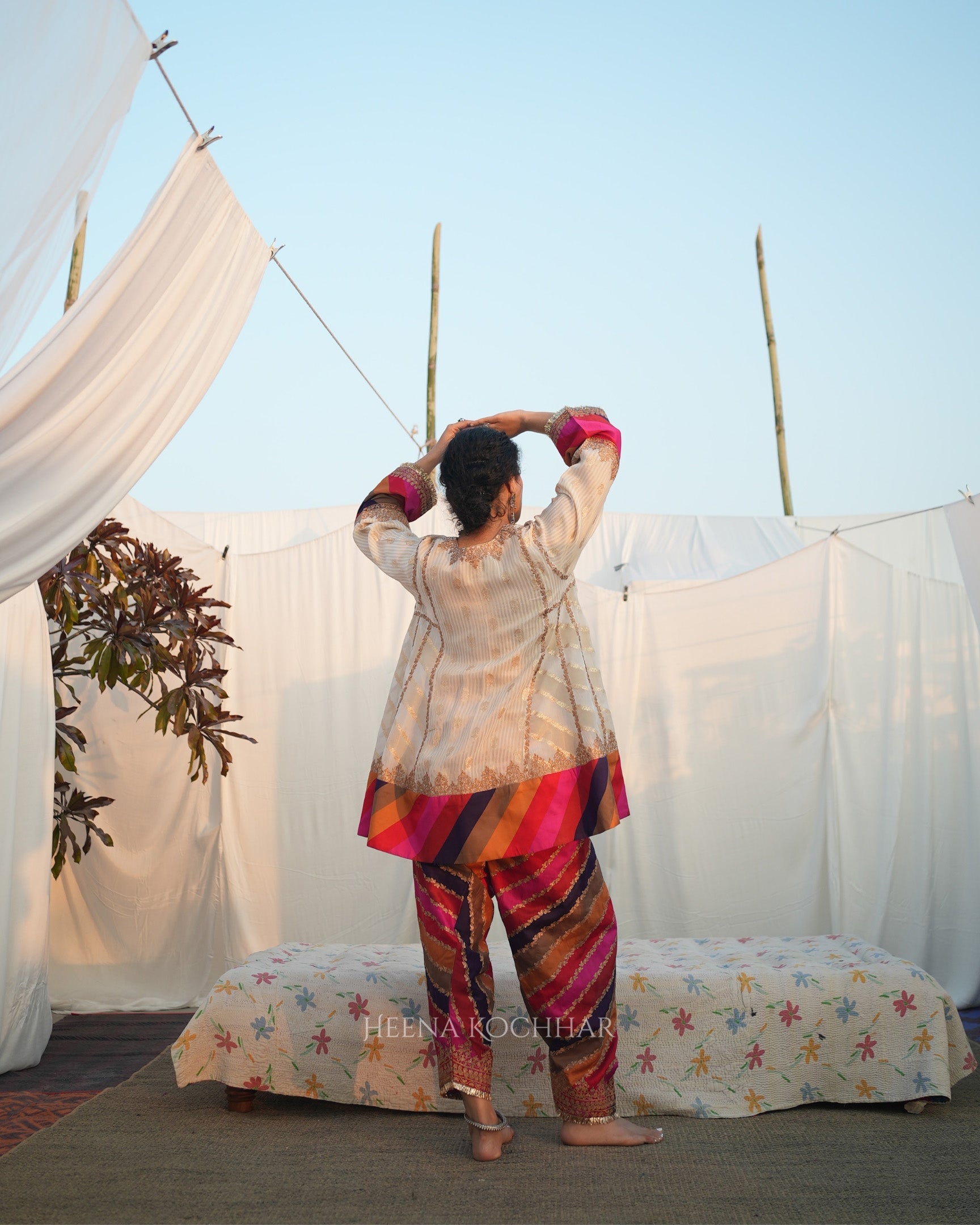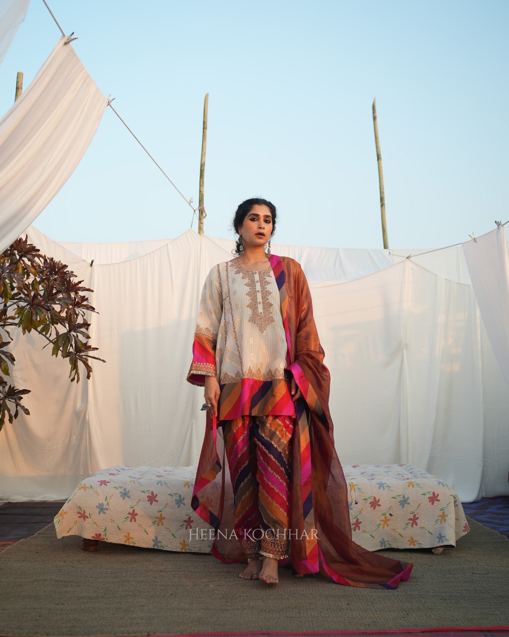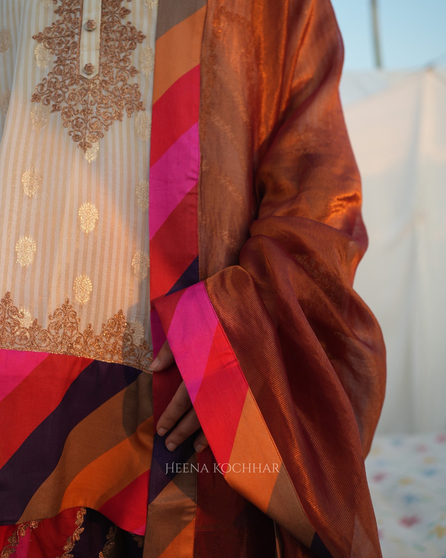 This choga set features an ivory weave tissue choga kurta paired with a multi stripe silk chanderi salwar and a red weave tissue odhani, creating a vibrant and coordinated festive look. Finished with zari ari embroidery, the set highlights traditional craftsmanship with refined surface detail.