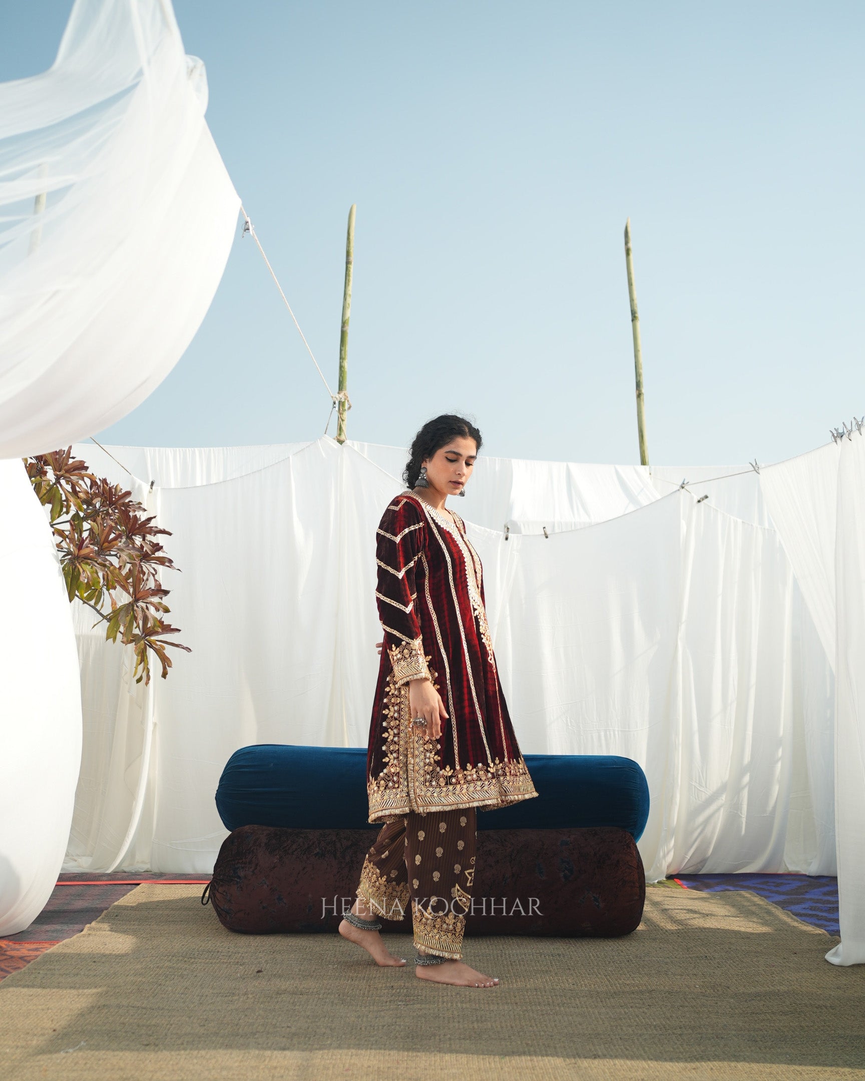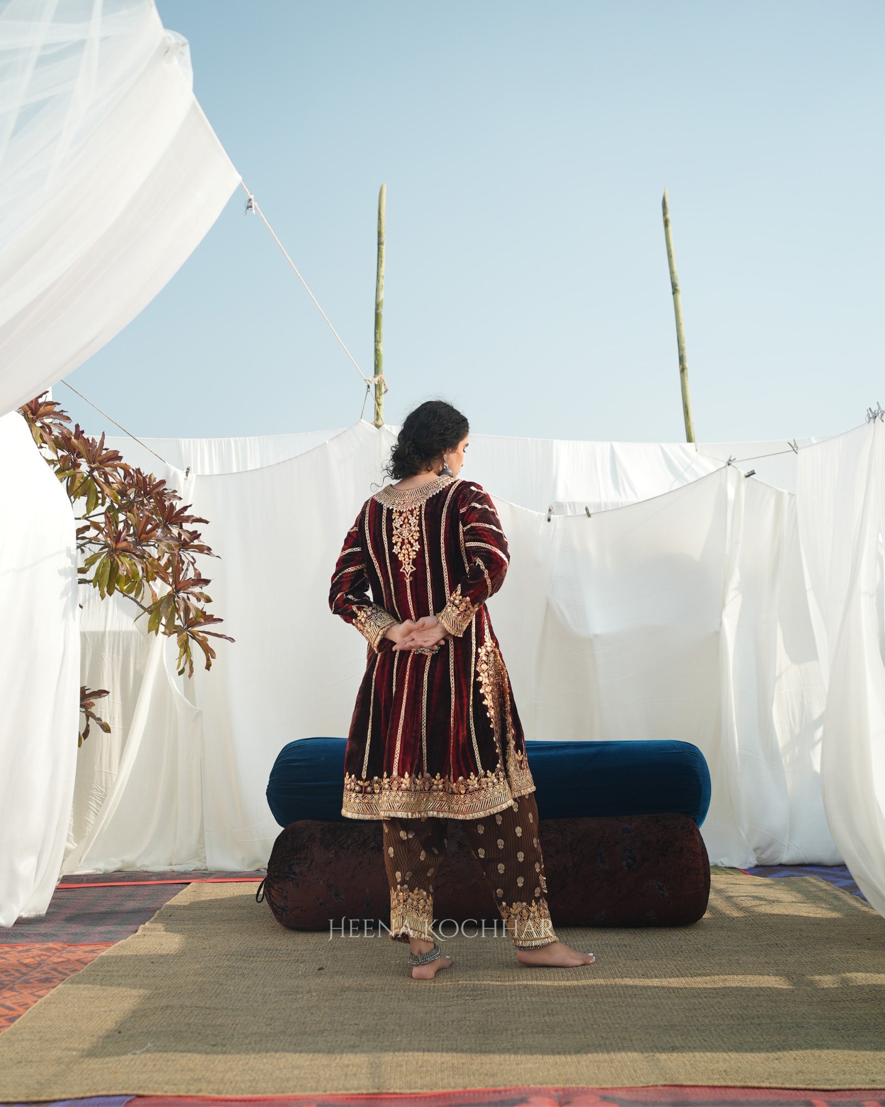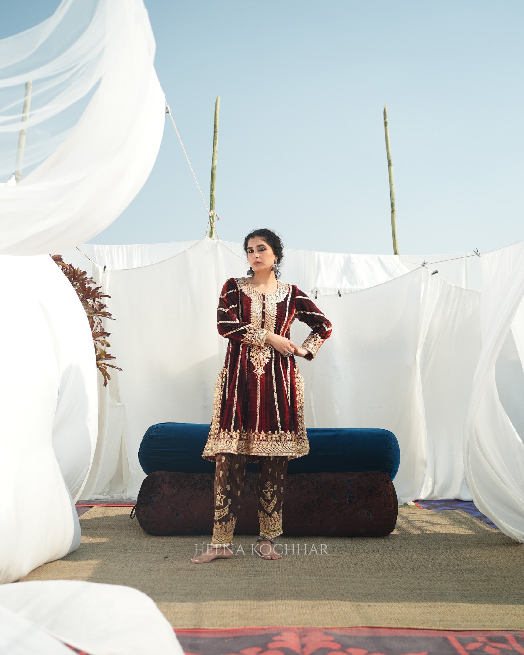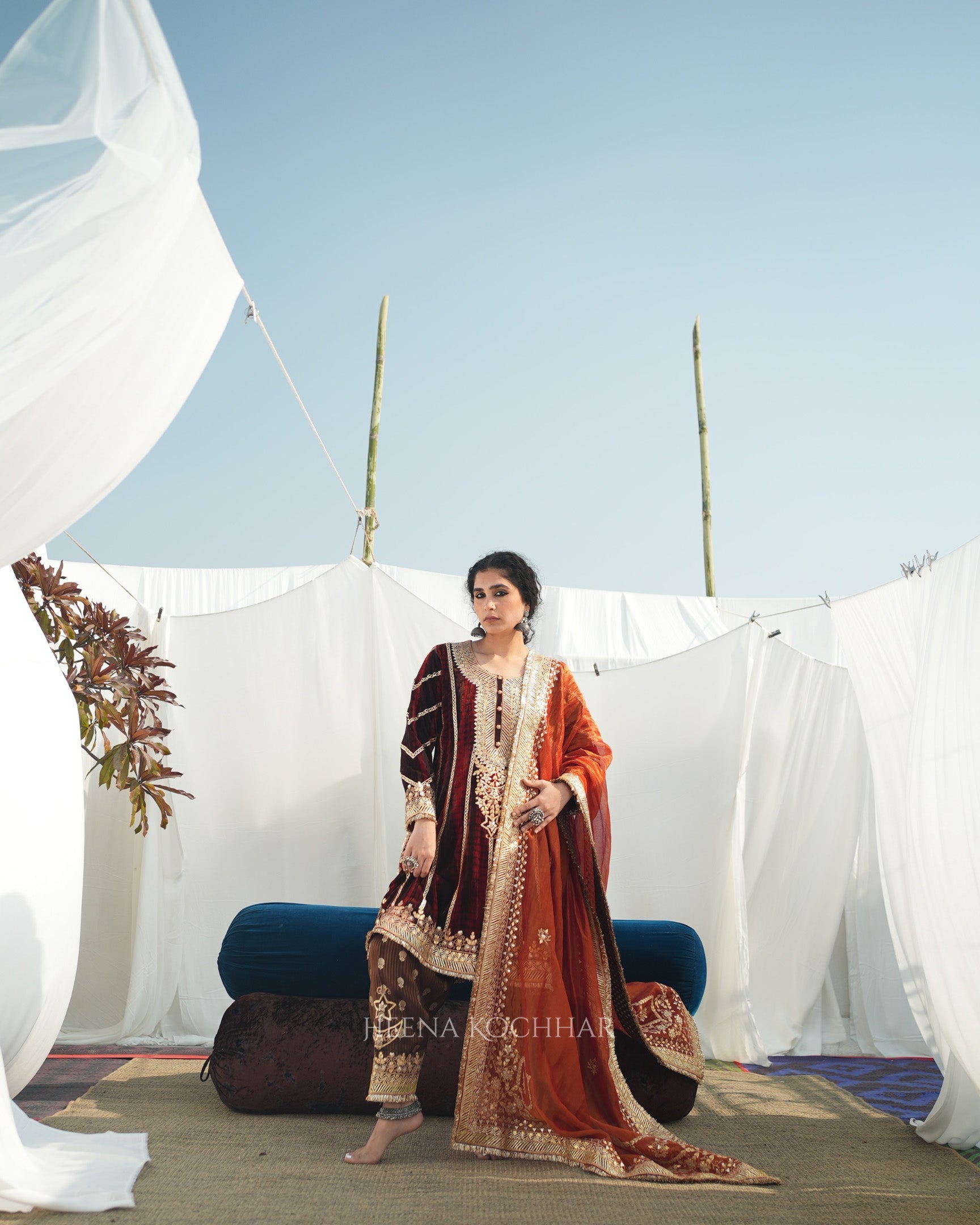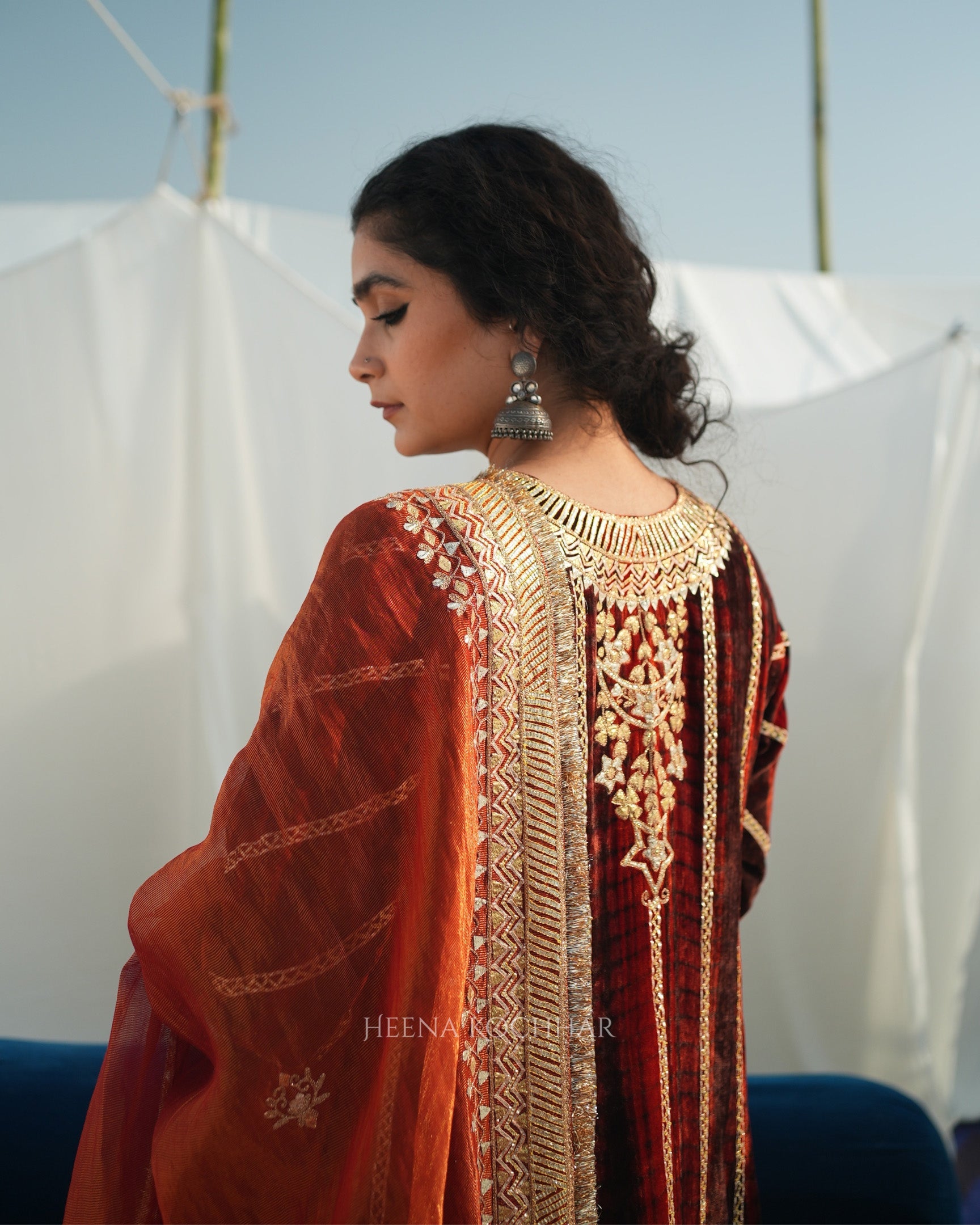 This anarkali set features a clay and rust tie-dye silk velvet anarkali kurta paired with a rust weave tissue salwar and a matching rust weave tissue odhani. The coordinated tones and soft textures create a balanced festive look. Finished with gota ari embroidery, the set highlights traditional craftsmanship with refined surface detail.