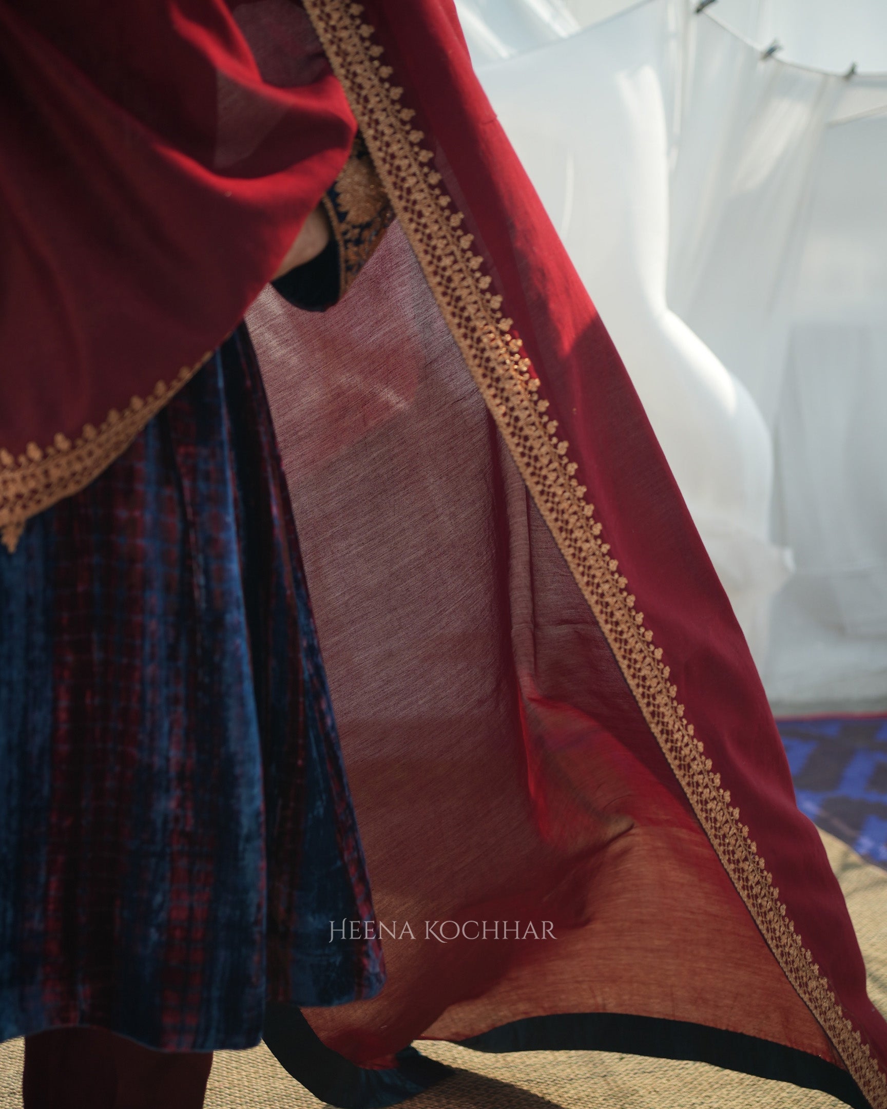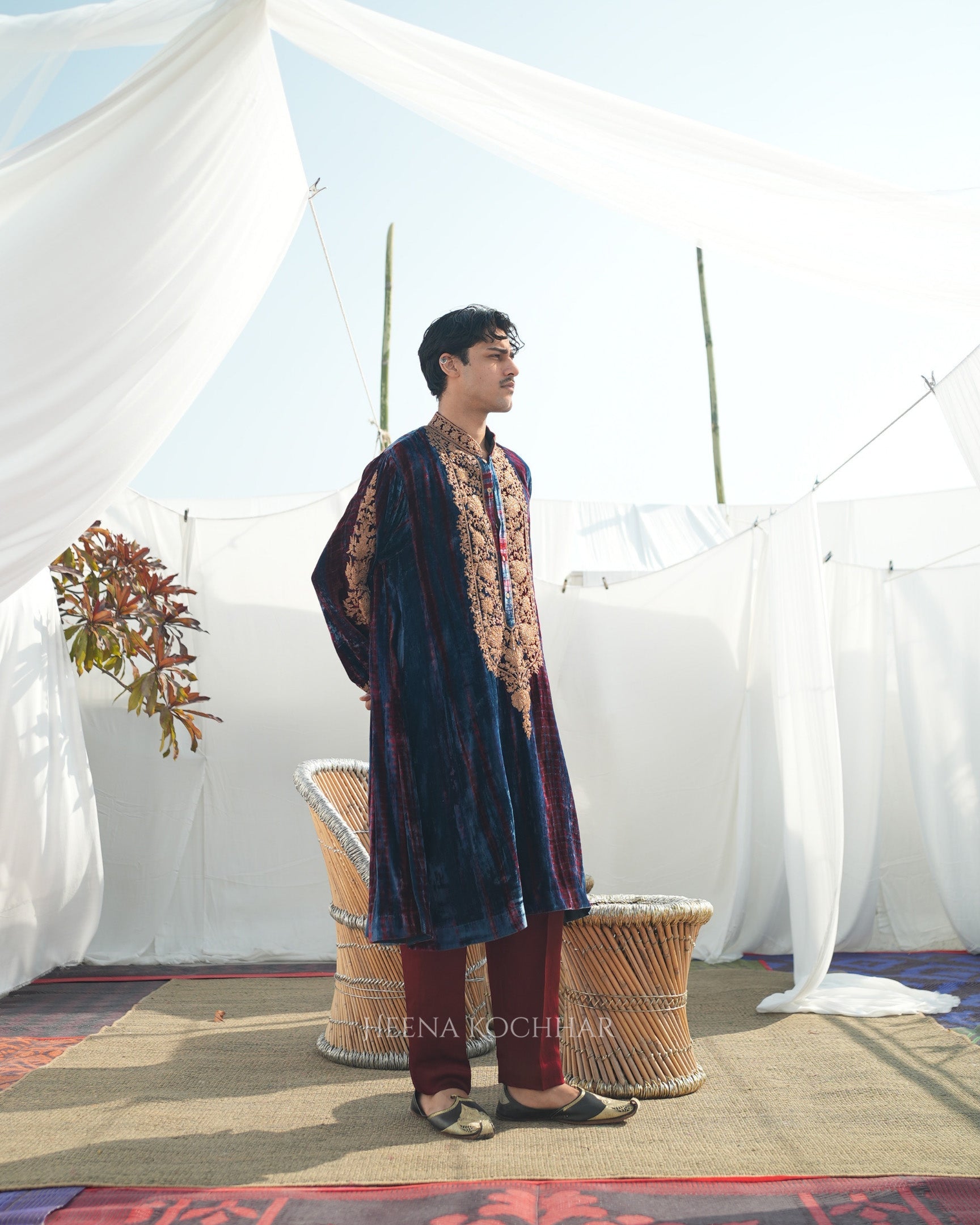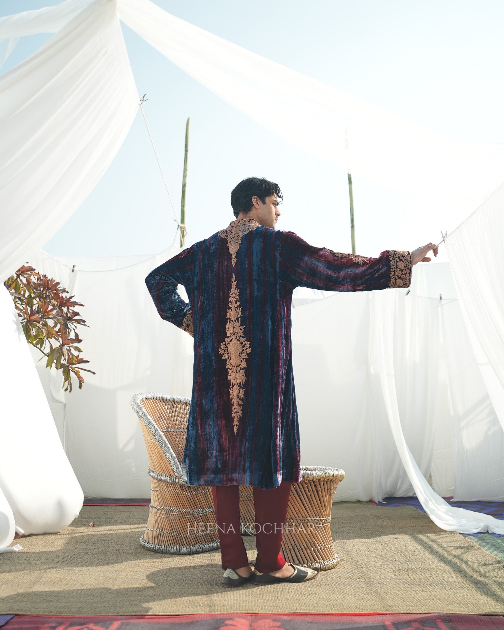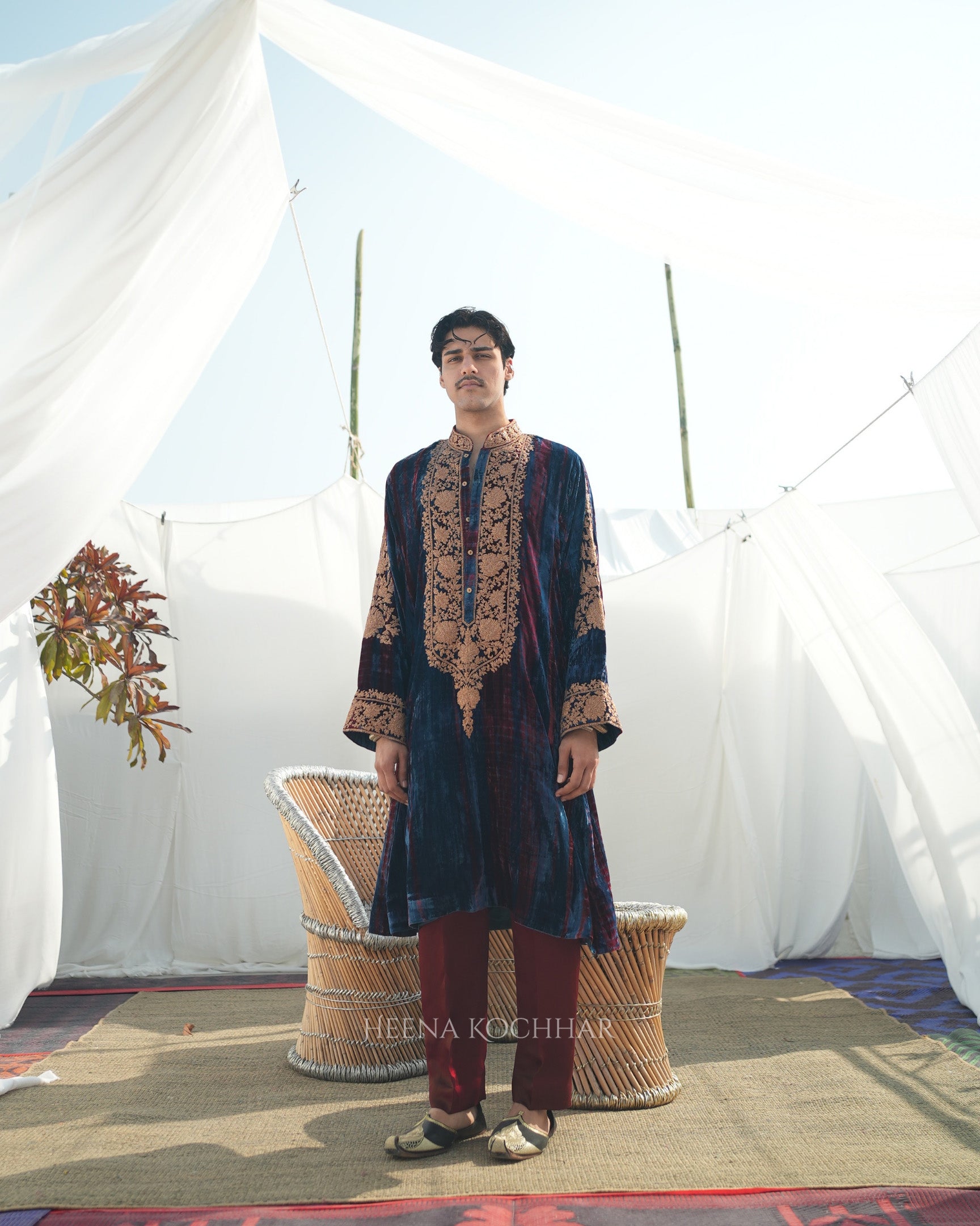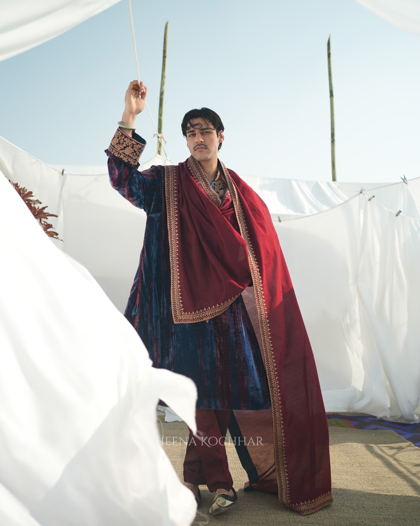 This menswear kurta set features a teal and maroon tie-dye silk velvet kurta paired with maroon silk linen pants and a maroon chanderi odhana, creating a coordinated festive look. Finished with zari dori embroidery, the set highlights traditional craftsmanship with a refined surface detail.