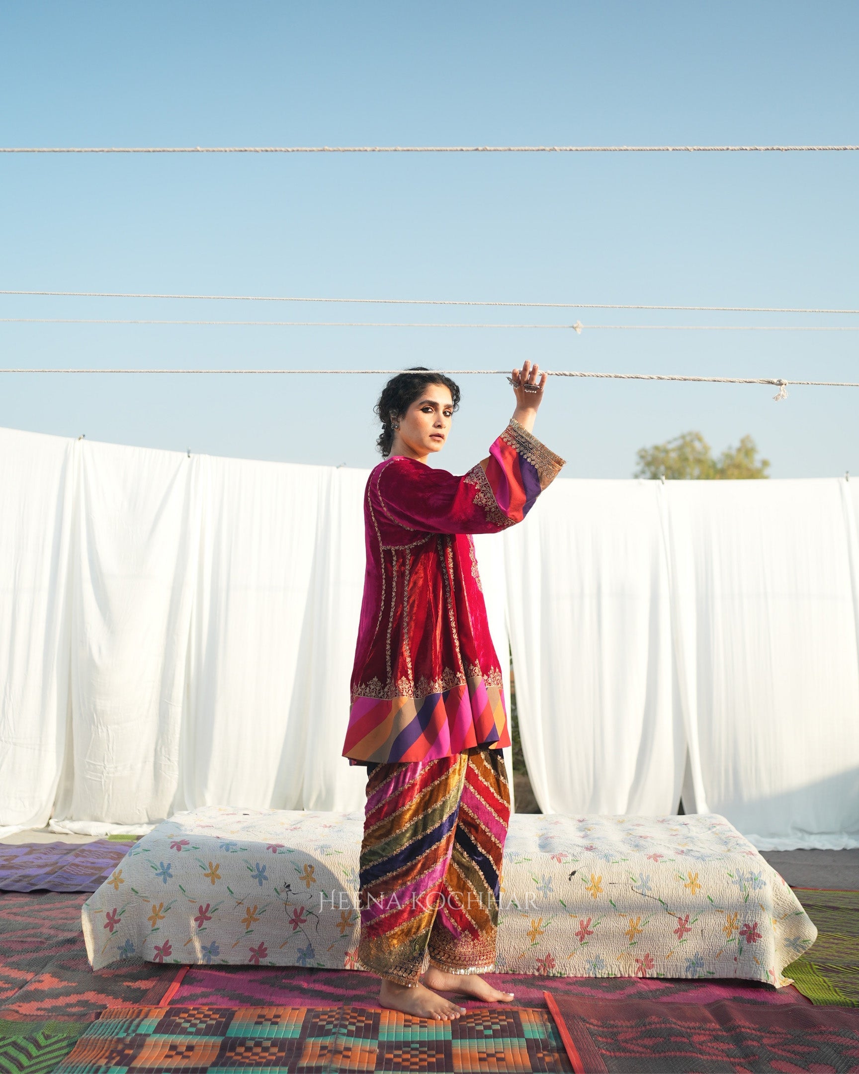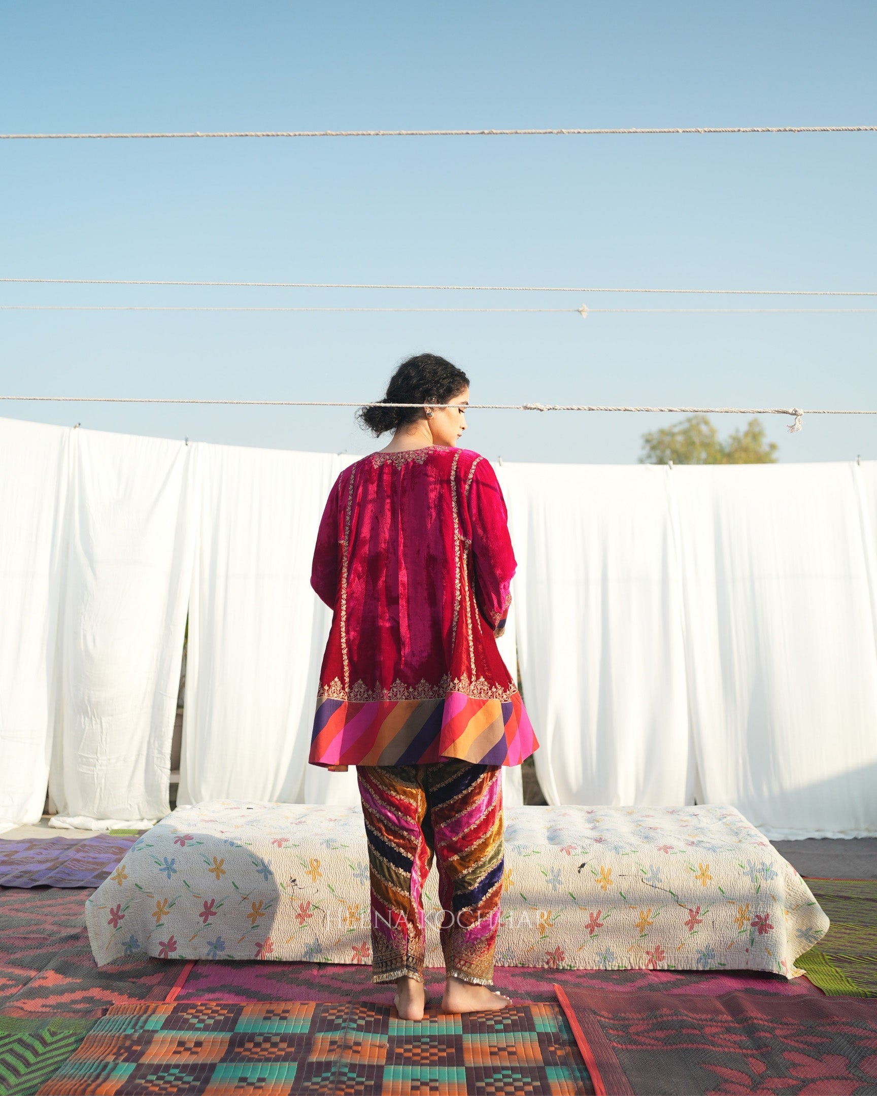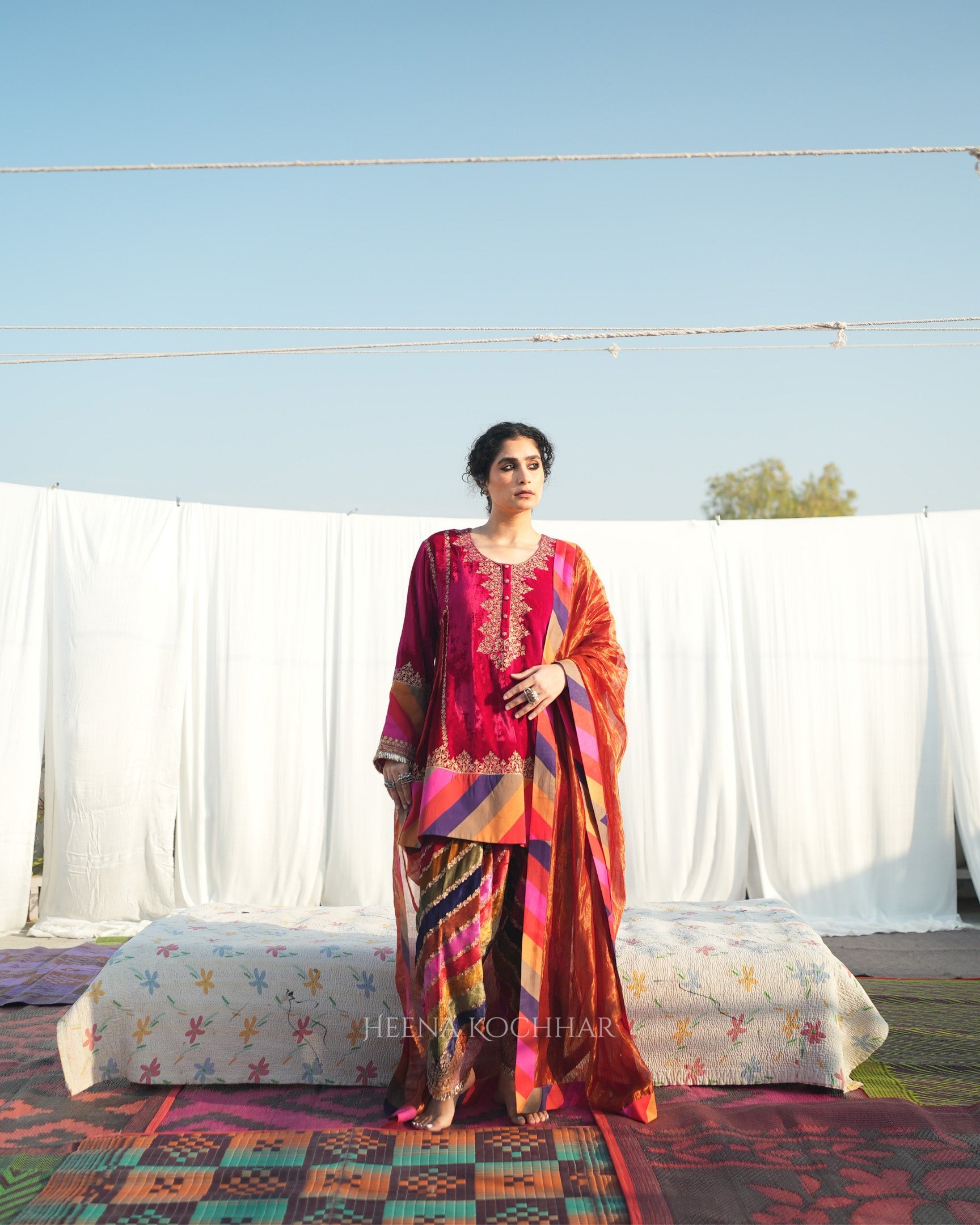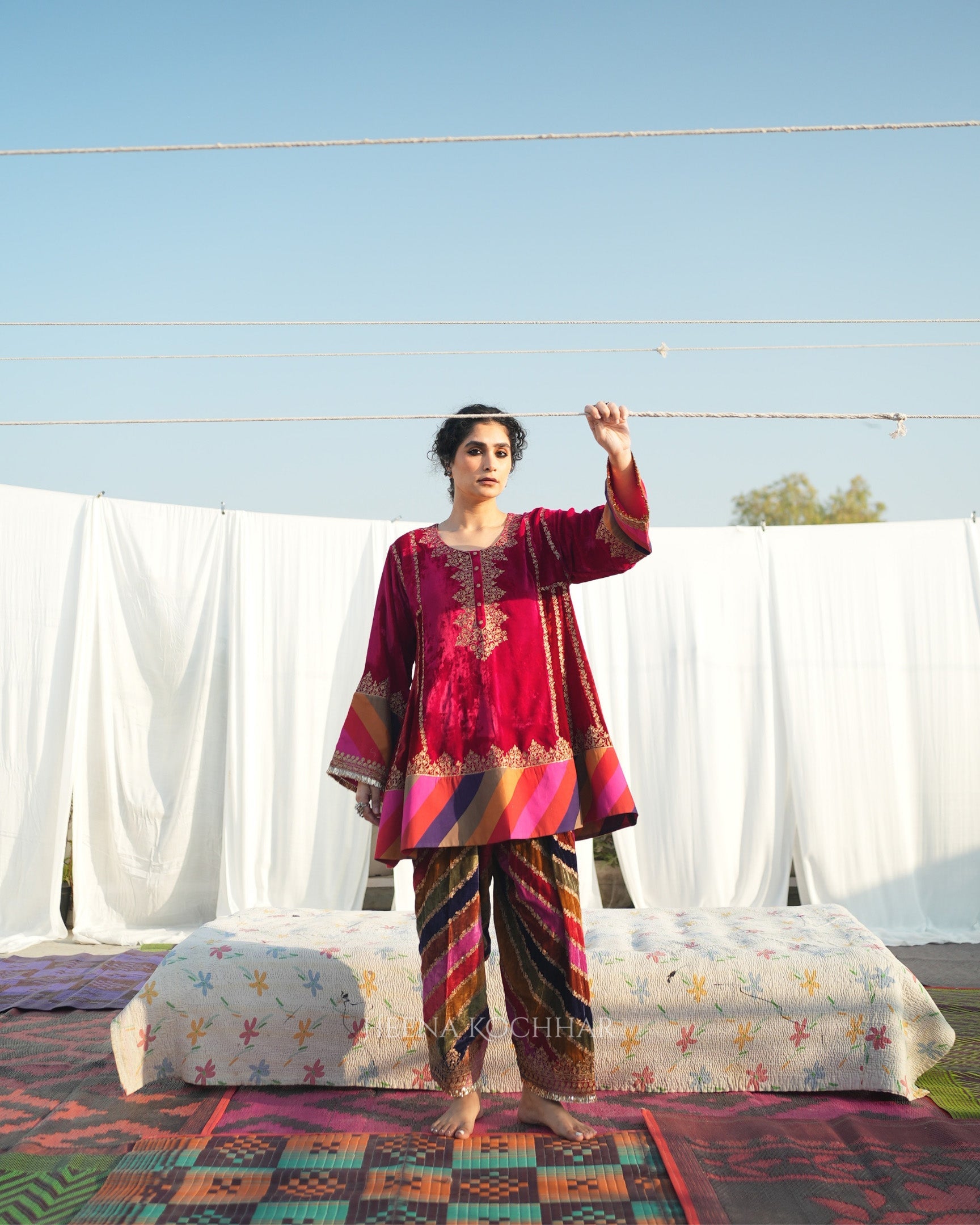 This red rani silk velvet choga set features a choga kurta crafted in silk velvet with multi stripe silk velvet. It is paired with a multi stripe silk velvet salwar and a red weave tissue odhani, creating a rich and coordinated look. Finished with zari ari embroidery, the set highlights fine craftsmanship with a festive appeal.