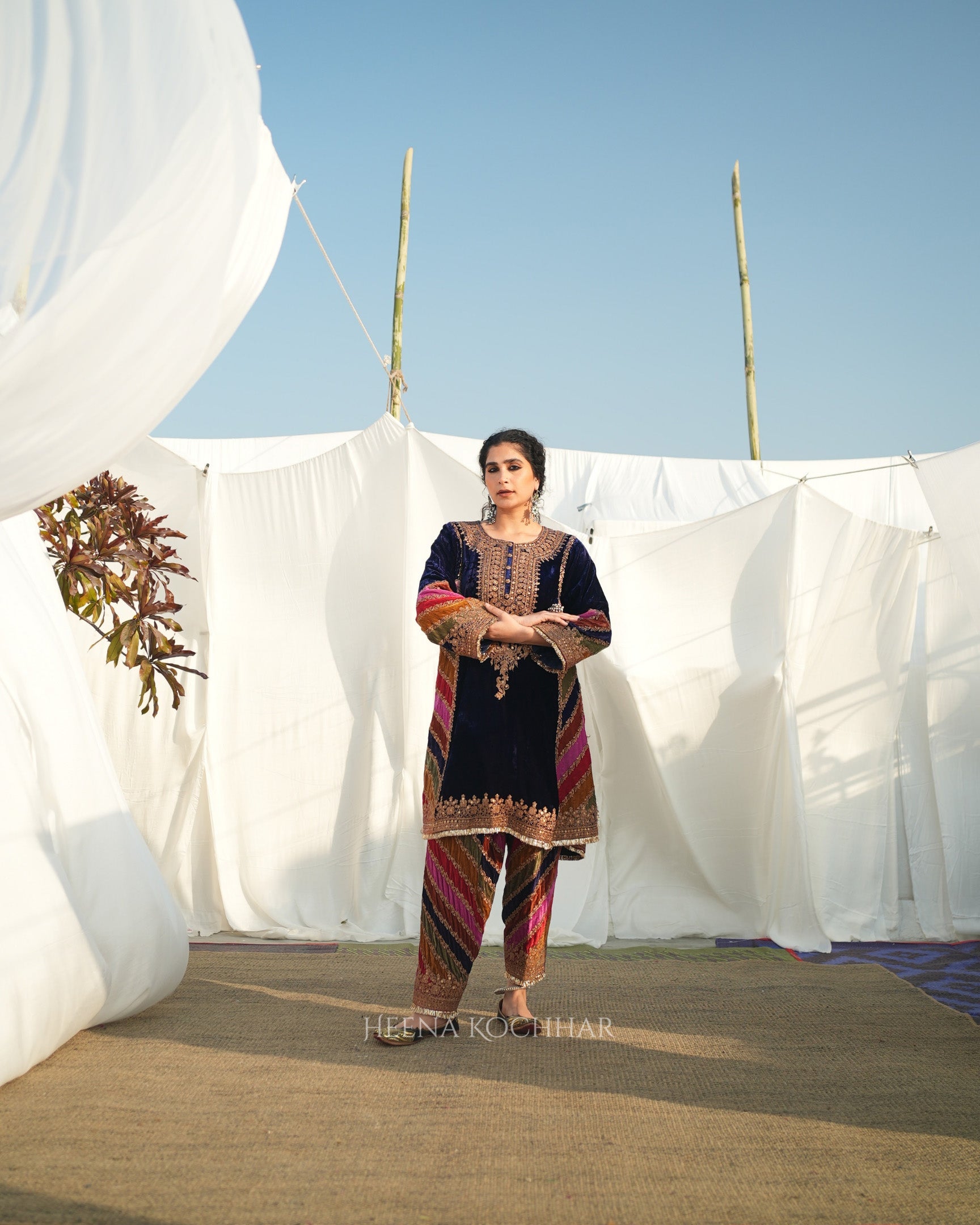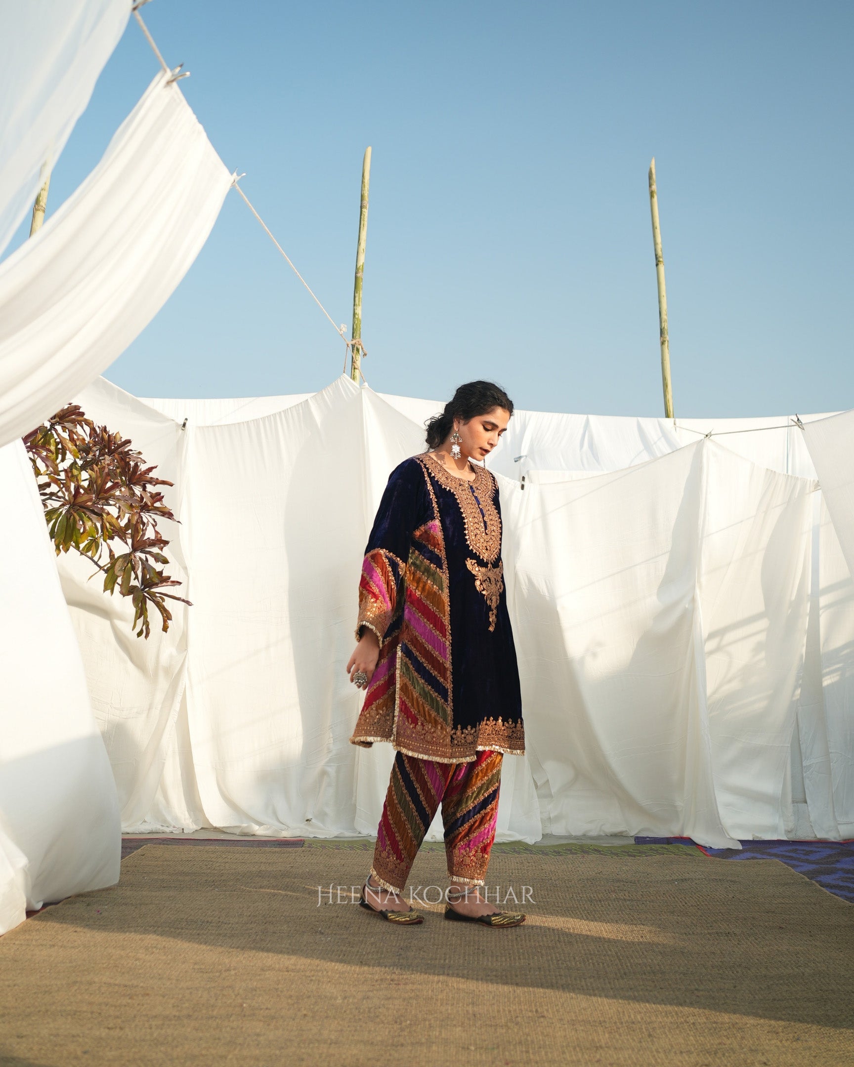 This choga set features a purple silk velvet choga kurta with multi stripe silk velvet panels, paired with a multi stripe silk velvet salwar and a red weave tissue odhani. The mix of stripes and rich velvet creates a coordinated festive look. Finished with zari dori sitara embroidery, the set highlights fine craftsmanship with refined surface detail.
