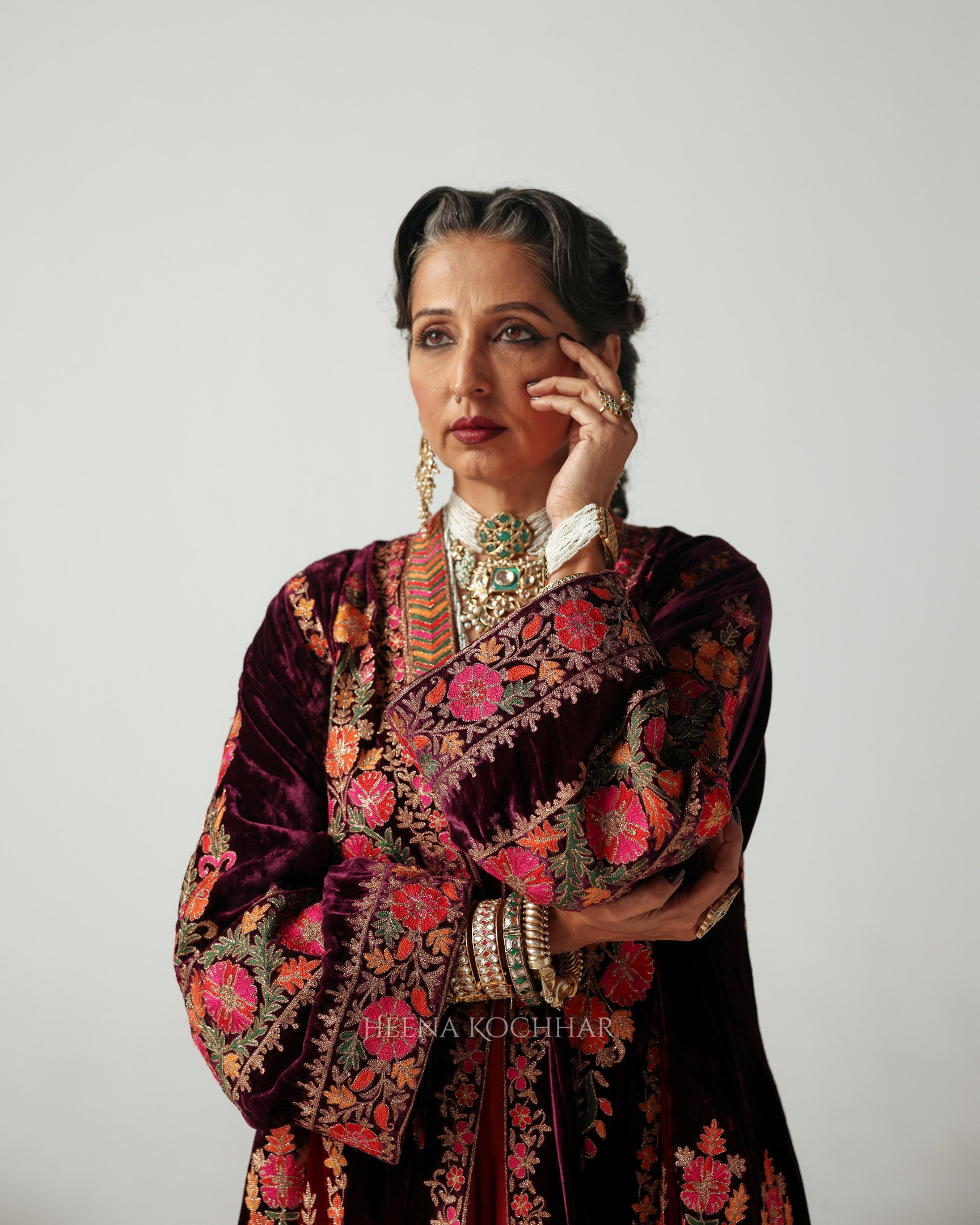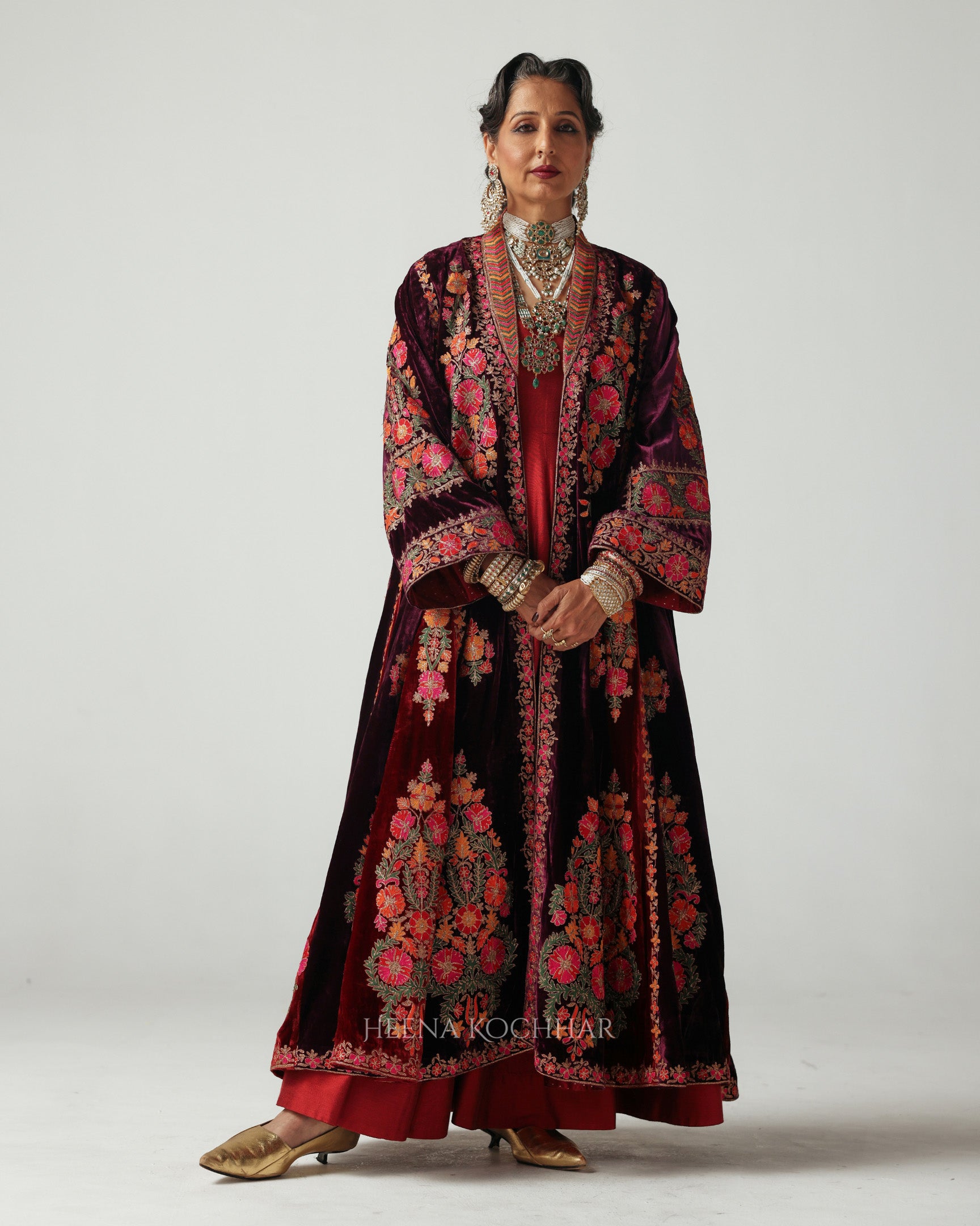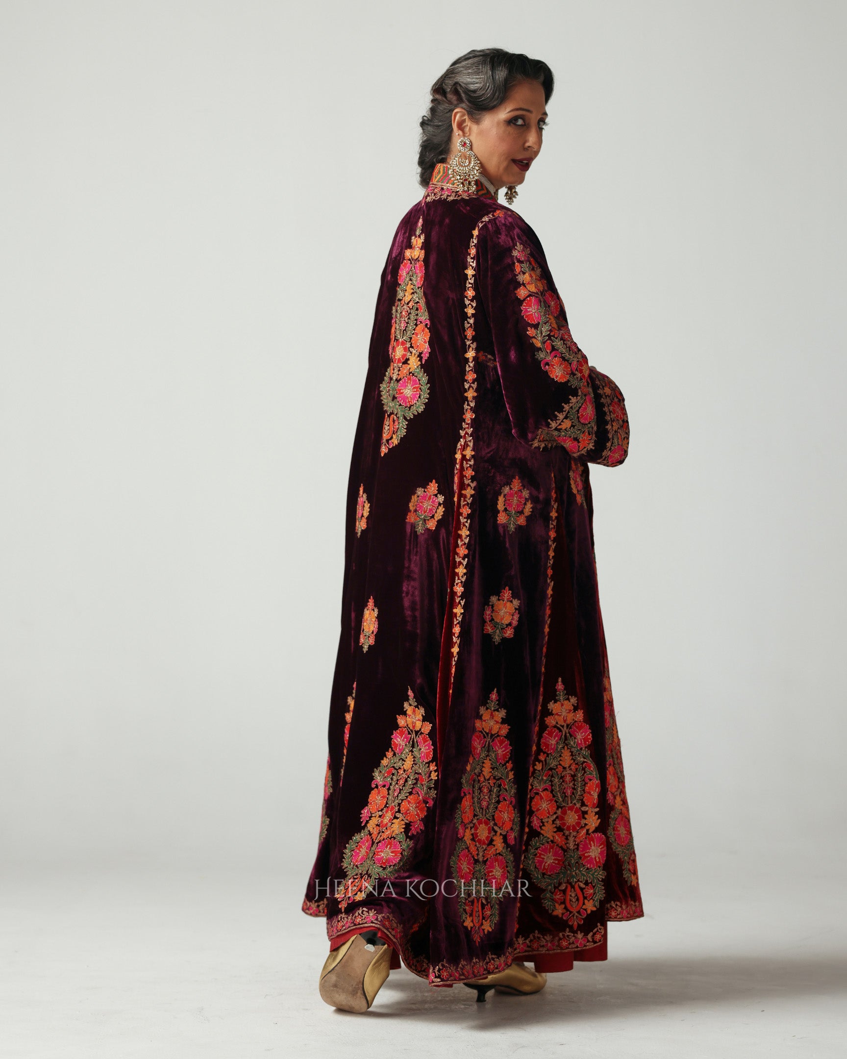 This purple-maroon cape features multi-coloured resham aari embroidery, highlighted with zari aari work that adds a soft golden sheen. The embroidery takes inspiration from Suzani motifs - traditional patterns known for their floral vines and sun-inspired designs, symbolising warmth and abundance.