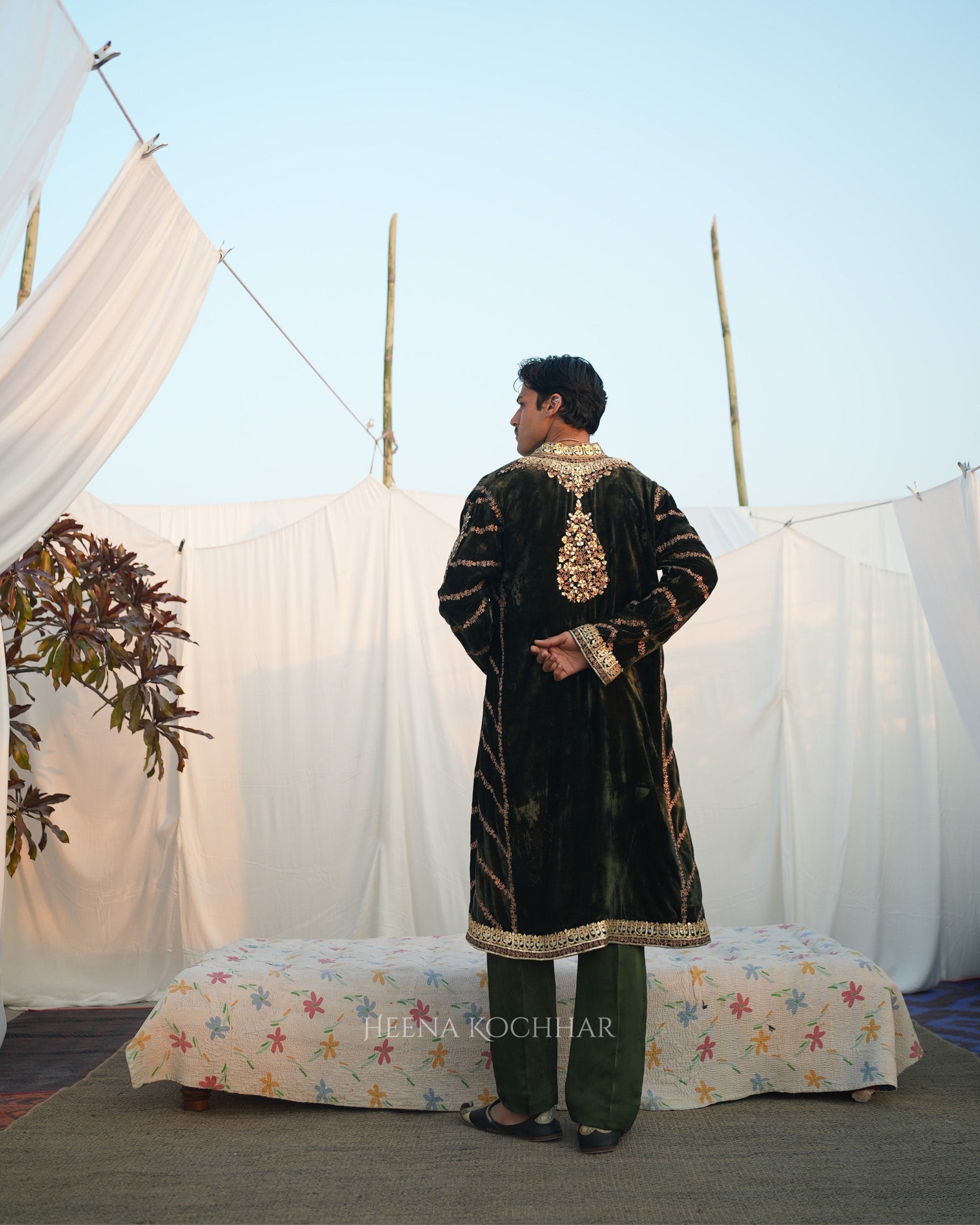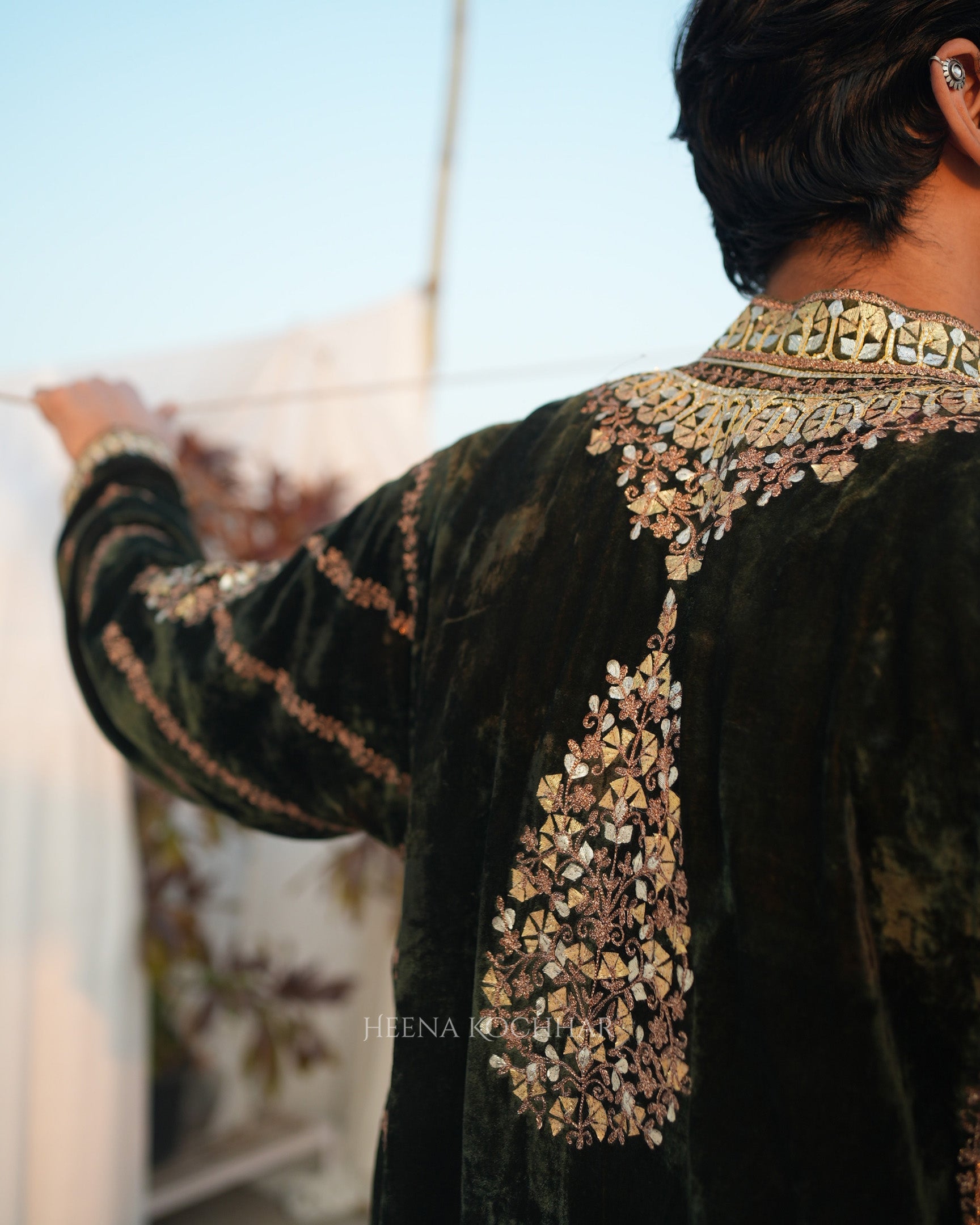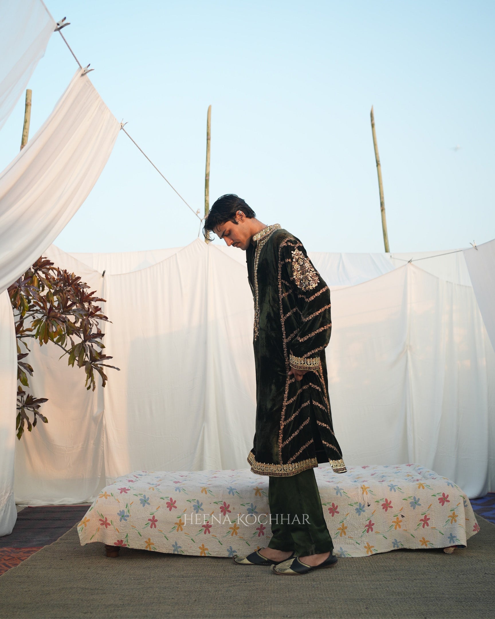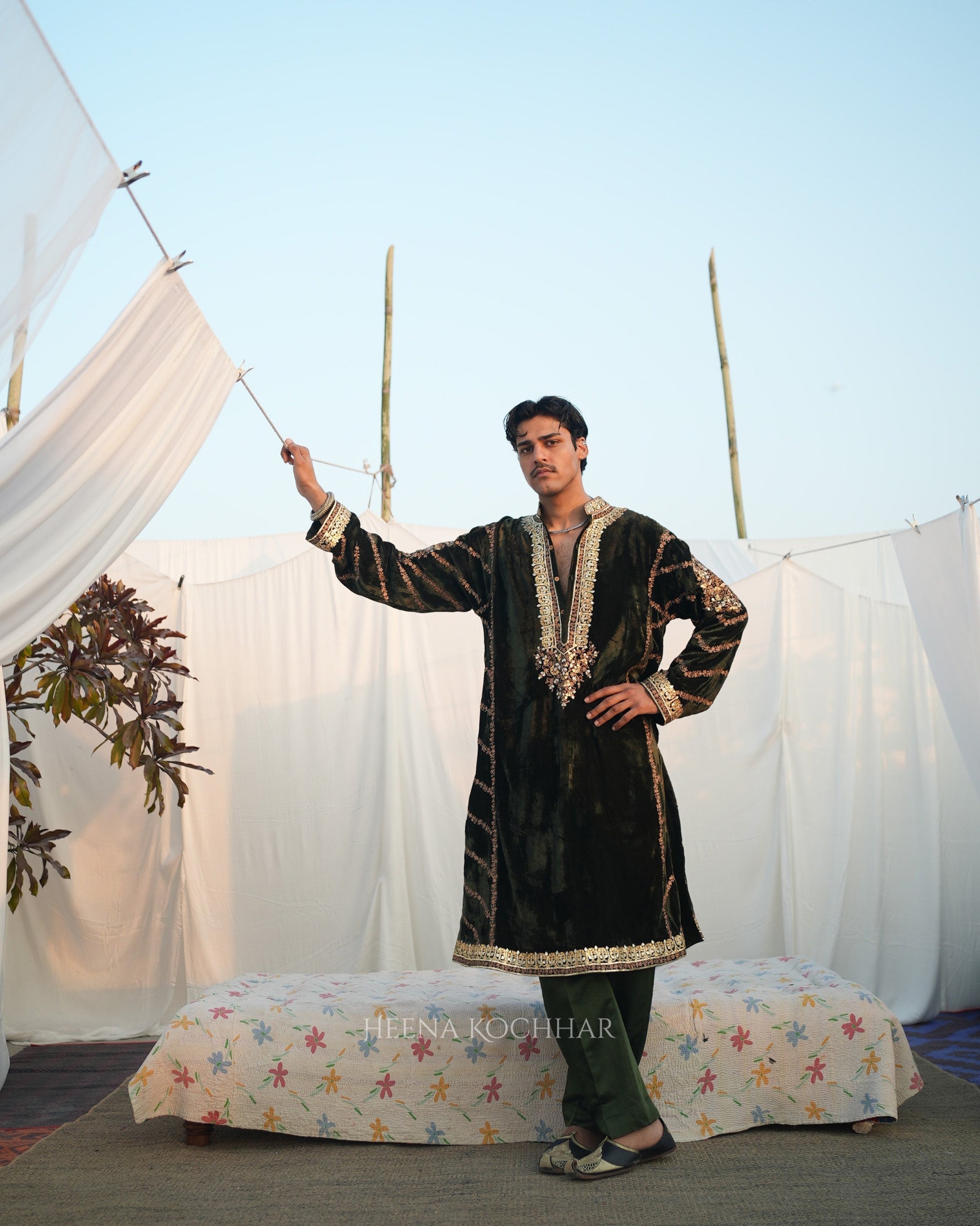 This menswear choga set features a green silk velvet choga kurta paired with a green linen silk pyjama and a green cotton tissue odhana, creating a coordinated and festive look. Finished with gota ari embroidery, the set highlights traditional craftsmanship with refined surface detail.