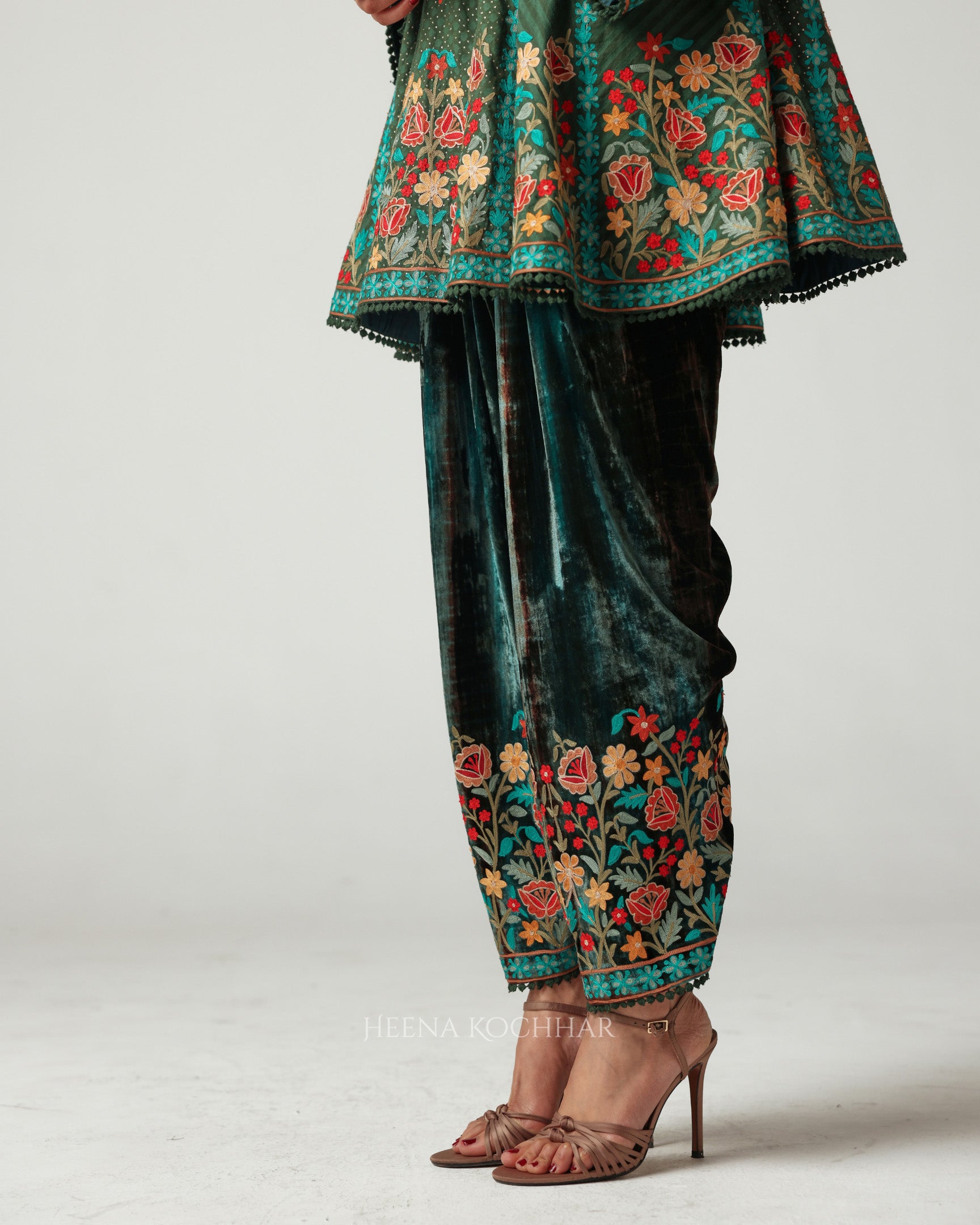 Draped in hues of green and brown, this velvet tie-dye salwar set evokes a sense of understated opulence. The surface comes alive with multi Resham ari embroidery, intricately woven to celebrate fine craftsmanship and festive artistry.