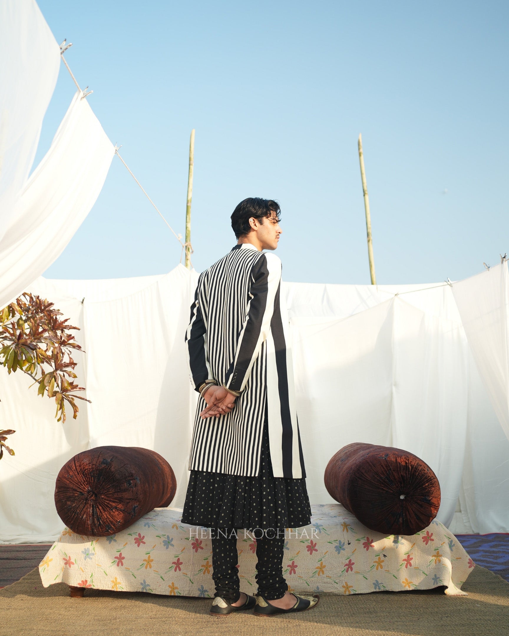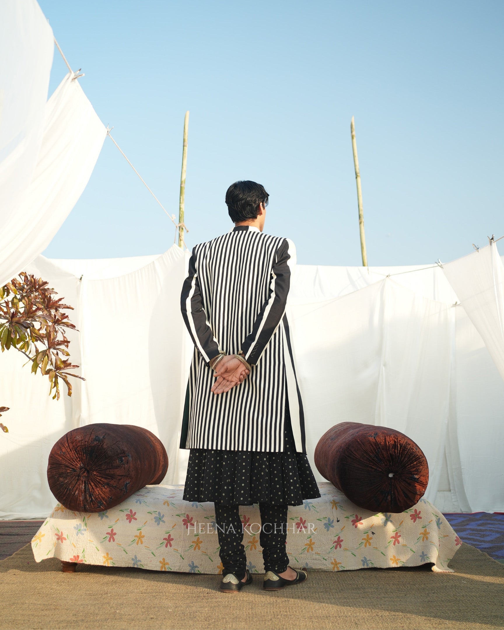 This menswear sherwani set features a black and white stripe silk linen sherwani lined with emerald green , layered over a black jacquard cotton anarkali kurta and paired with a black jacquard cotton chudidaar. The mix of stripes and jacquard texture creates a bold yet balanced festive look.