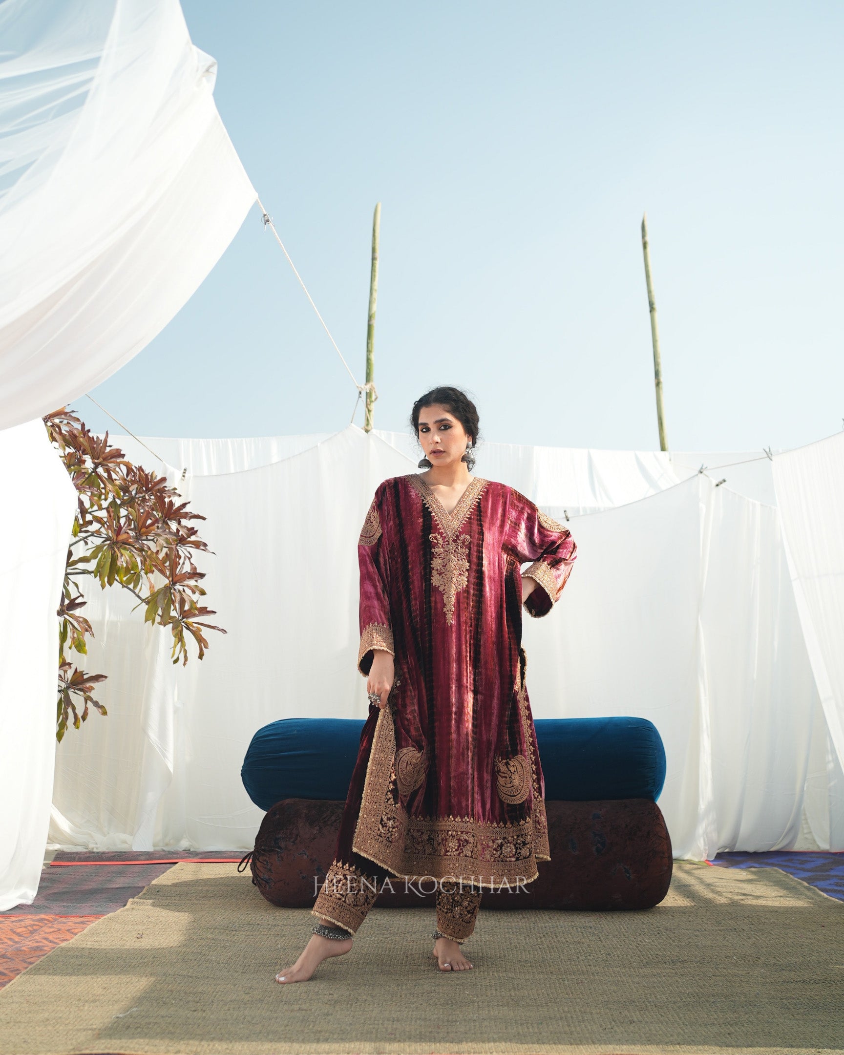 This choga set features a maroon and pink tie-dye velvet choga kurta paired with a maroon velvet salwar, creating a rich and coordinated festive look. Finished with zari dori embroidery, the set highlights traditional craftsmanship with refined surface detail.