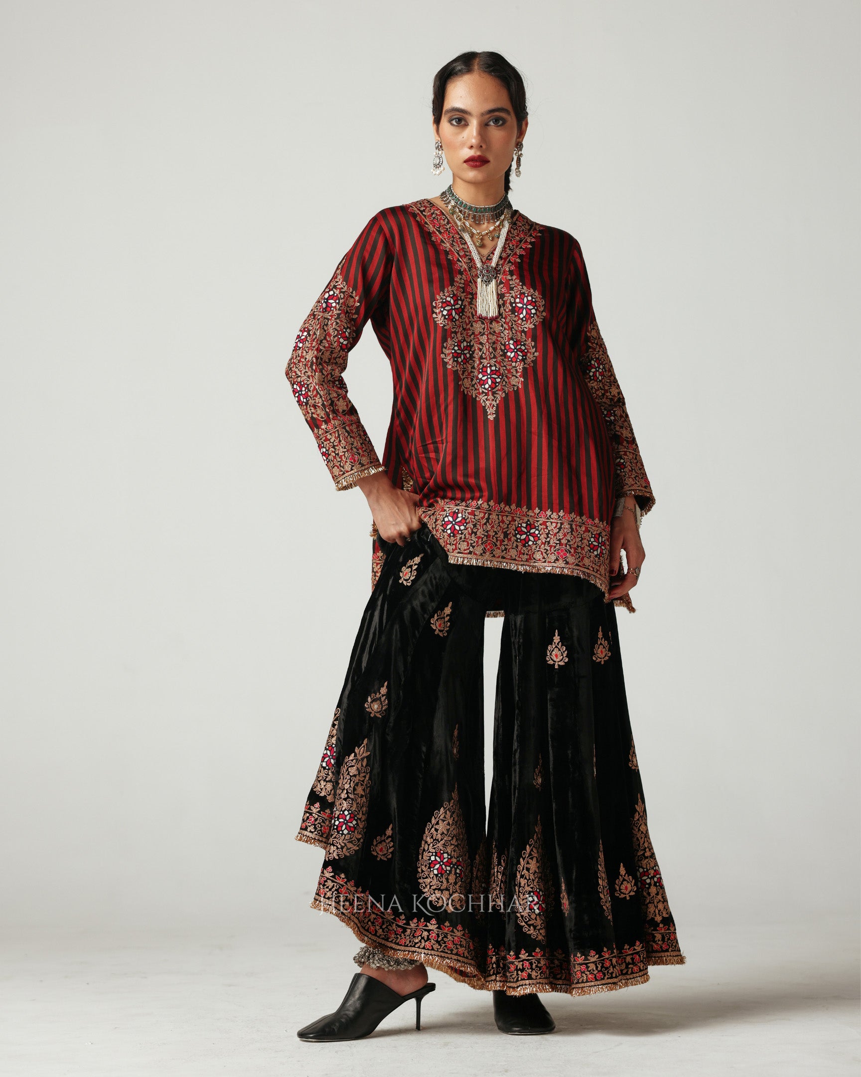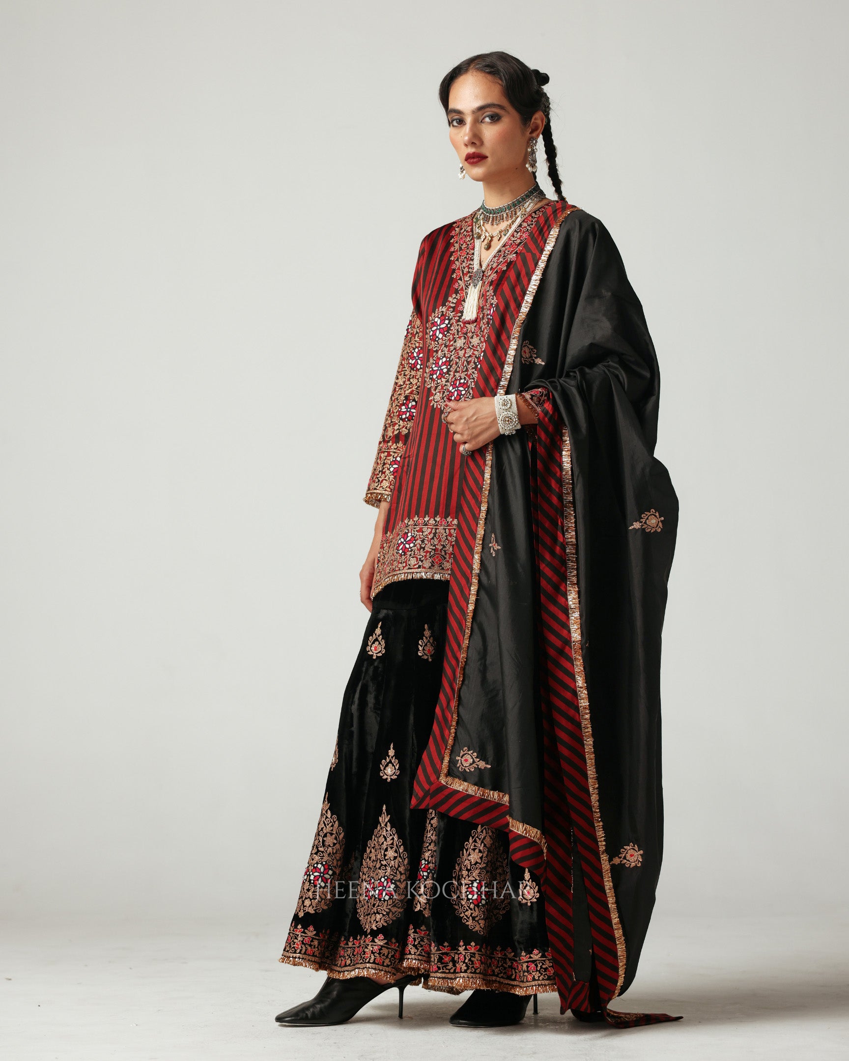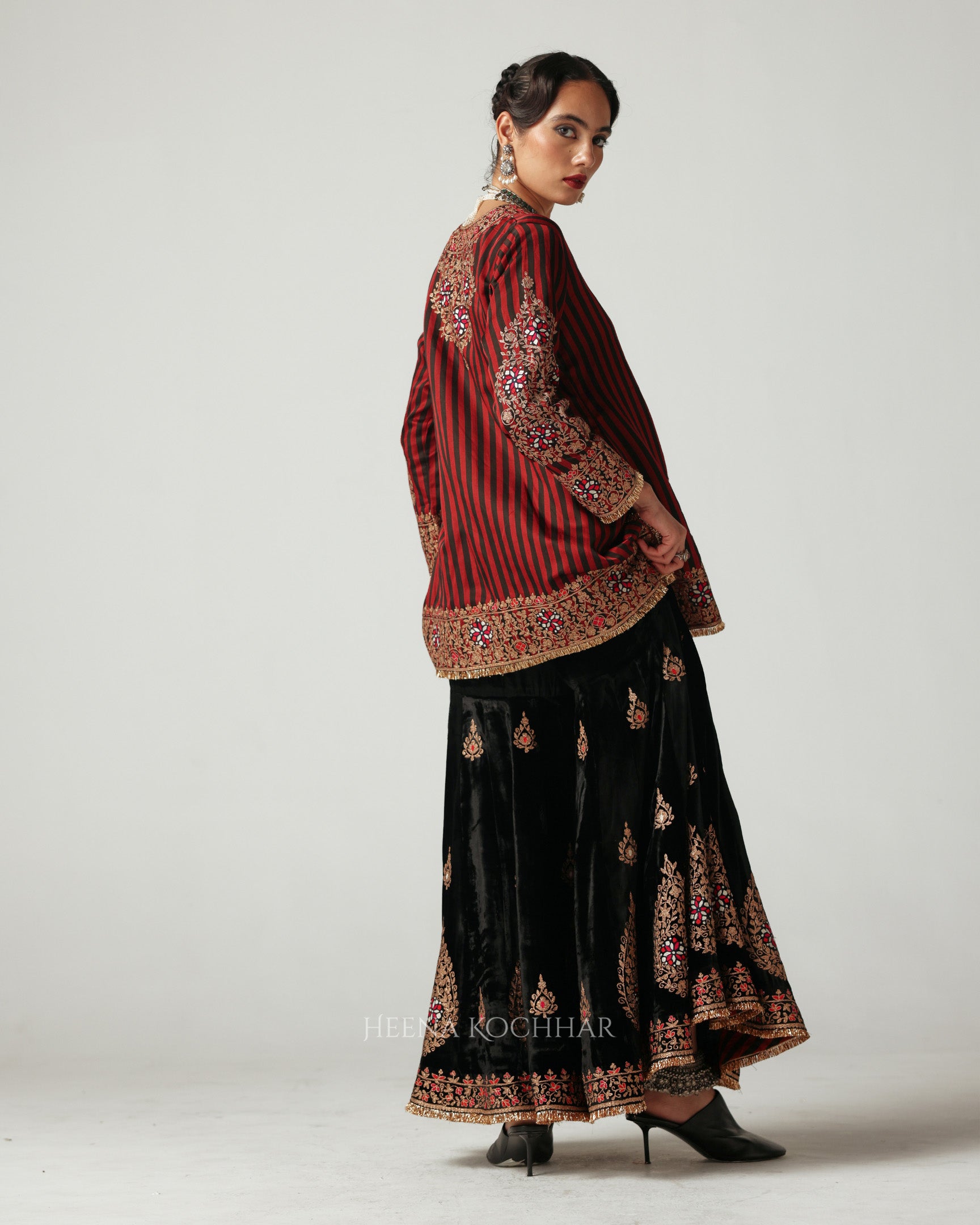 Draped in Heena Kochhar’s signature stripes in red and black, this kurta celebrates the harmony of heritage and bold modernity. Paired with a black velvet gharara, the silhouette exudes elegance.