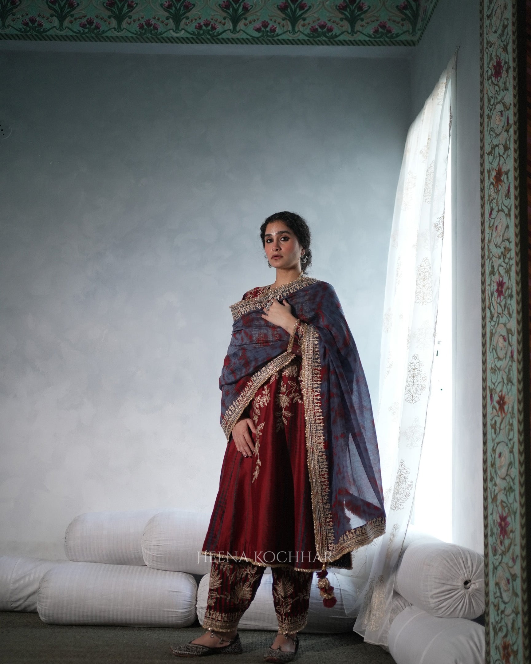 Kurta - Maroon And Blue Tie - Dye Chanderi Kurta