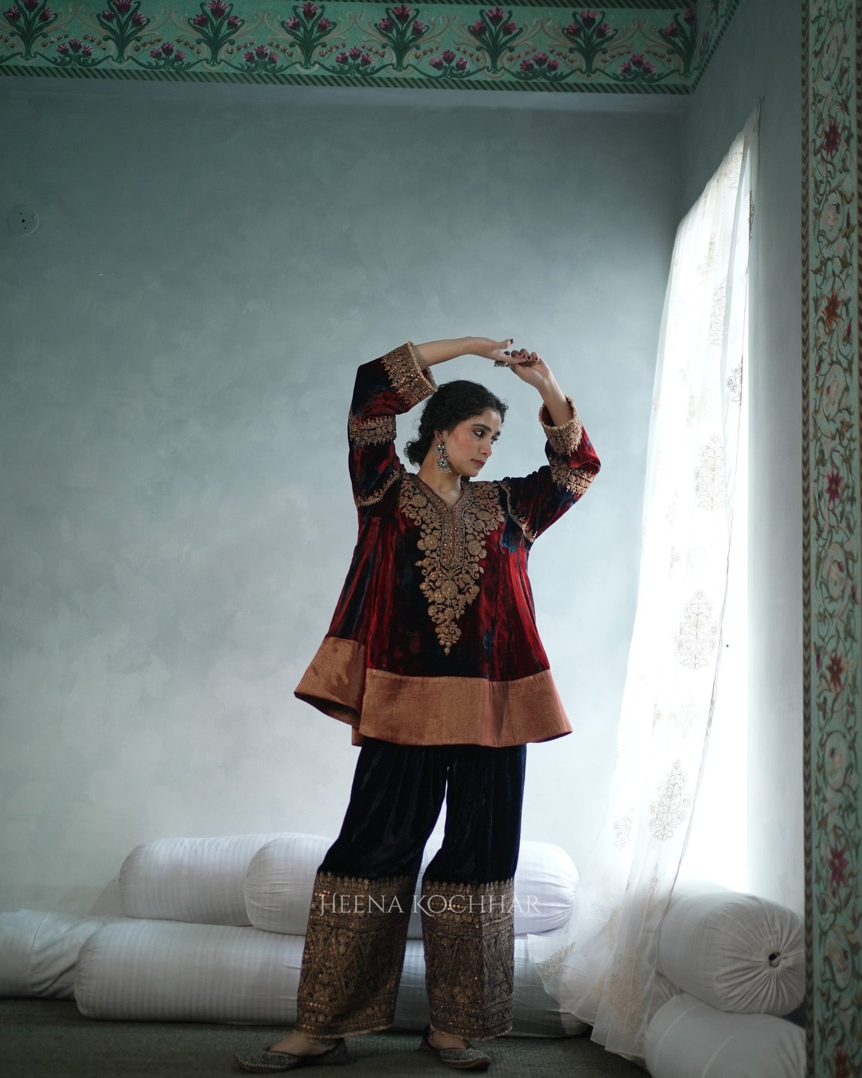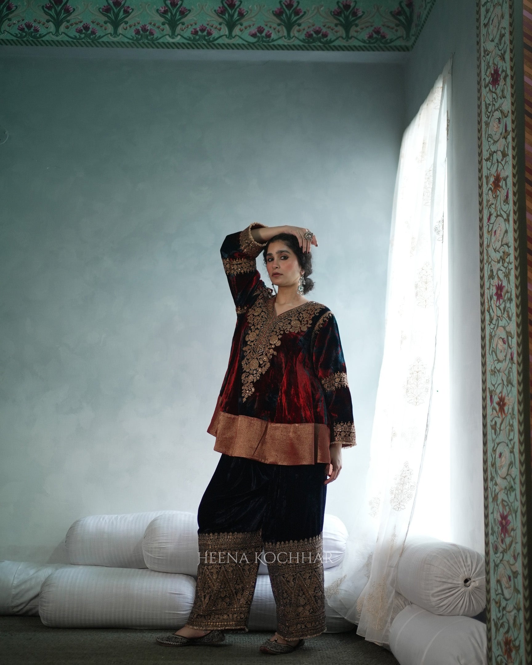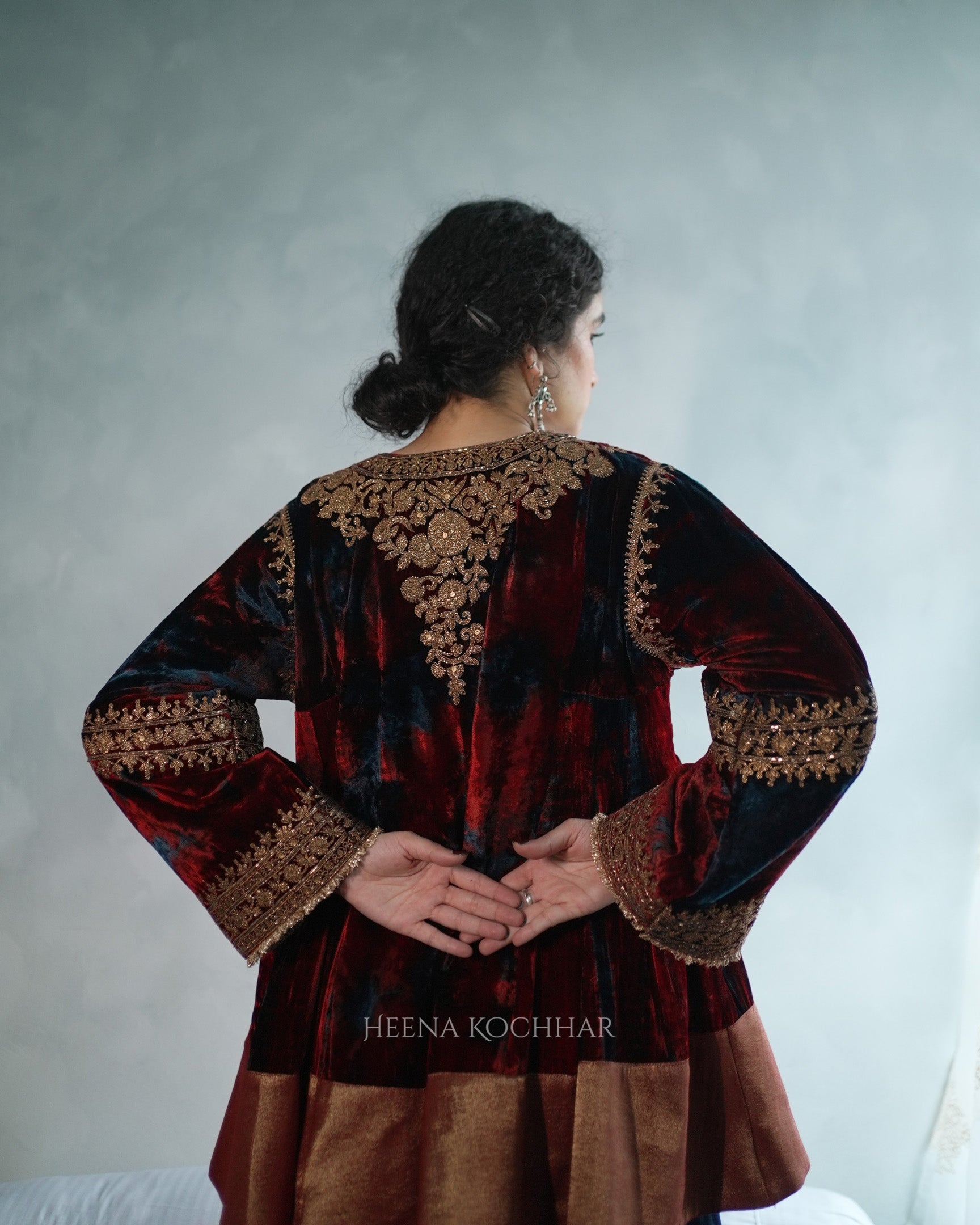 Kurta - Maroon And Blue Tie-Dye Silk Velvet Choga