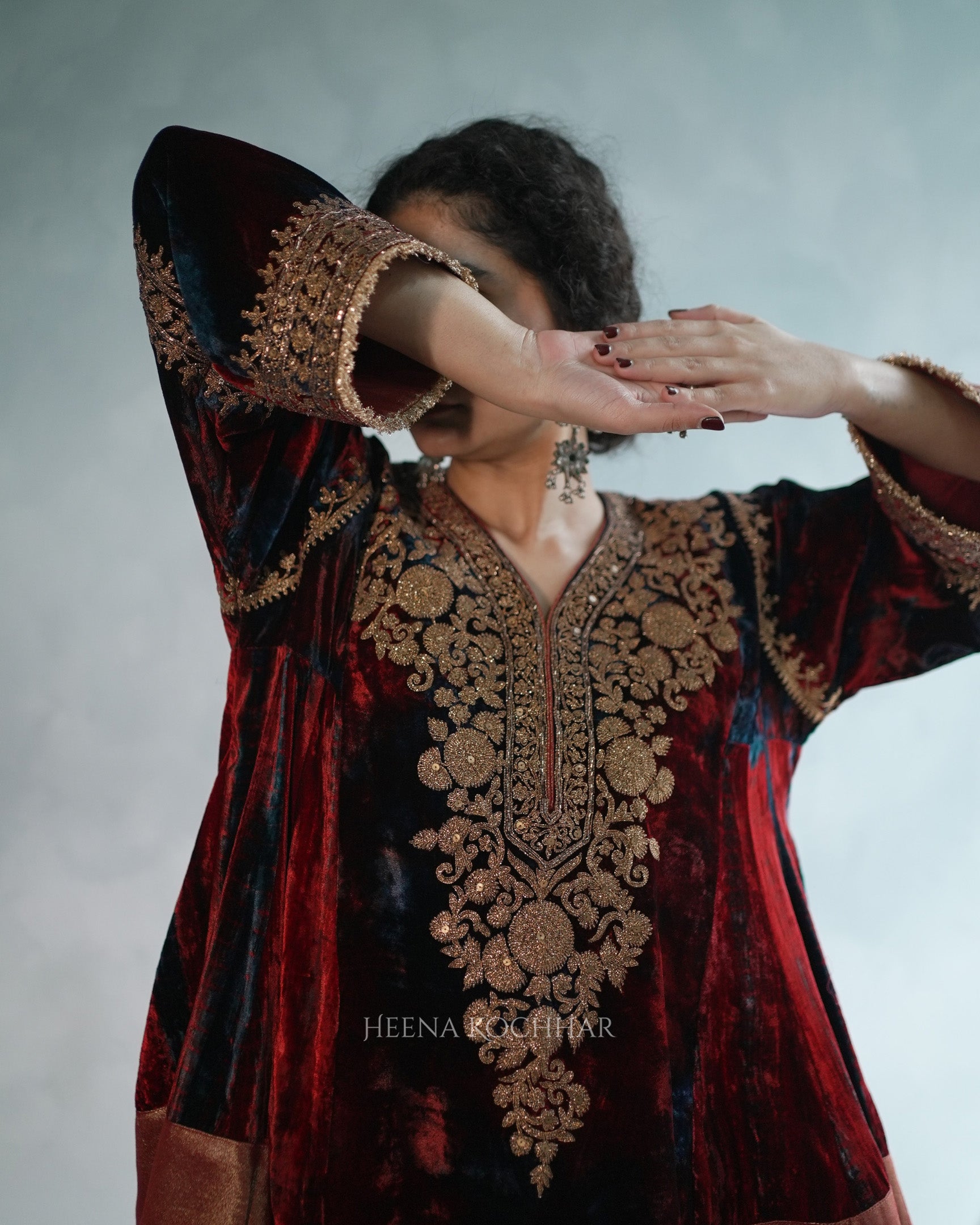 KURTA - Maroon And Blue Tie-Dye Silk Velvet Choga