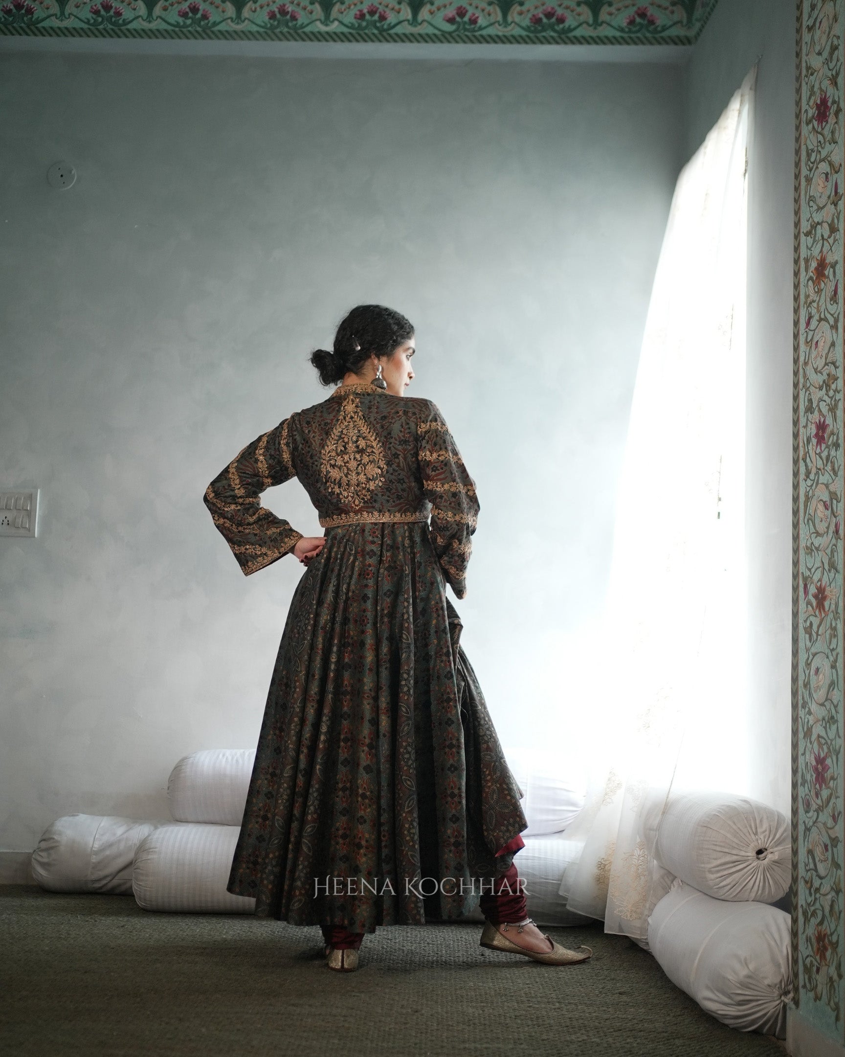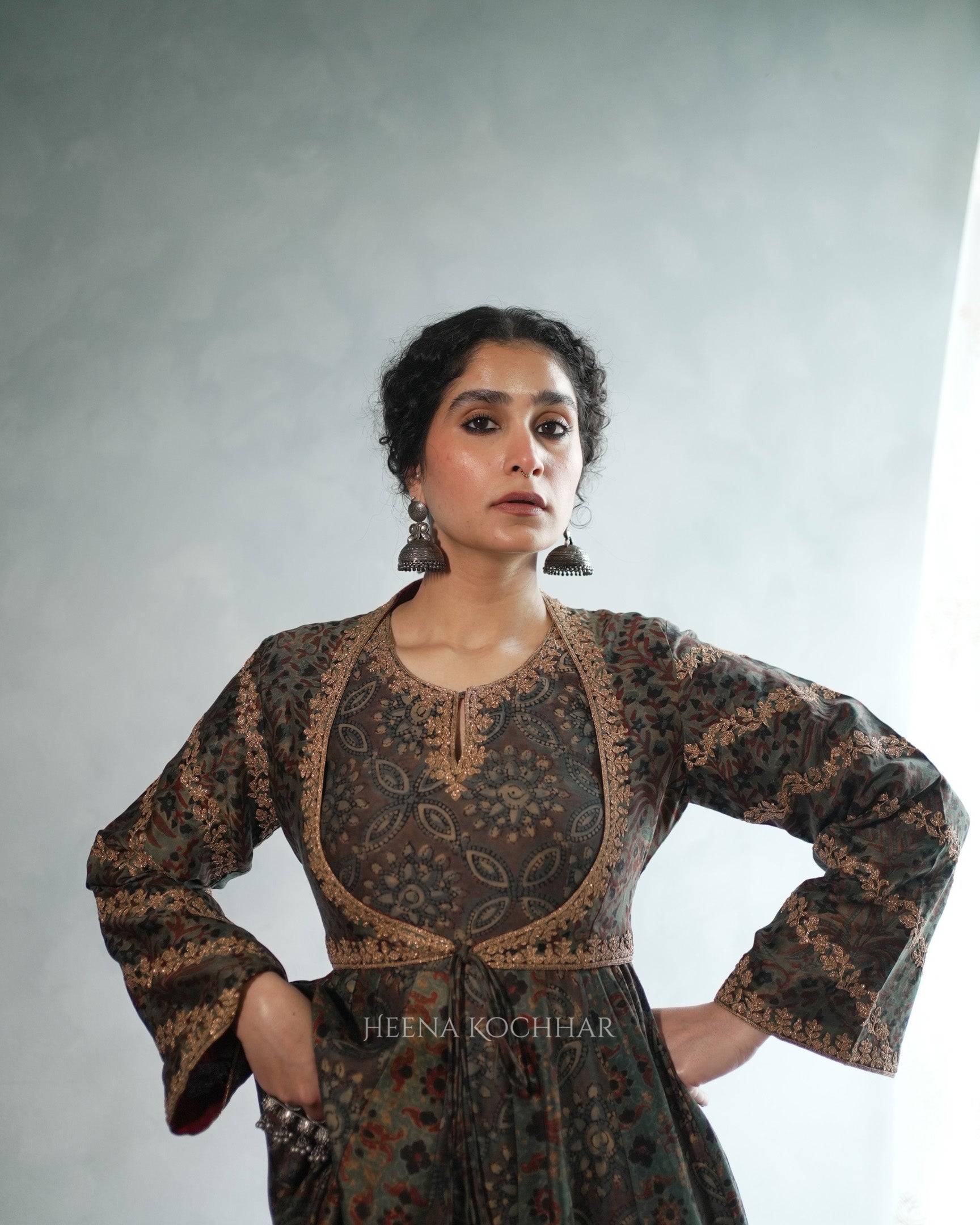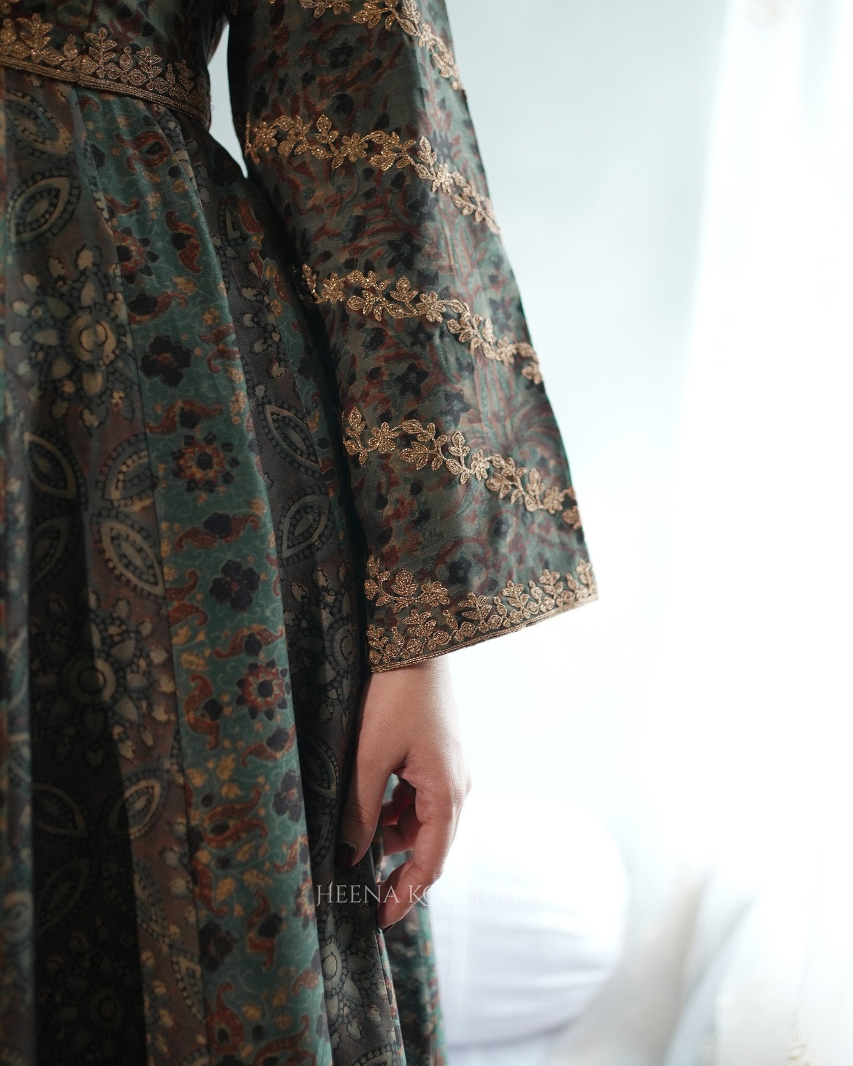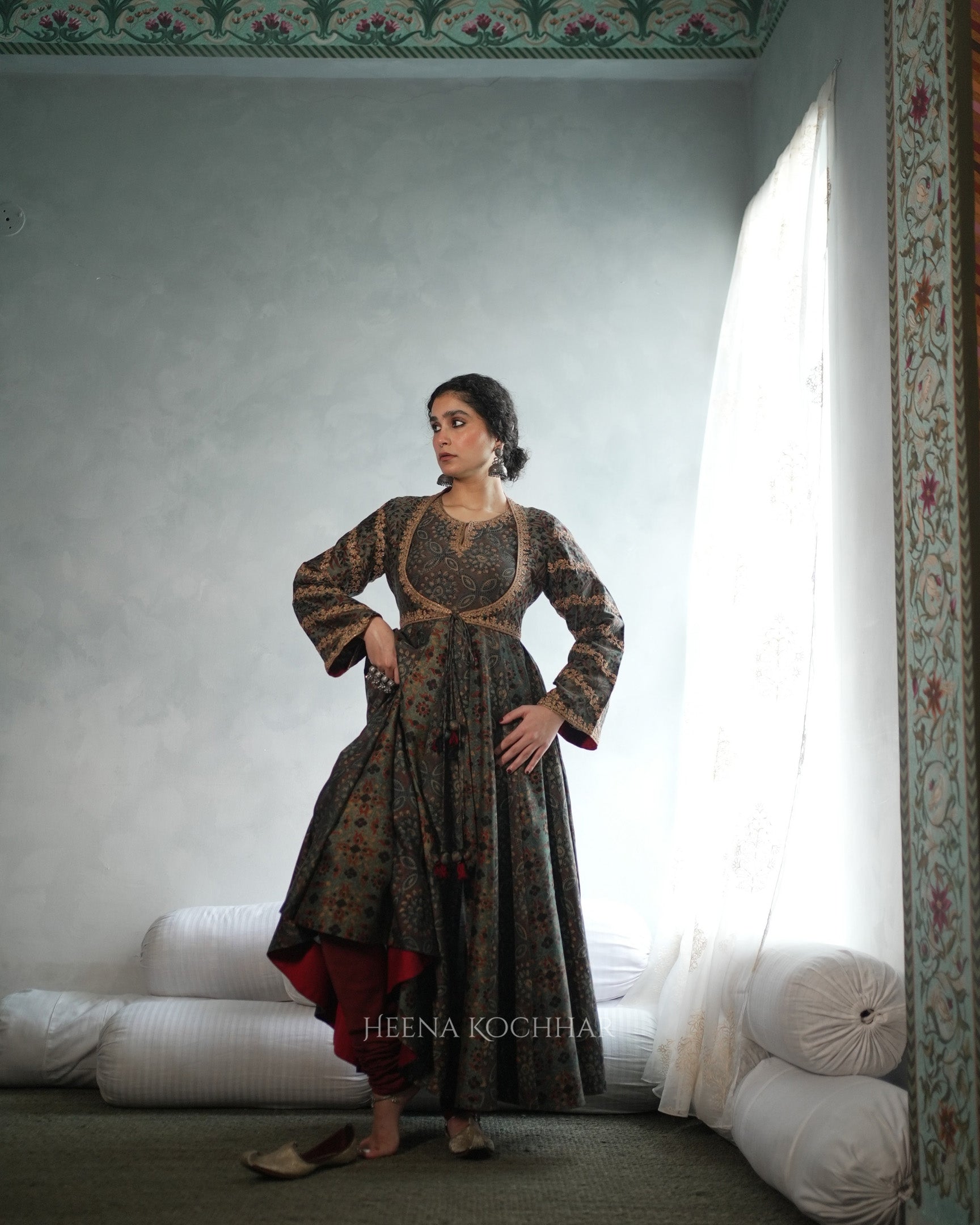 KURTA - Maroon And Green Ajrakh Chanderi Anarkali