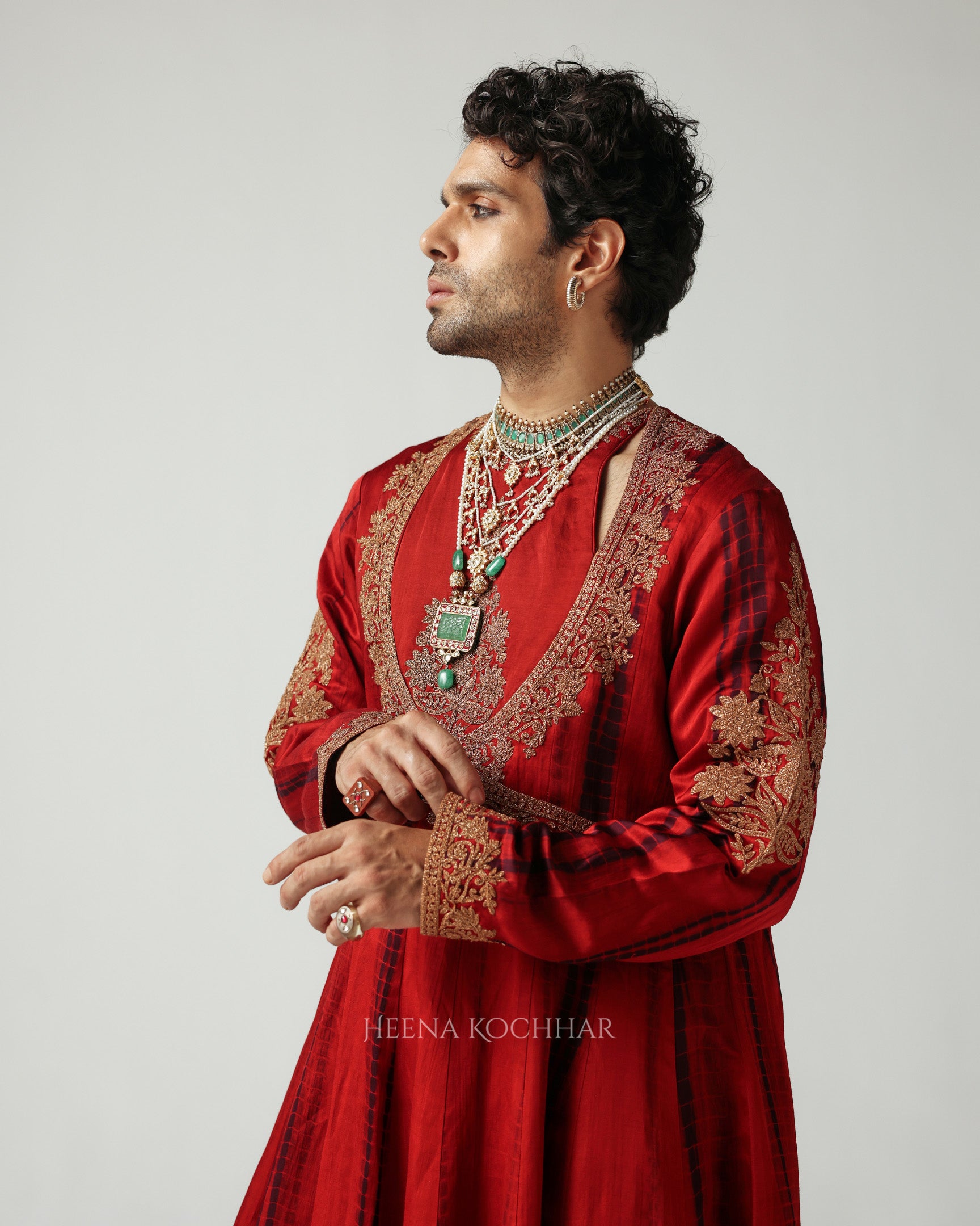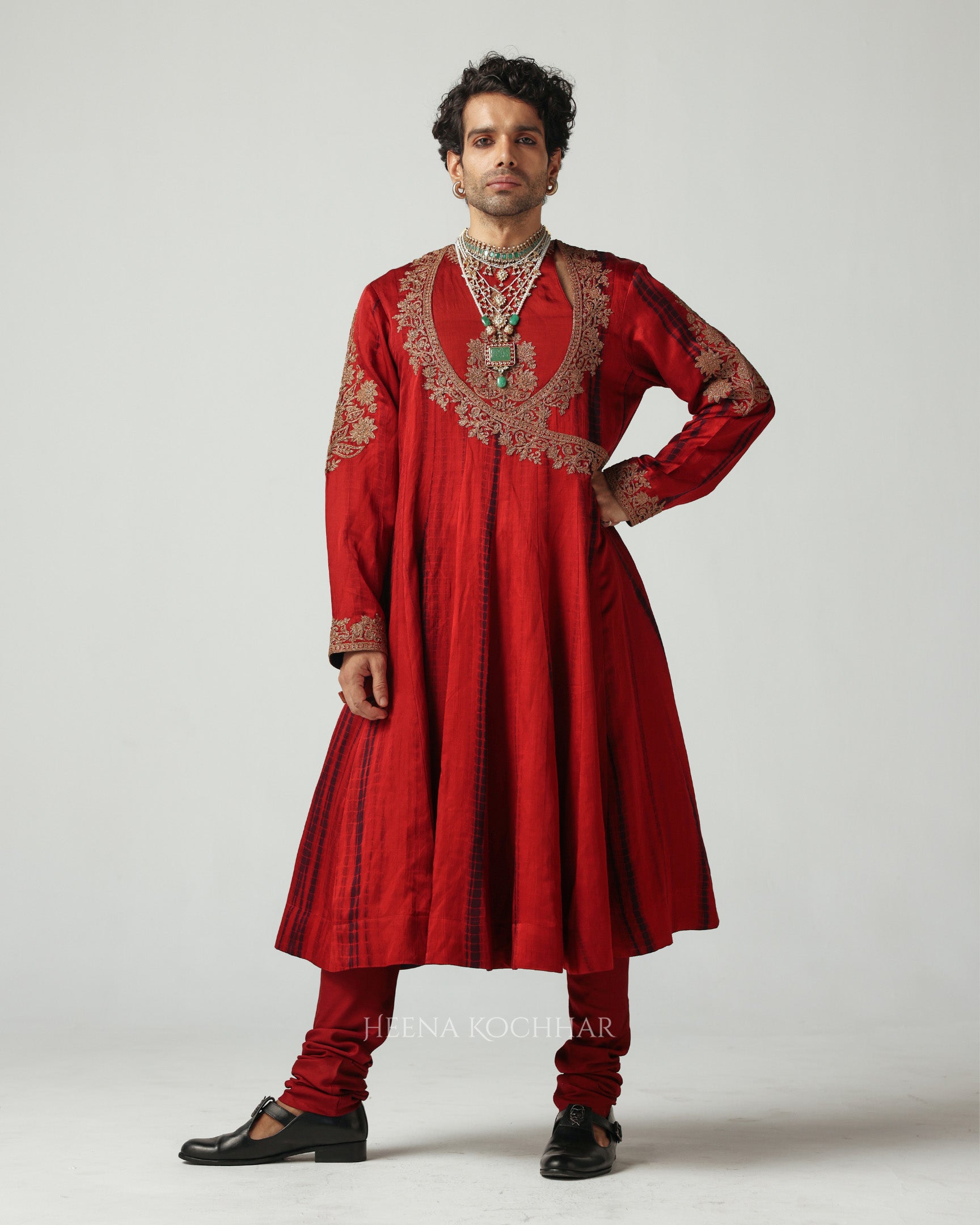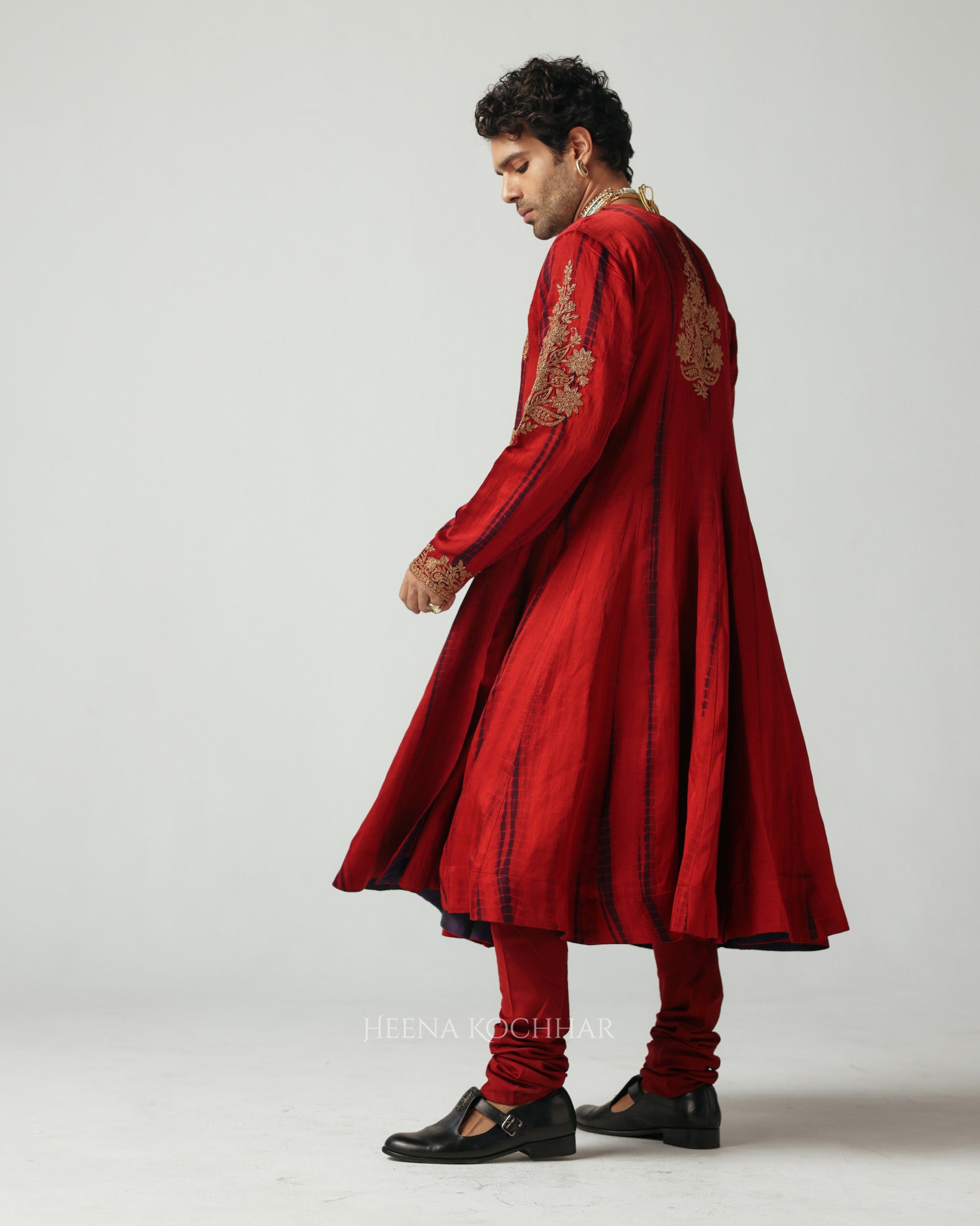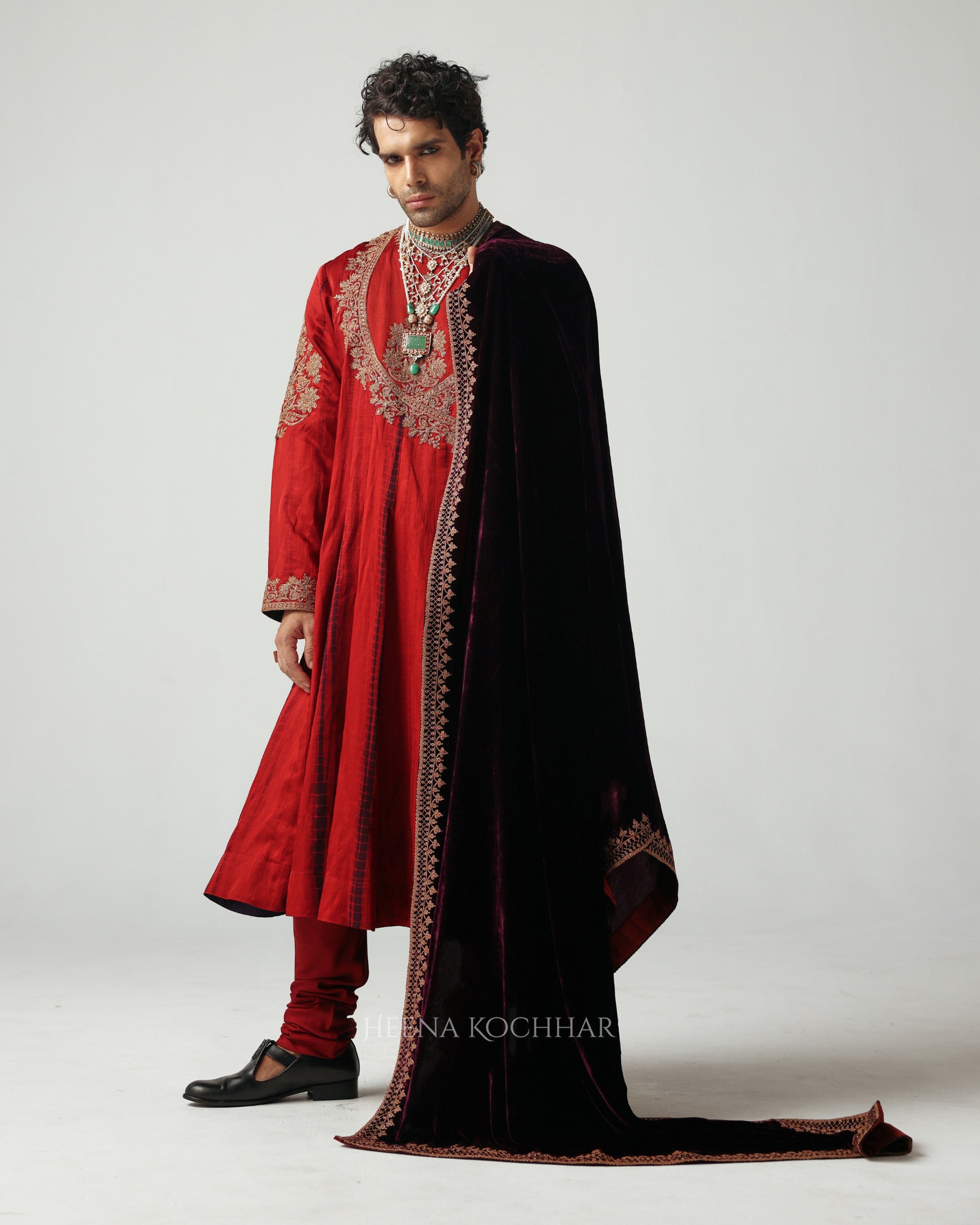 A graceful symphony of maroon and purple tie-dye silk linen, this anarkali captures the spirit of quiet celebration. Embroidered delicately with zari and dori, it is paired with chudidaar and a purple velvet odhani, the ensemble flows effortlessly, exuding richness and regal calm, a timeless ode to the craft of emotion and elegance.