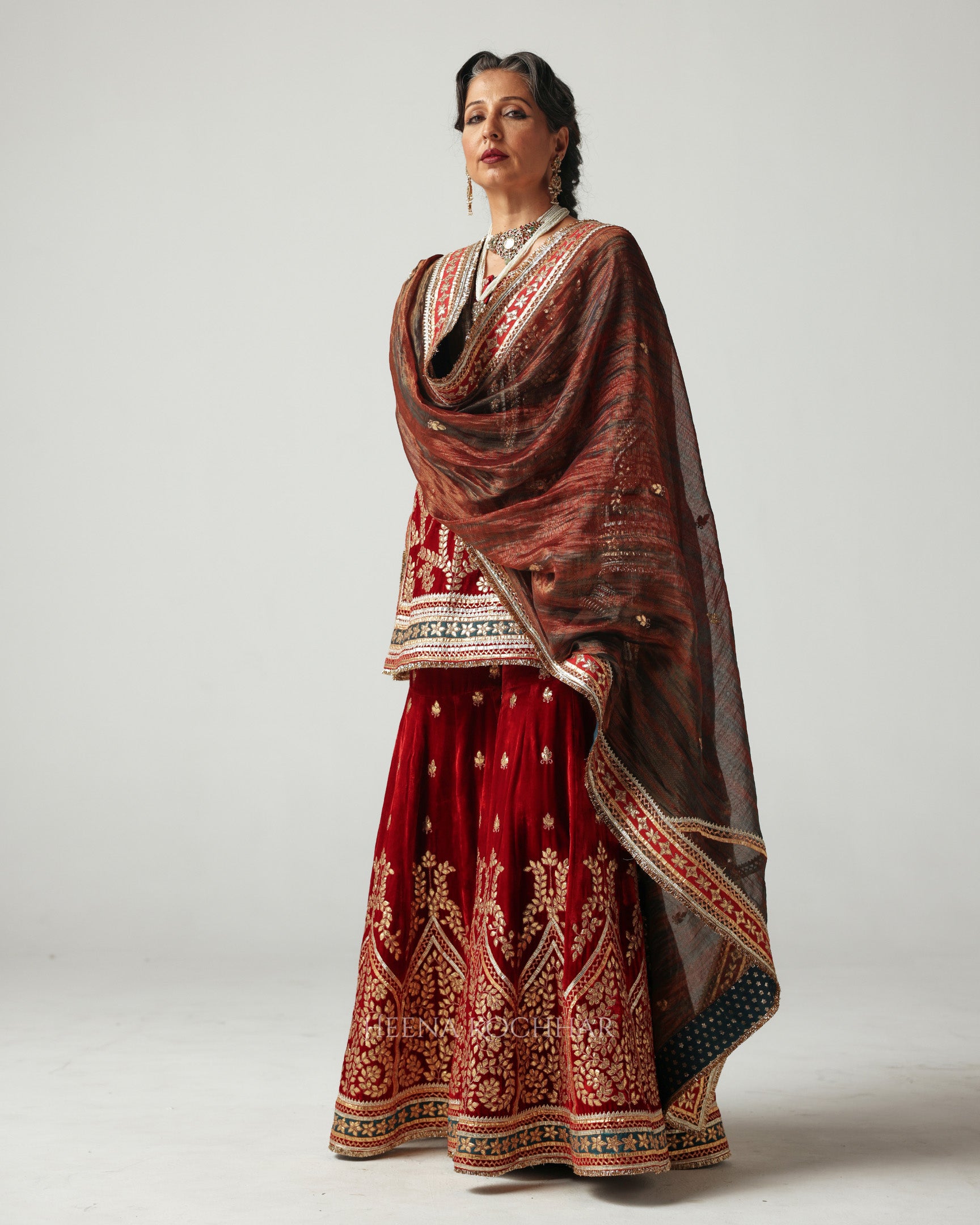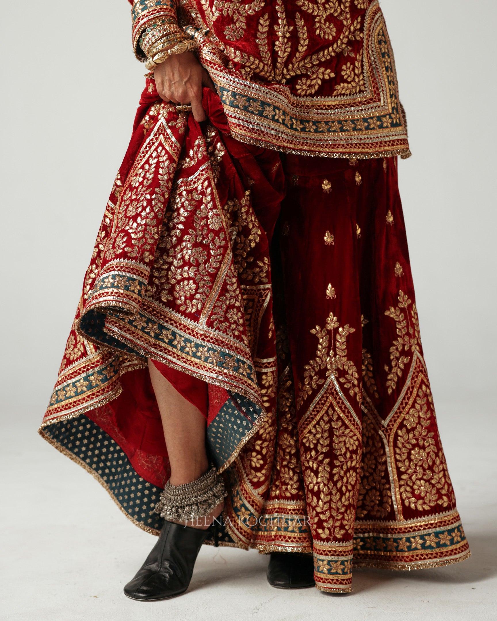 In hues of deep maroon, this velvet short kurta and gharara reflects the romance of tradition and the richness of festive artistry. Embellished with gota ari patchwork embroidery, each motif shimmers softly; a tribute to age-old craftsmanship.
