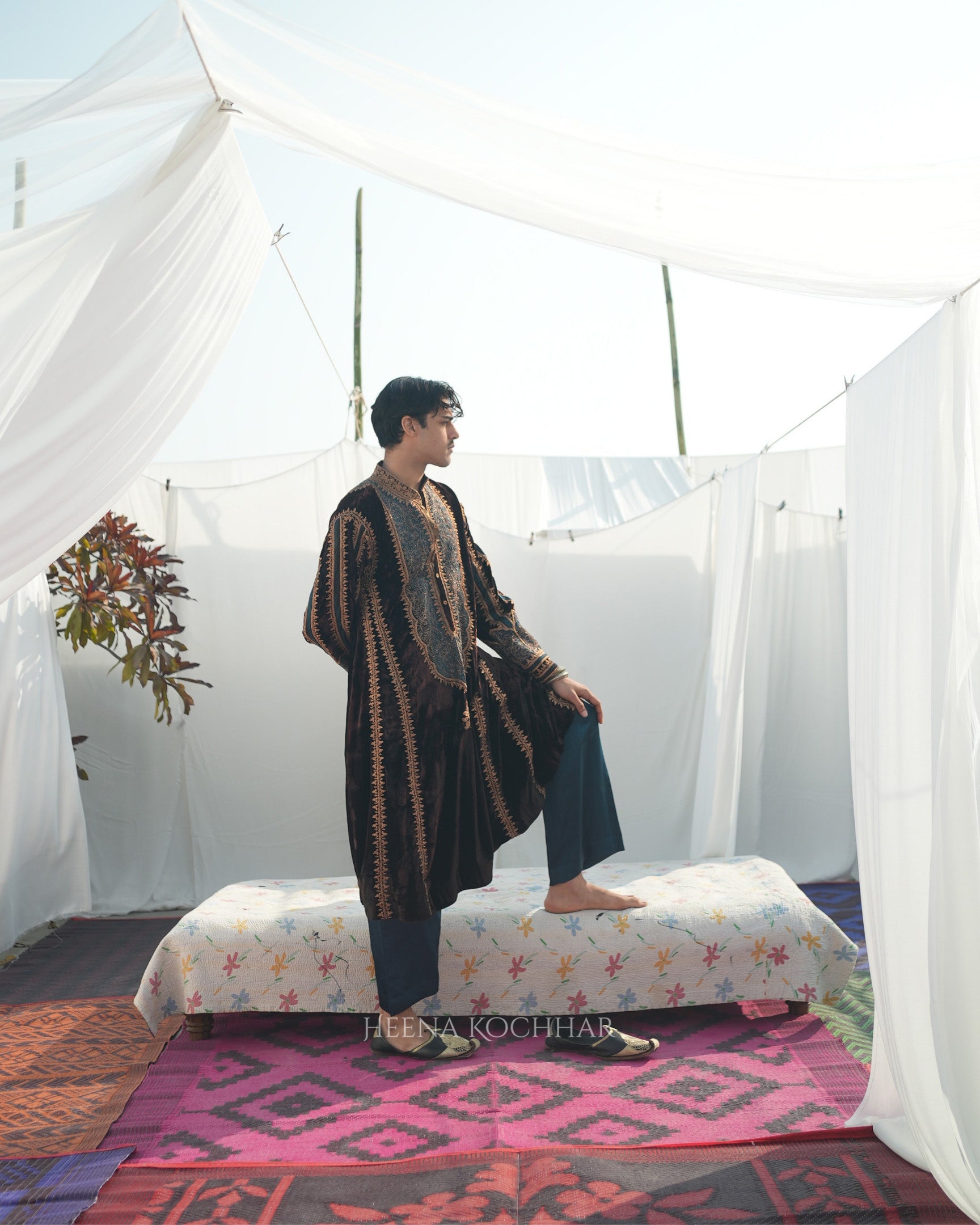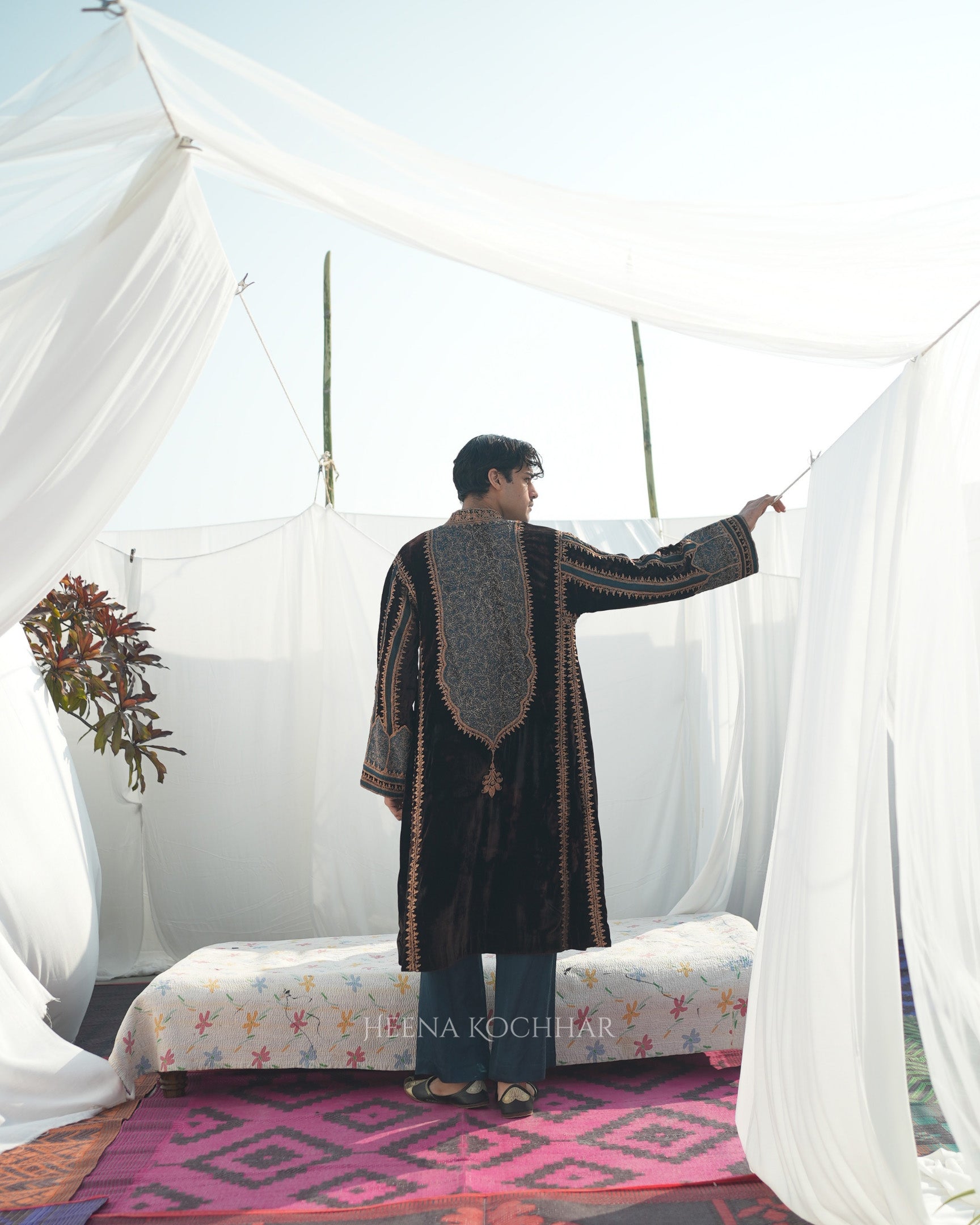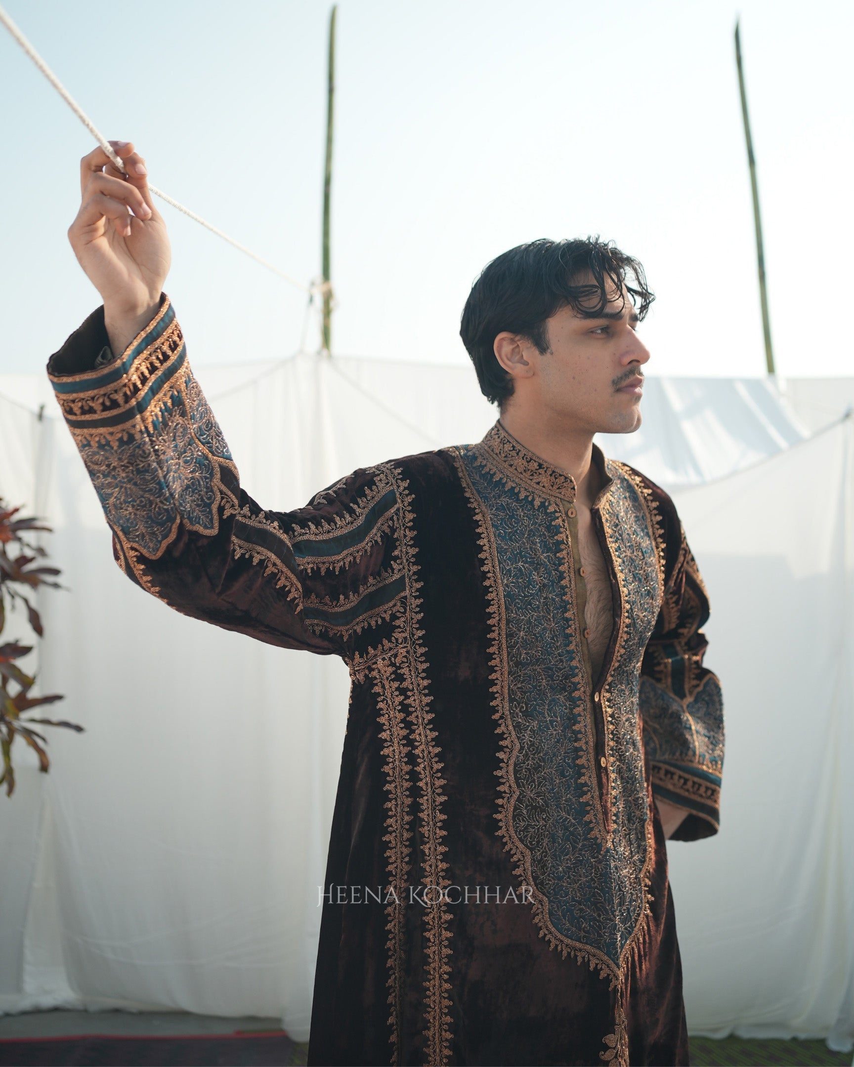 This menswear choga kurta set features a brown silk velvet choga kurta paired with a teal silk linen pyjama, creating a rich contrast in tones and texture. Finished with zari dori ari embroidery, the set highlights traditional craftsmanship with a modern edge.
