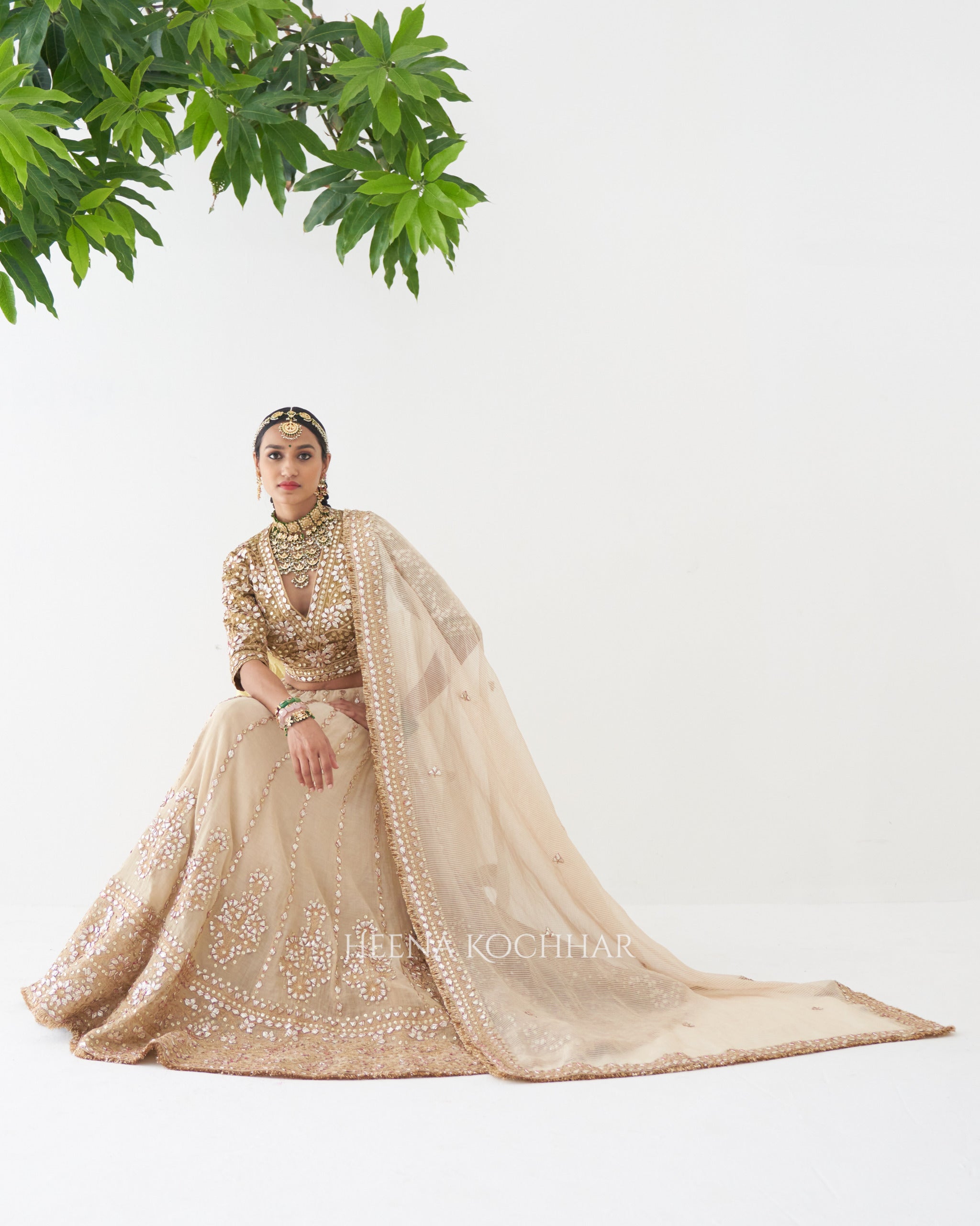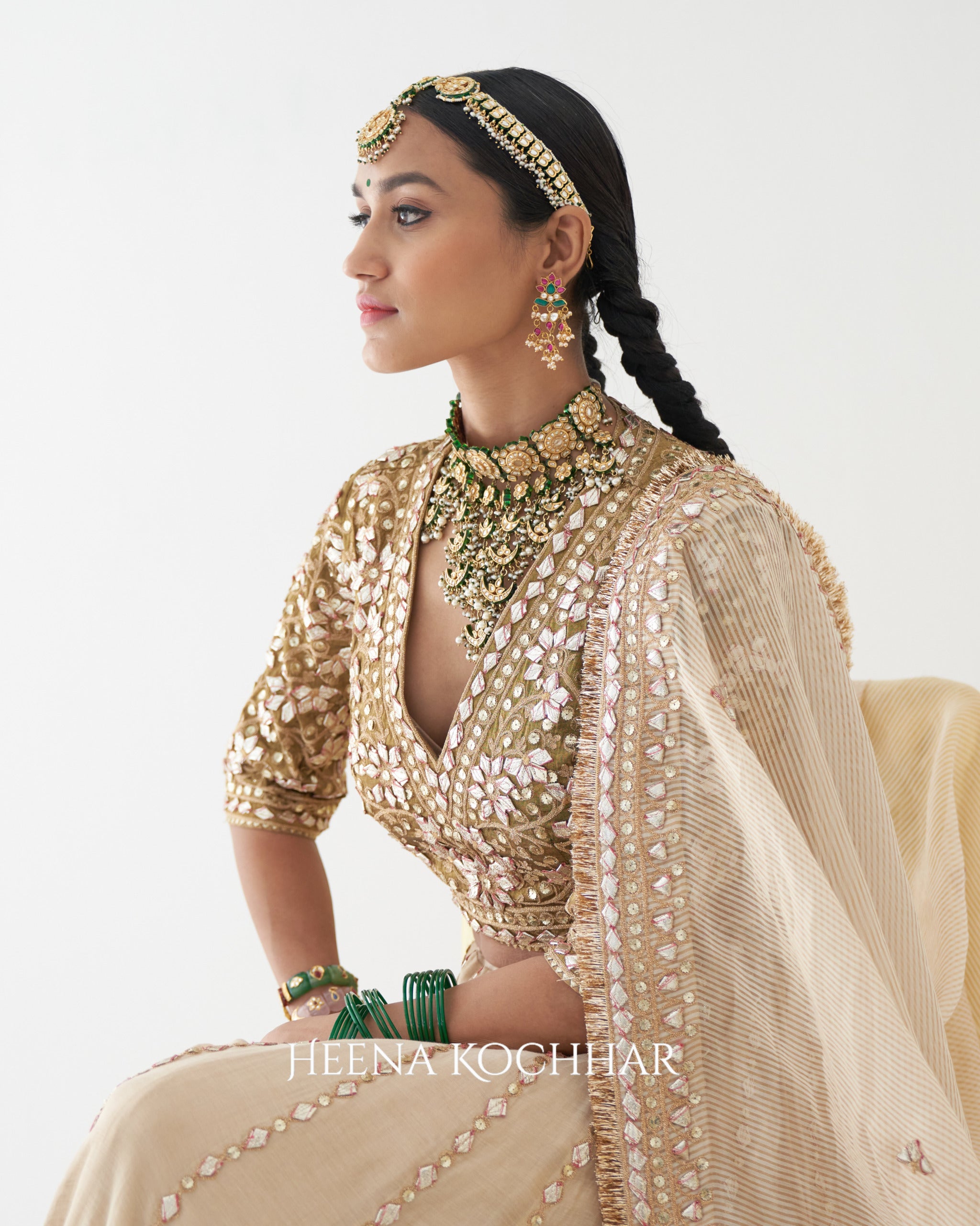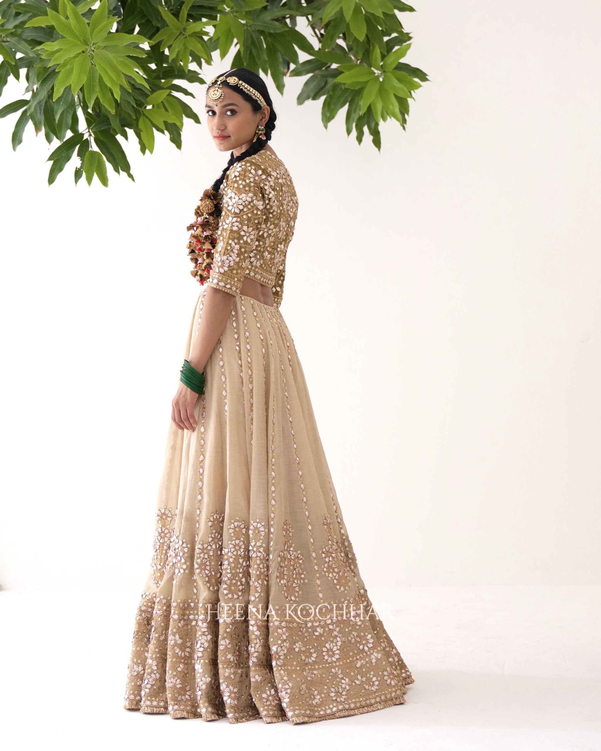 BOTTOM: Handloom tissue soft beige gold lehanga with drawstring waist and gold and silver gota ari emb