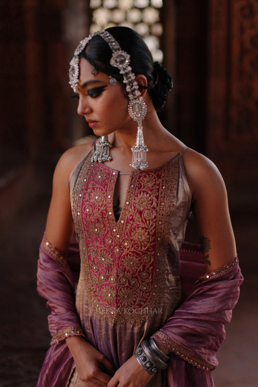 KURTA: Pure Antique Tissue Kalidaar BOTTOM: Wine Mashroo Salwaar ODHANI: Wine Tissue EMBROIDERY: Zari Dori NO. OF COMPONENTS: 3pc- From Rs. 60,500.00