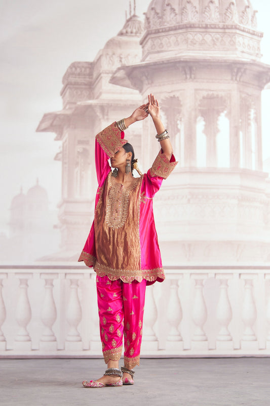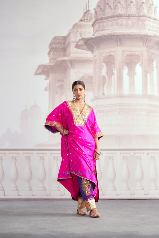 KURTA: Rani Pure Silk Kaftan BOTTOM: Purple Pure Silk Salwaar EMBROIDERY: Gota Ari NO. OF COMPONENTS: 2 pc- From Rs. 41,400.00